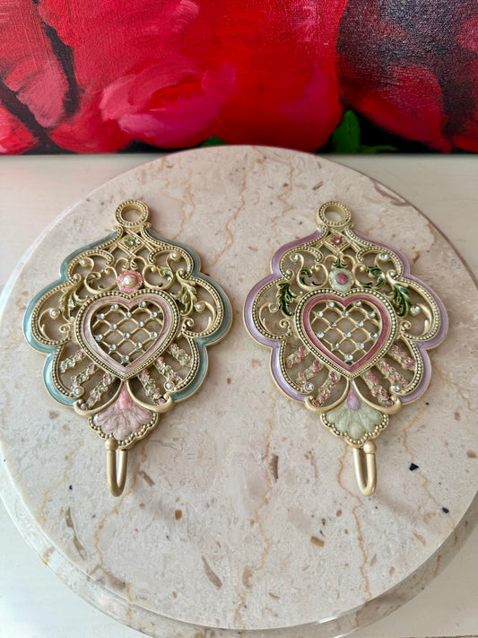 Two Victorian Style Enamel Kitchen Decor Vintage Wall Hooks with Pearls, Crystal and Rhinestones (2 pcs)