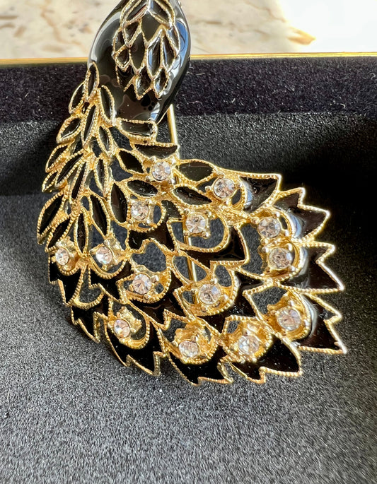 Beautiful Peacock Vintage Brooch Black and Gold Tone with Rhinestones