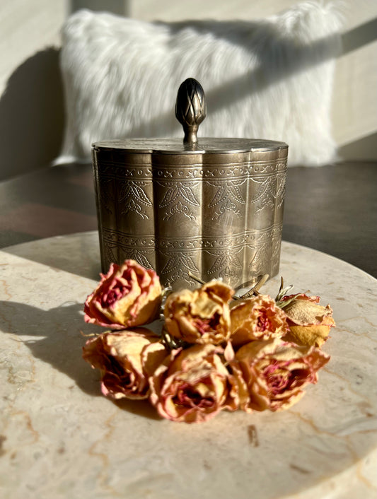 Elaborately Etched Vintage Silver Plated Trinket Box/ Jewelry Box with Scalloped Edge, Oval Shaped - Made in Hong Kong