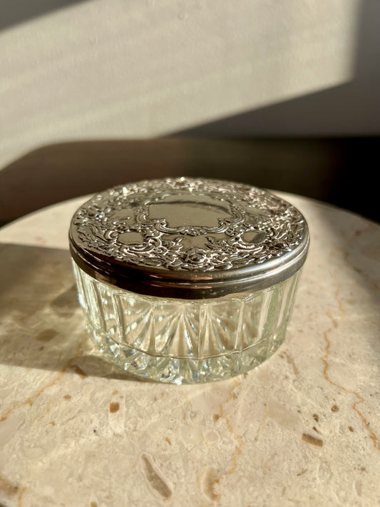 Vintage GODINGER Glass Powder Jar Ornate with Heavy Silver-plated Lid on the Top & Mirror