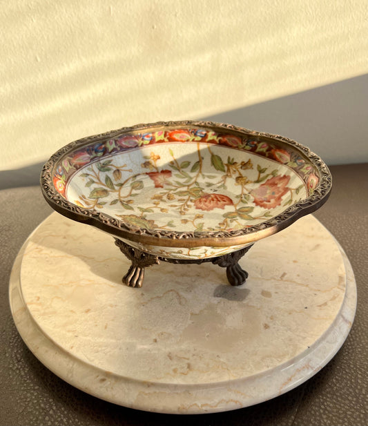 Hand Painted Vintage Floral Decor Chinese Porcelain Bowl with Ornate Brass Claw Feet