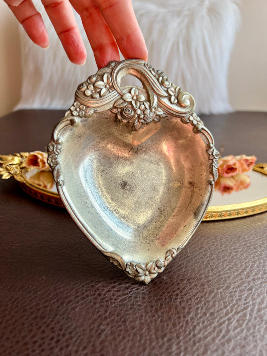 Italian Style Silver Plated Metal Heart Shaped Vintage Change Dish, Bon Bon Dish or Jewelry Holder