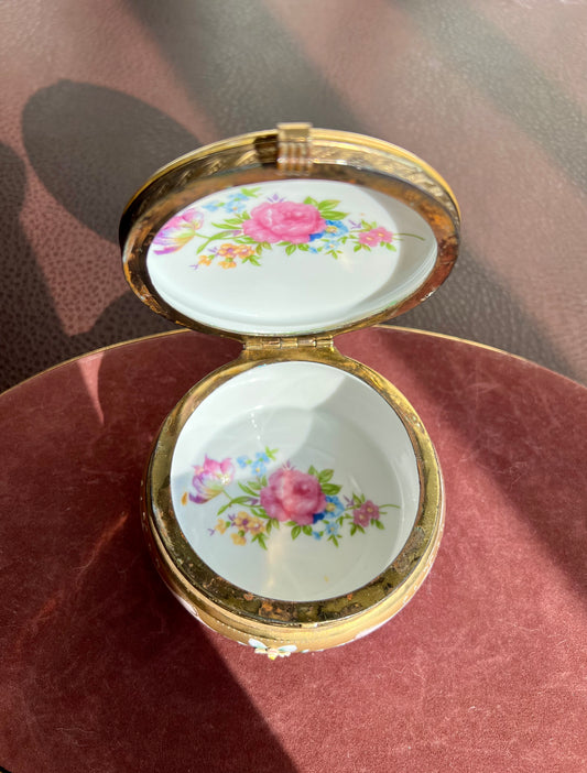 Vintage or Antique Porcelain Trinket Box with Hinged Lid & Applied Flowers and Gold Trim