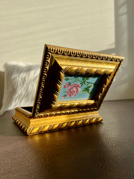 Florentine Style Vintage Gilded Wooden Jewelry Box with Tapestry Flower Decoration on Top Lid, Black Plush Lining Inside