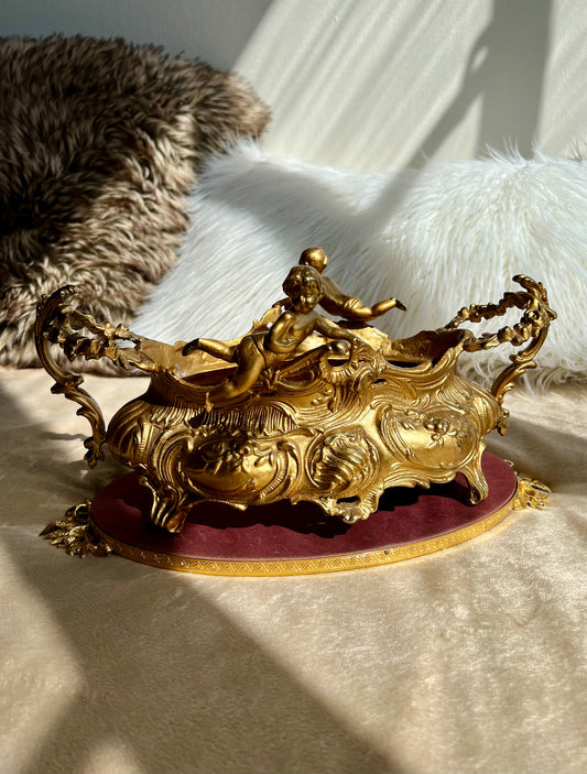 French Art Nouveau Vintage Brass Jardiniere Planter With Two Cherubs