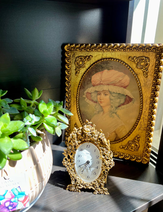 Vintage Gilded Wooden Framed Art, French Paper Portrait of a Victorian Lady with Hat