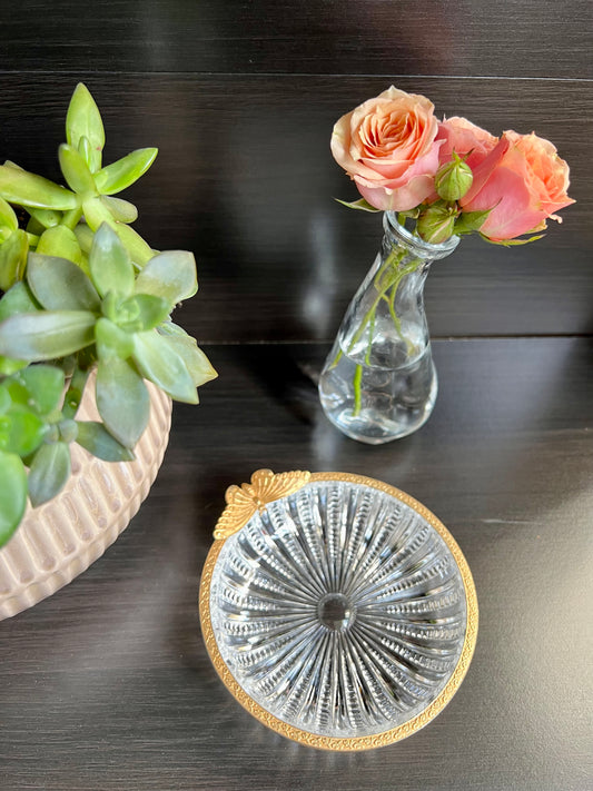 French Cut Crystal Glass Vintage Trinket Dish with Gilt Rim and Butterfly