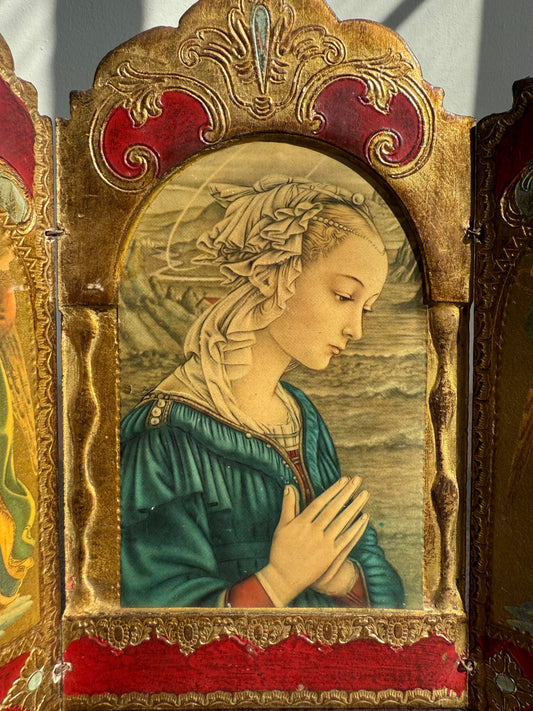 Florentine Religious Vintage Triptych with a Printed Image of a Praying Madonna, Gilt and Wood, Made in Italy