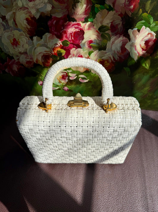 Italian RODO White Vintage Glazed Wicker Top Handle Purse Stylish Handbag from the 1950s - Made in Italy
