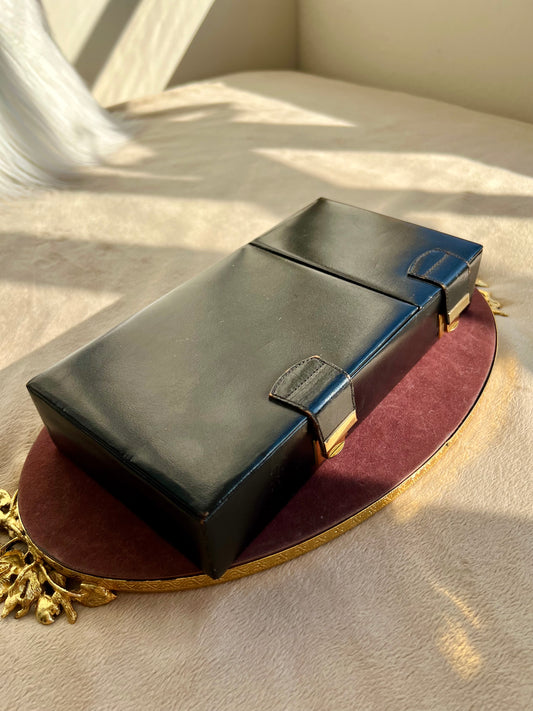 German Vintage Black Leather Griffon Manicure Travel Set & Jewelry Box with Peter Alarm Clock