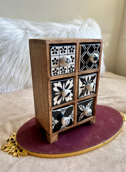 Hand Painted Wooden Chest with Ceramic Drawers and Jewelry Storage
