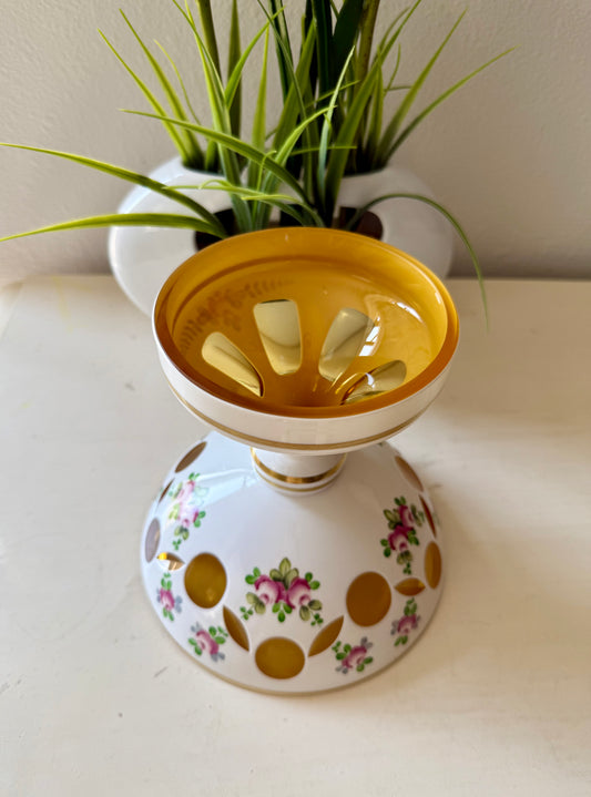 Bohemian Vintage Moser Style Czech Republic Cut Glass Bowl and Floral Painted Candy or Fruit Dish