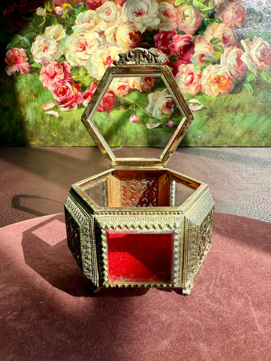 Hollywood Regency Style Vintage Hexagonal Jewelry/ Trinket Box with Red Velvet Interior, Gold-tone Filigree, Heavy Beveled Glass Lid