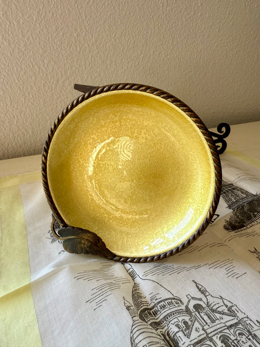 Vintage 1950s Small Yellow Round Guilloche Ashtray, Enamel on Metal Dish/ Plate or Jewelry Holder Tray with Leaf Decoration by Evans