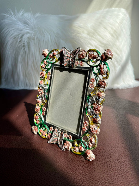 Decorative Vintage Enameled Metal Picture/ Photo Frame with Rhinestoned Butterflies, Dragonflies and Pink Roses