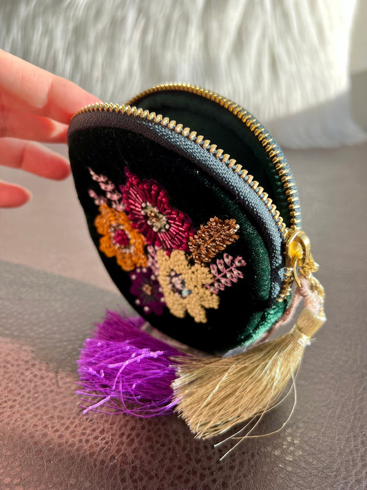 Round Beaded Mini Makeup Case Dark Green Plush Purse/ Bag with Floral Motif Decoration