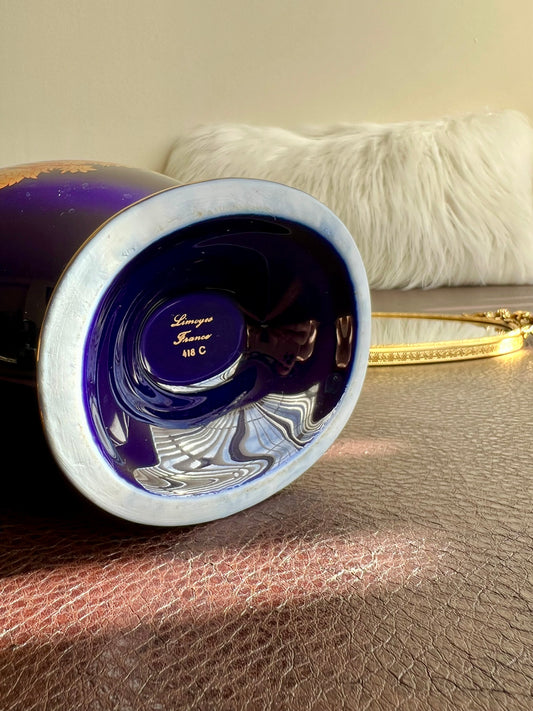 Limoges 22K Gold and Cobalt Blue Decorative Vintage Porcelain Glazed Vase - Made in France