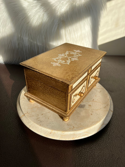 Italian Florentine Vintage Gold Gilt Wood Music and Jewelry Box, Burgundy Red Lining Interior, Footed