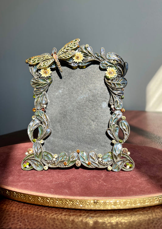 Dragonfly Enamel and Metal Picture Frame with Tiny possible Swarovski Rhinestones, Flowers & Green Leaves