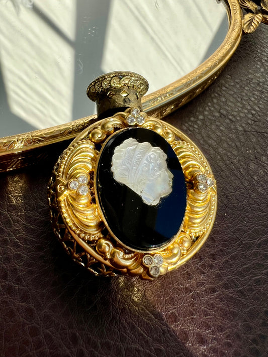 Czech Vintage Small Blue Glass Perfume Bottle with Brass Filigree Overlay Rhinestones and Black Onyx