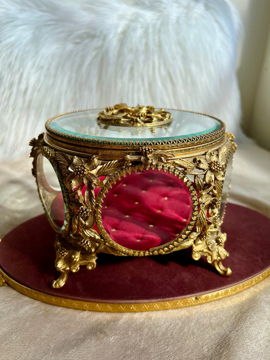 New York StyleBuilt Vintage Jewelry or Trinket Box, Oval Shaped Glass Lid with Ornate Gold Rose