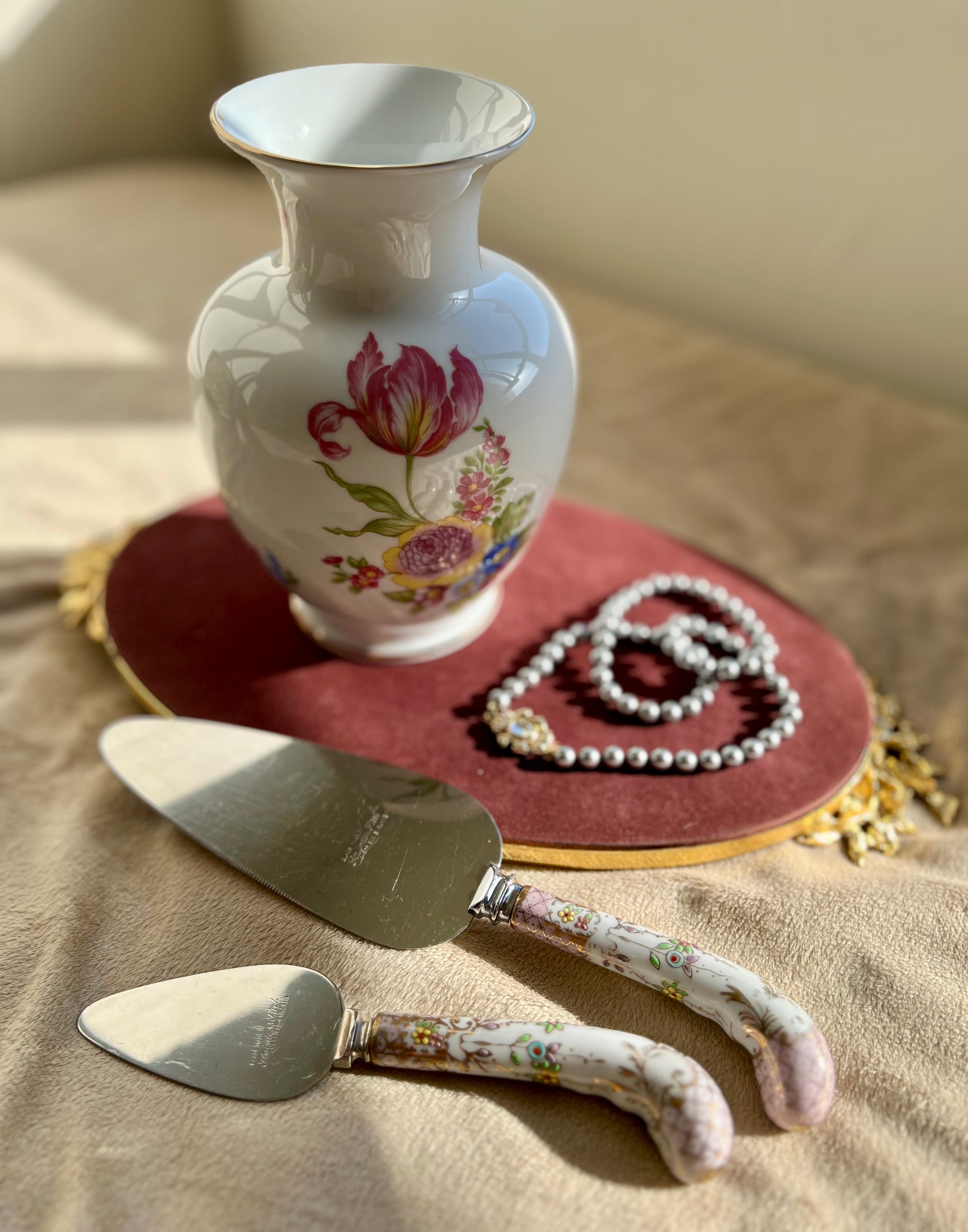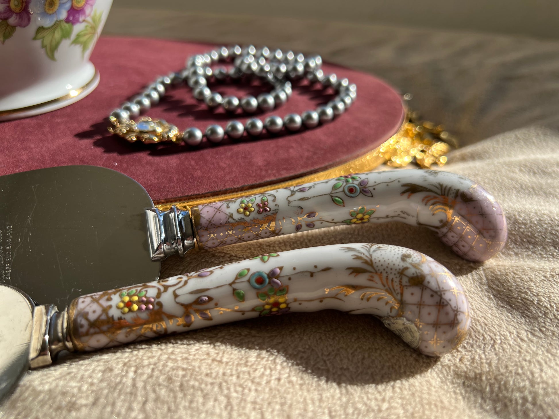 Beautiful Vintage Matching Set of two Hand Painted Sheffield England Porcelain Handle Servers in Floraine Pink and Gold Pattern. Very good condition.