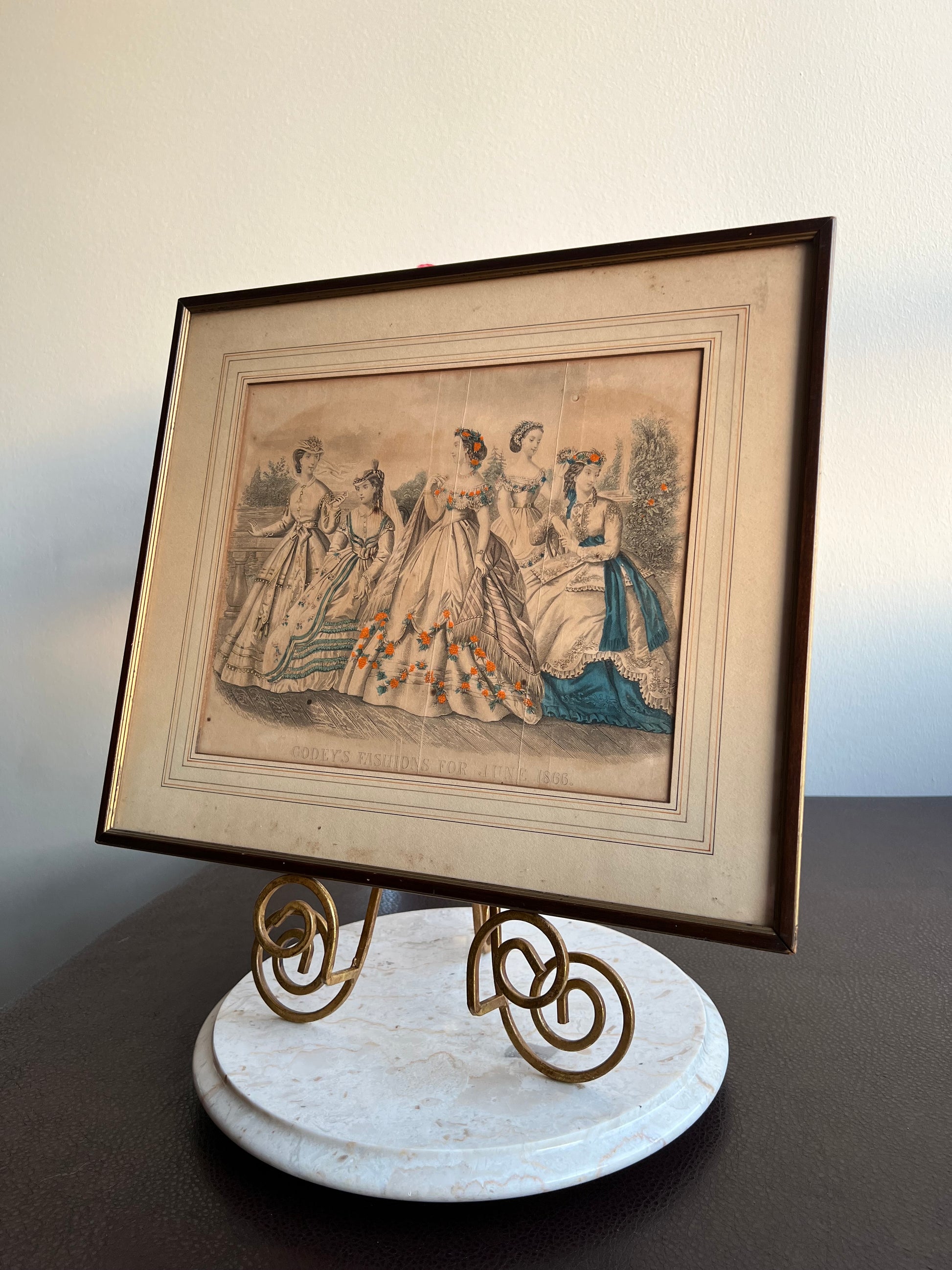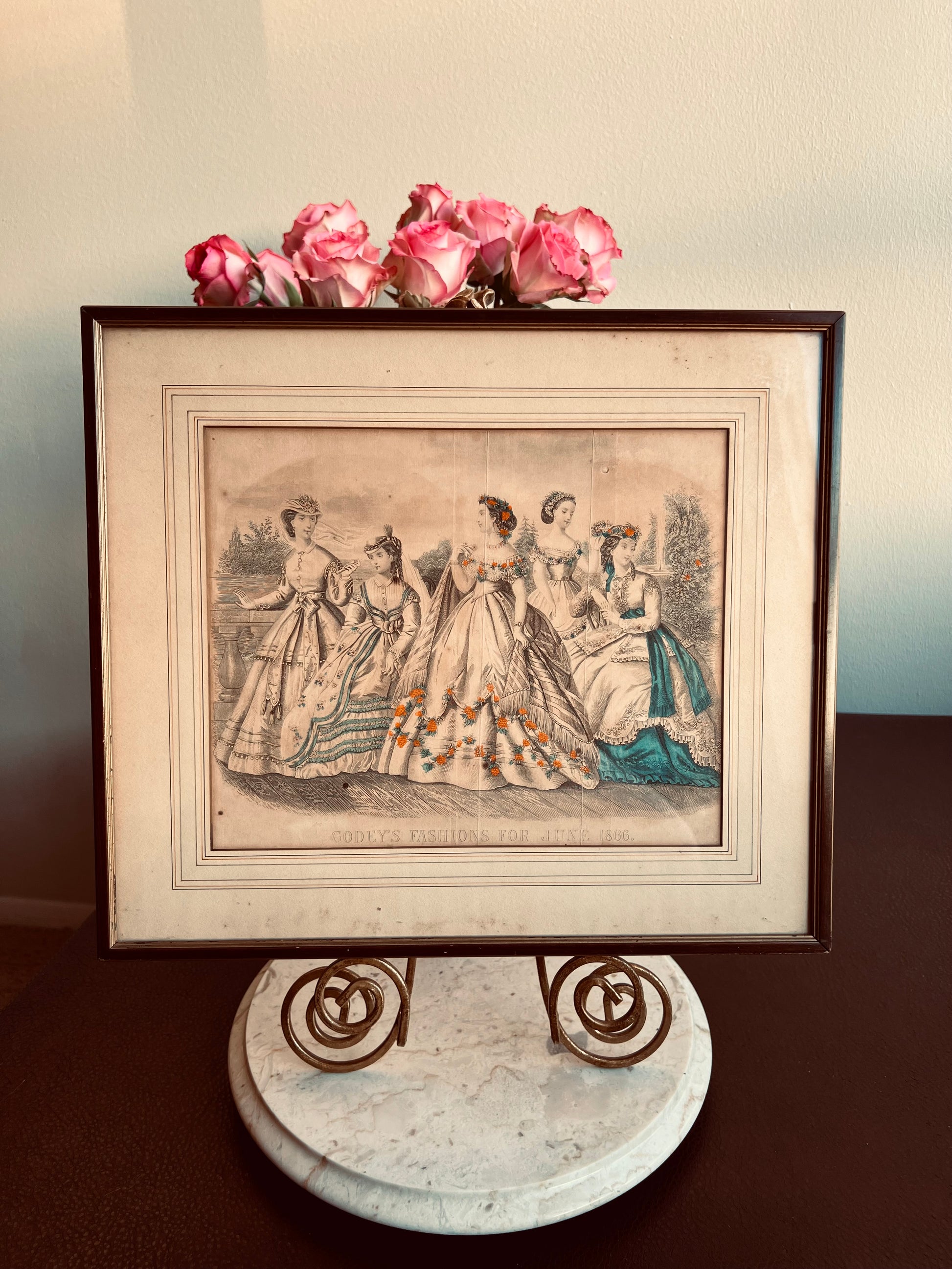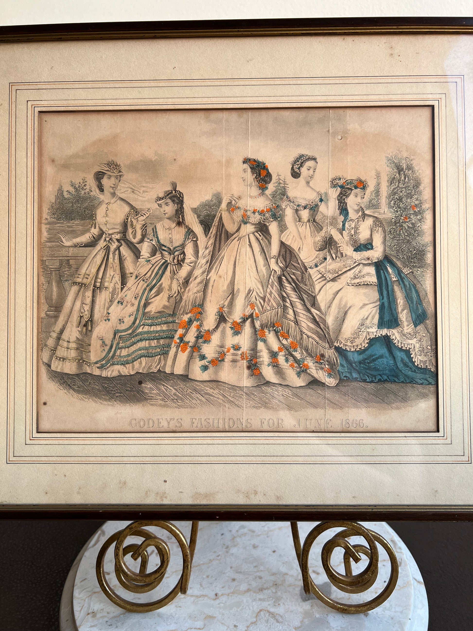 Beautiful antique framed Victorian Godey's Fashion picture for June 1866 fashion. Due to its age, one or two small spots are visible in the picture, but otherwise it is in very good vintage condition.