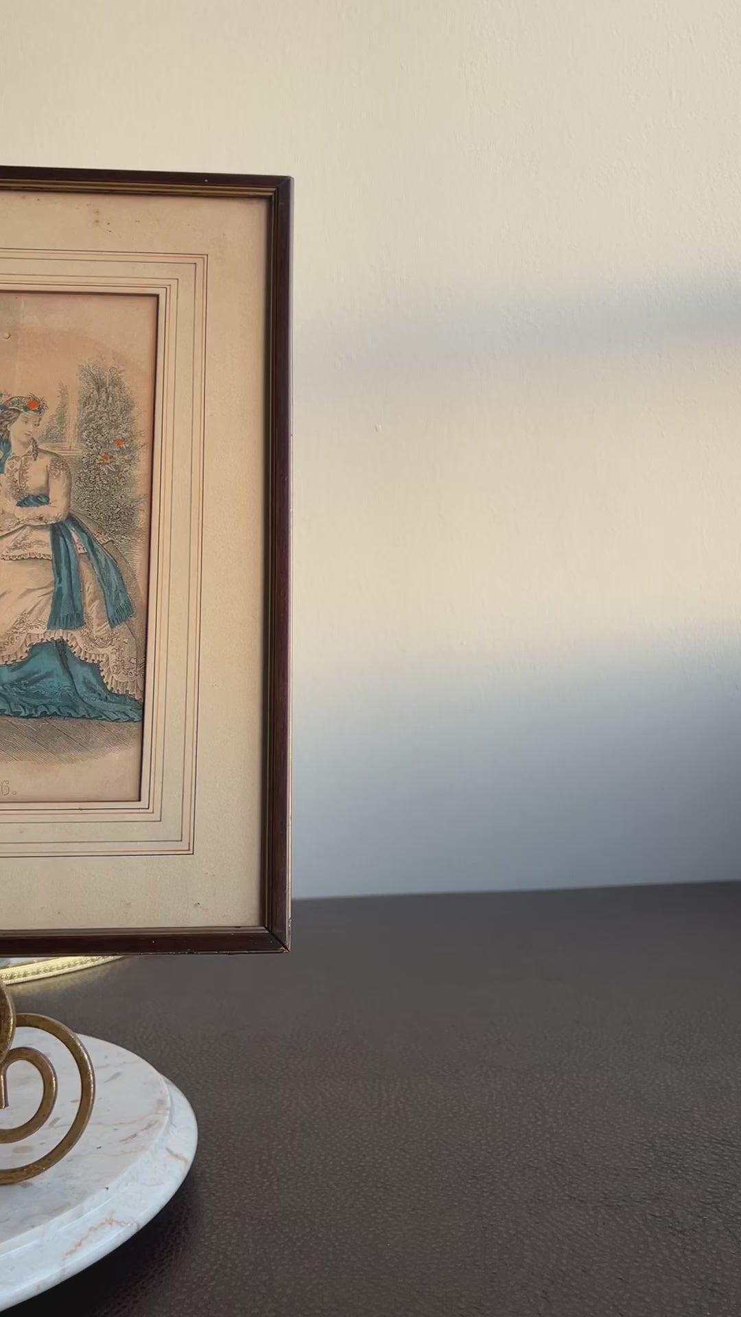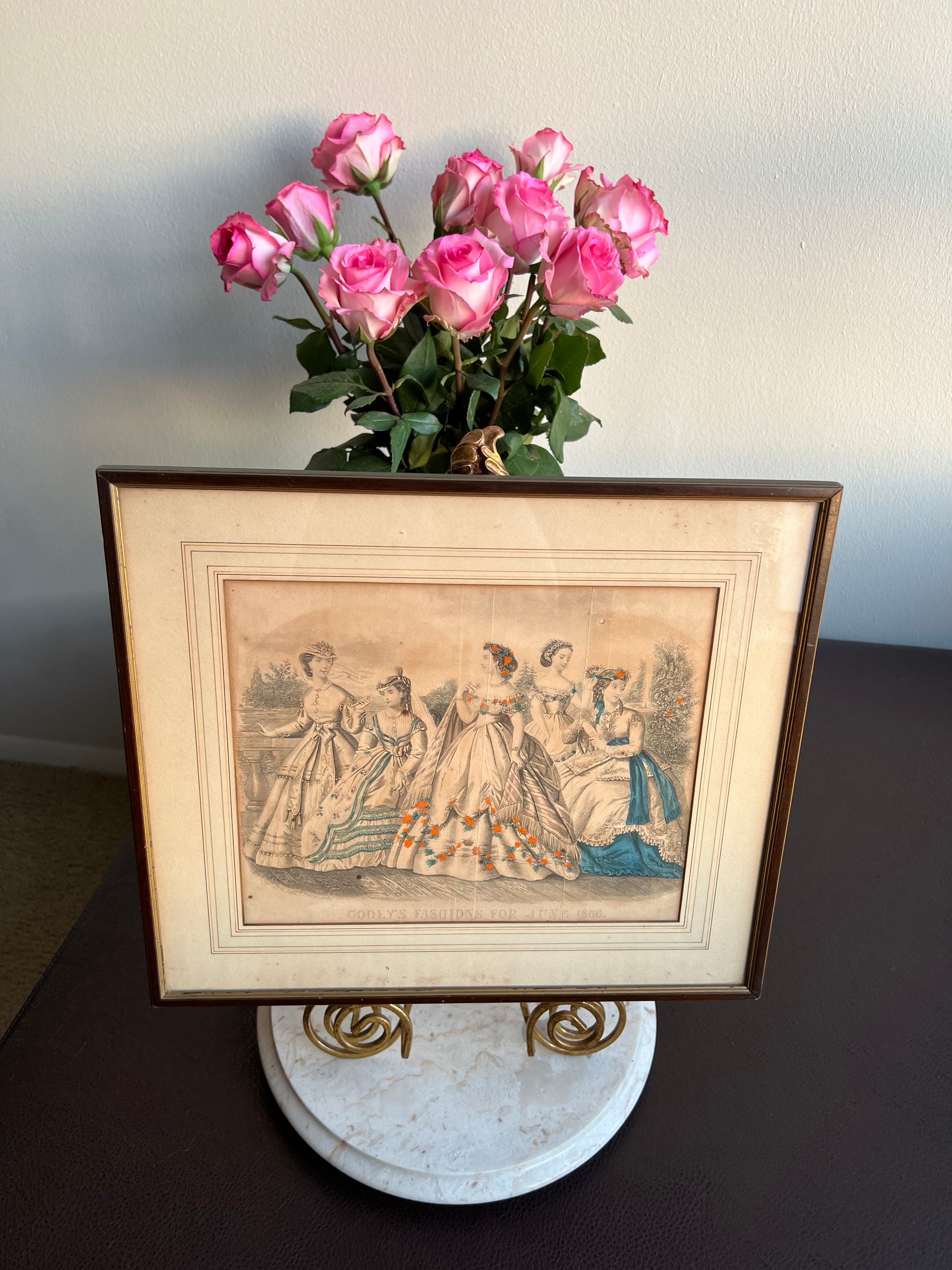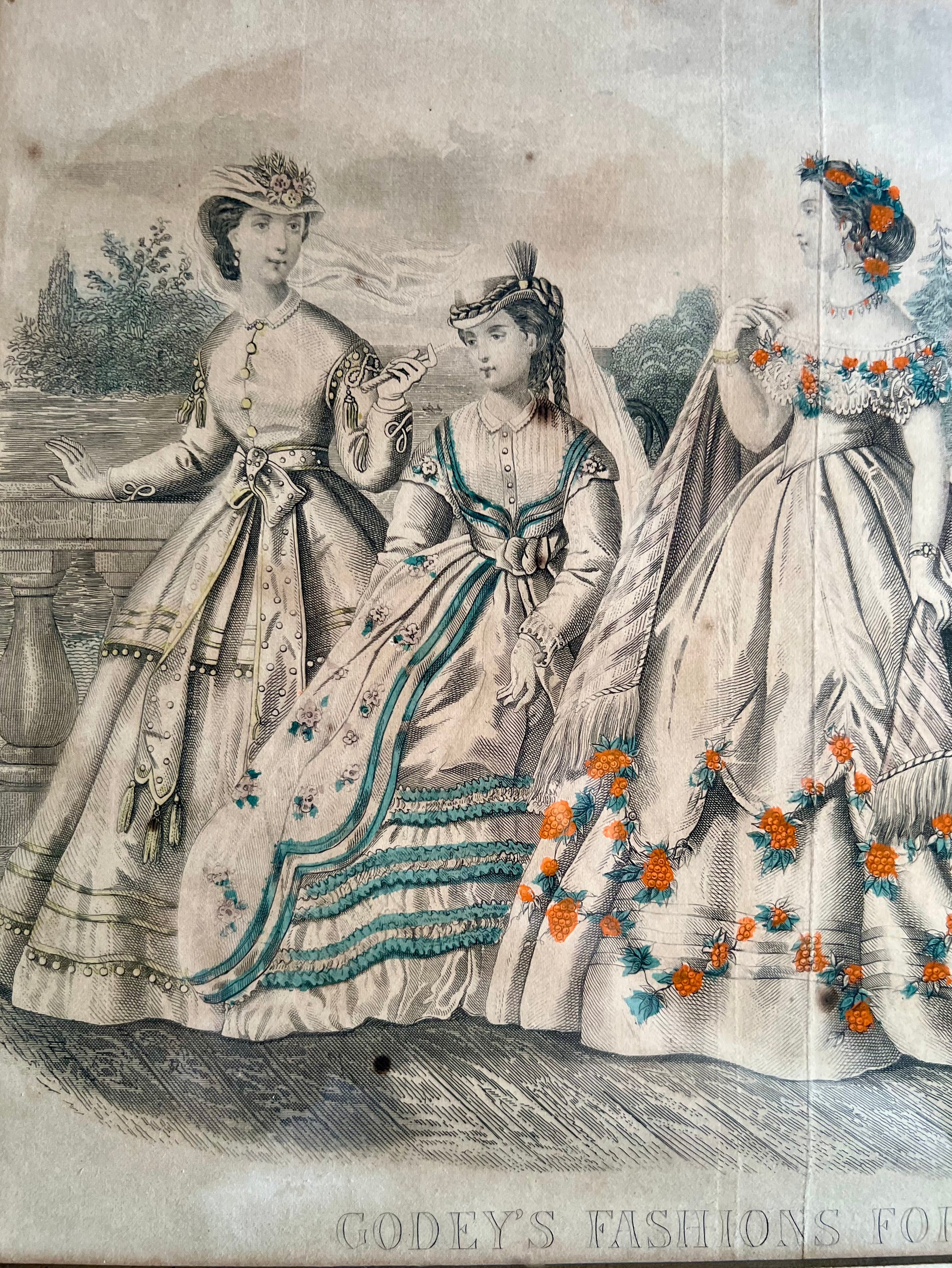 Beautiful antique framed Victorian Godey's Fashion picture for June 1866 fashion. Due to its age, one or two small spots are visible in the picture, but otherwise it is in very good vintage condition.