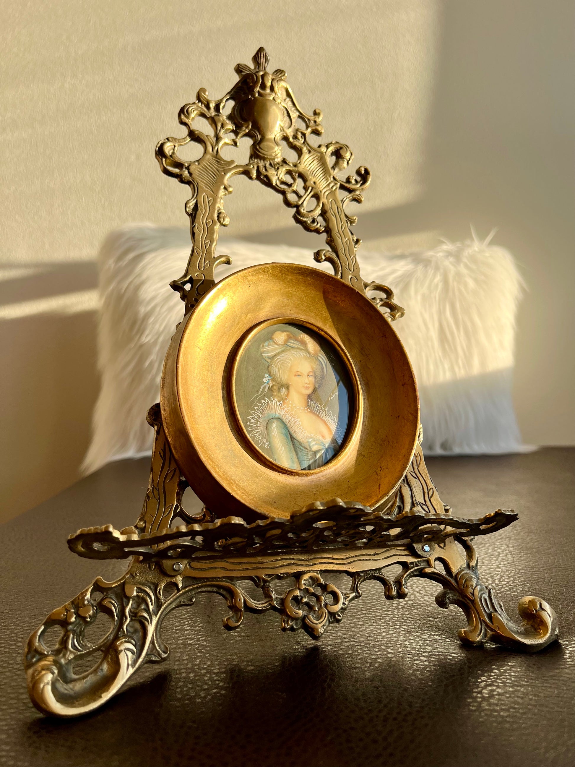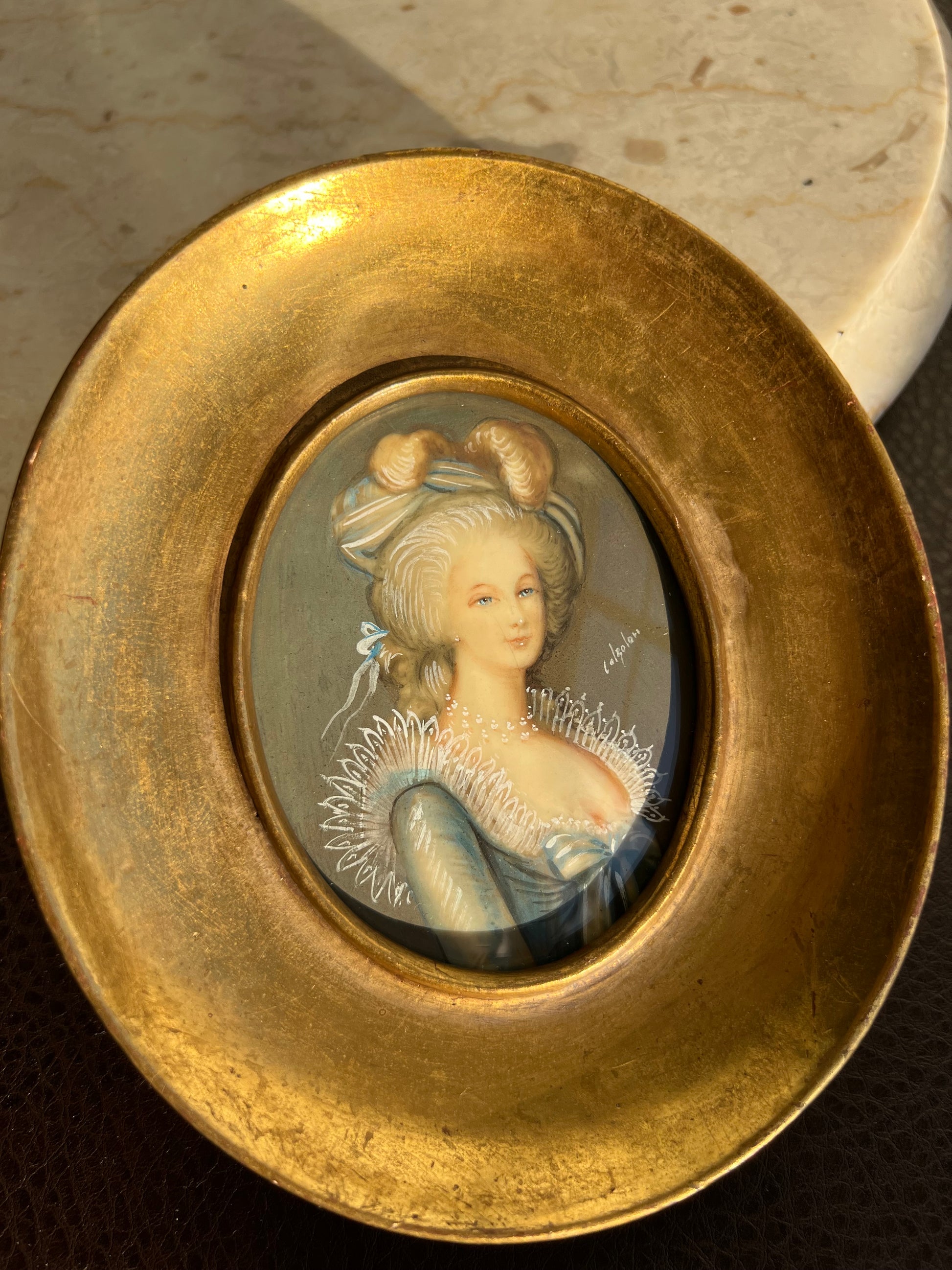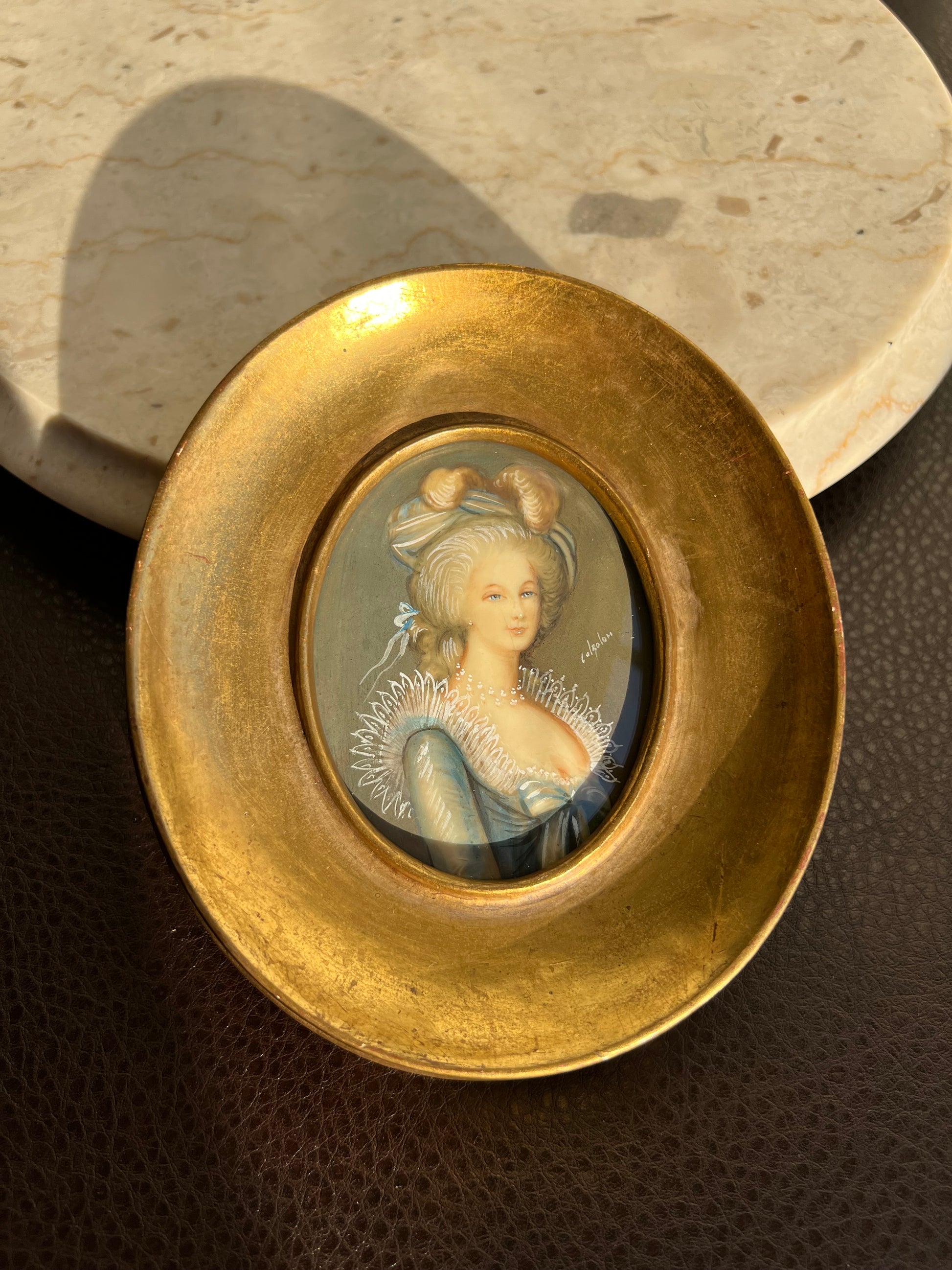 Antique/ Vintage Italian Miniature Oval Gilded Wooden Framed Original Art, Signed Painting Portrait Of Royal Lady Wall Decor