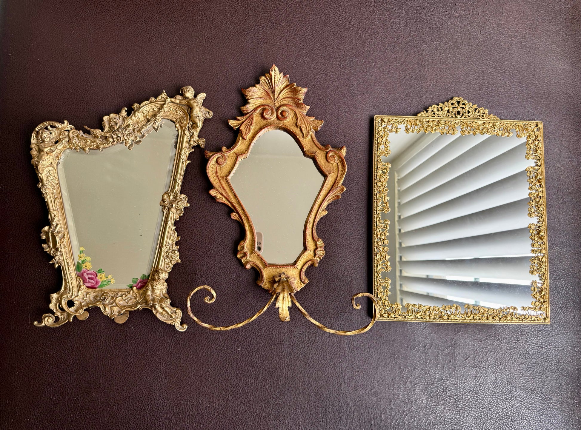 There is a small chip on the top left side of the mirror surface right next to the frame, but it is not that noticeable. Due to the age of the product, there is slight wear on the gilded surface of the frame in some places, and there are a few small scratches on the mirror, which are also barely noticeable.