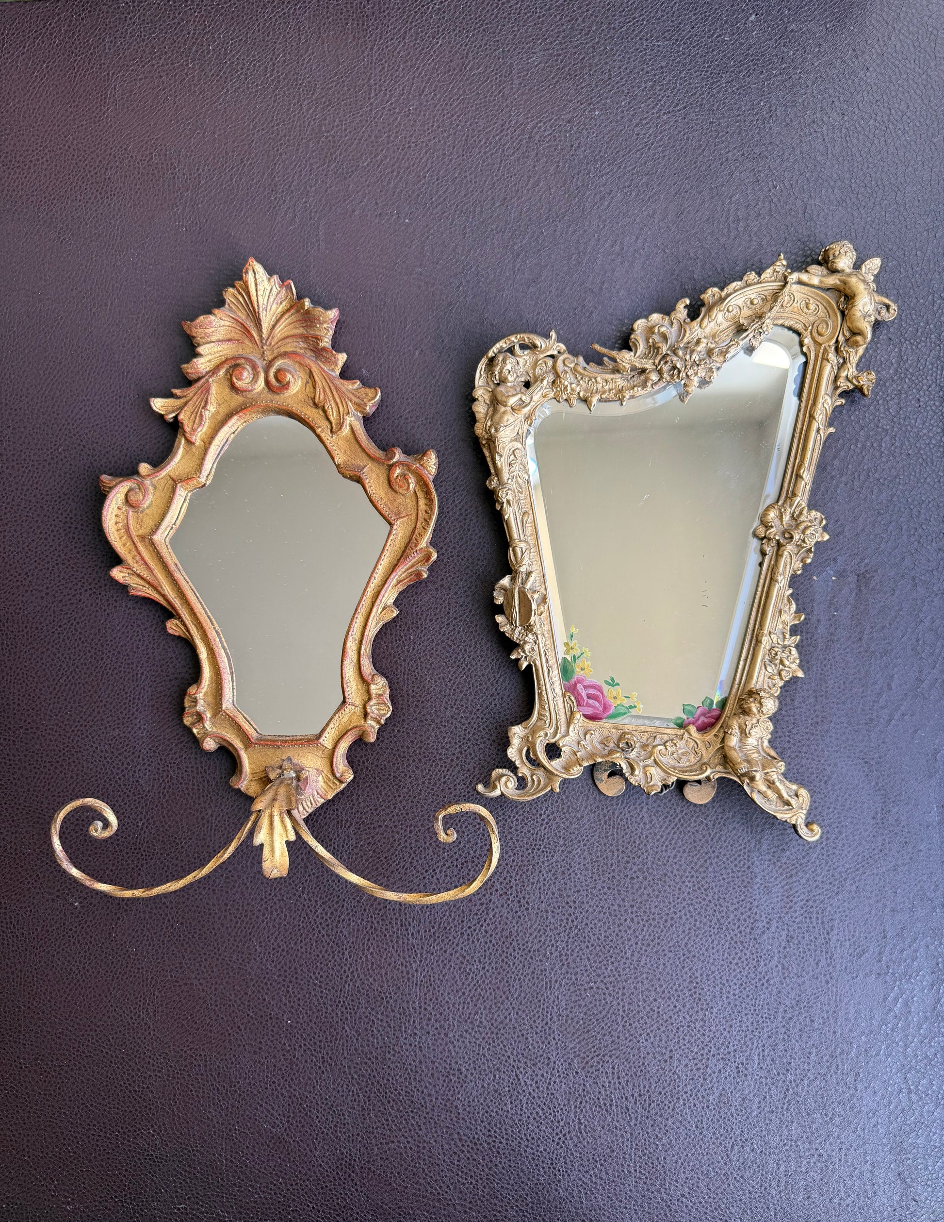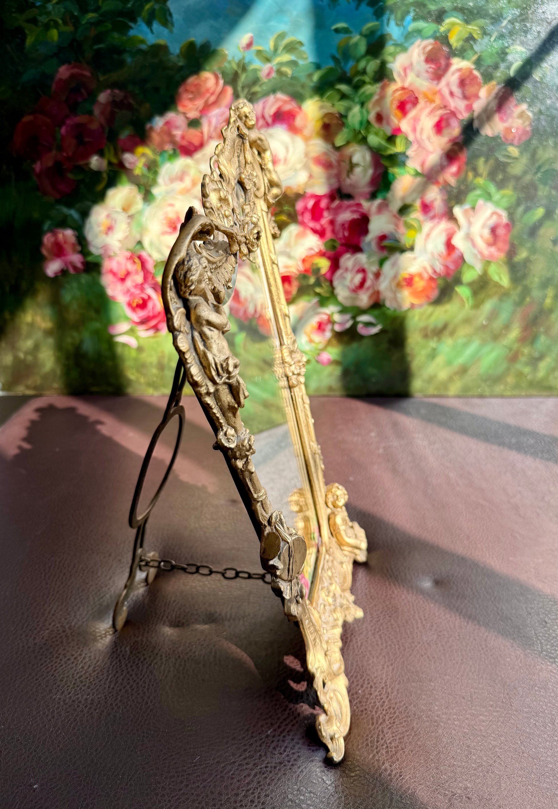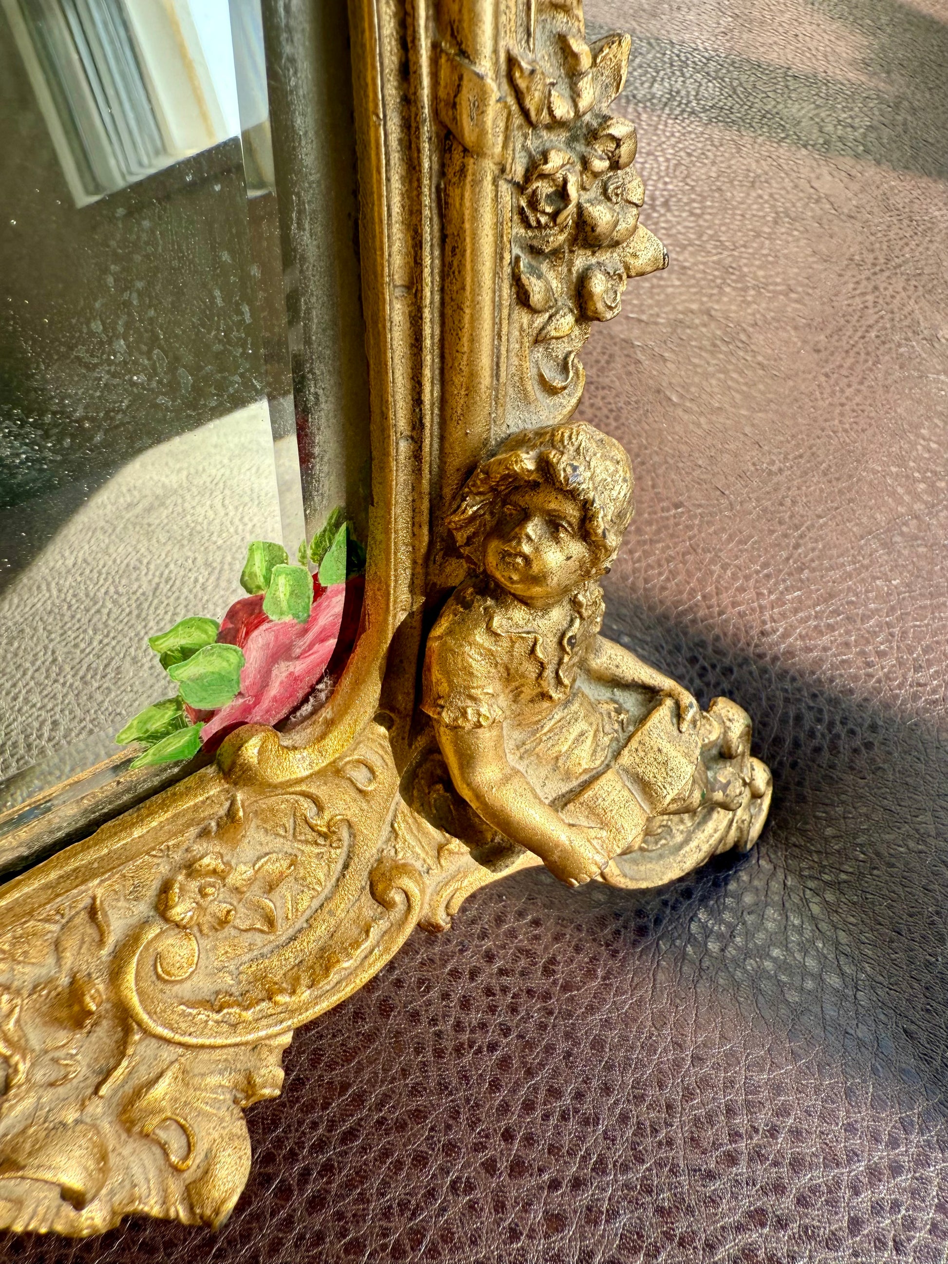 Beautiful antique Italian Rococo-style table mirror with gilded frame, featuring putti (cherubs) decor and floral painting on the mirror. It’s in very good vintage condition.