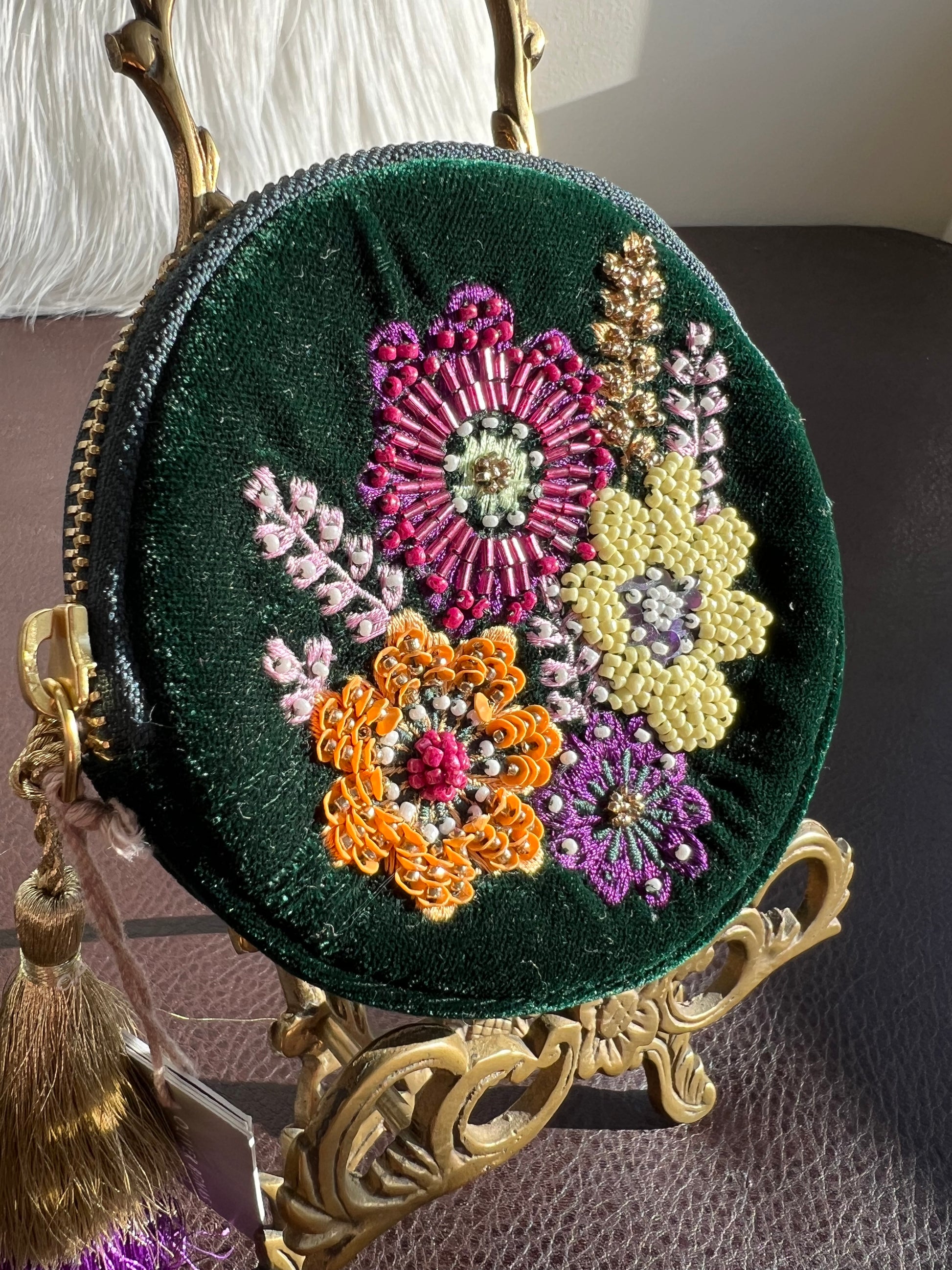 Beautiful “Oliver Bonas” tagged, beaded round makeup case mini dark green plush purse/ bag with floral motif decoration. It’s in excellent vintage condition. Never used.