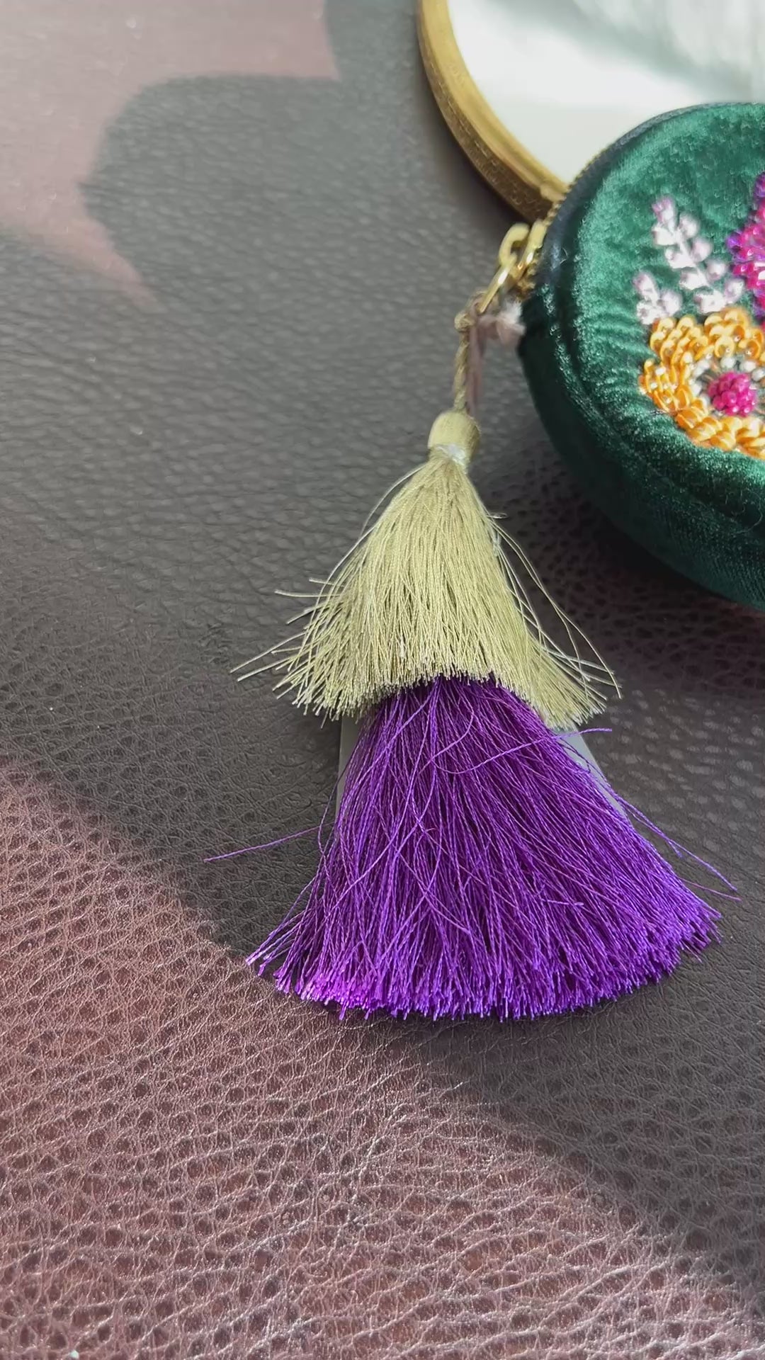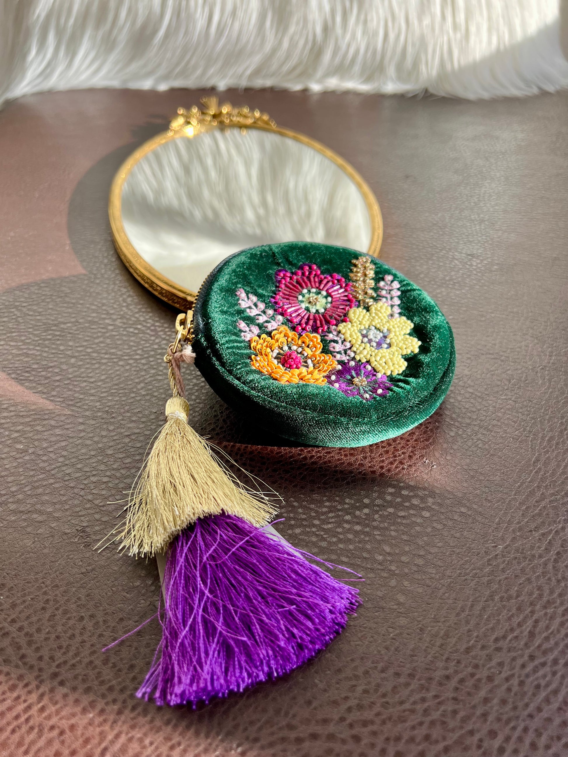 Round Beaded Mini Makeup Case Dark Green Plush Purse/ Bag with Floral Motif Decoration