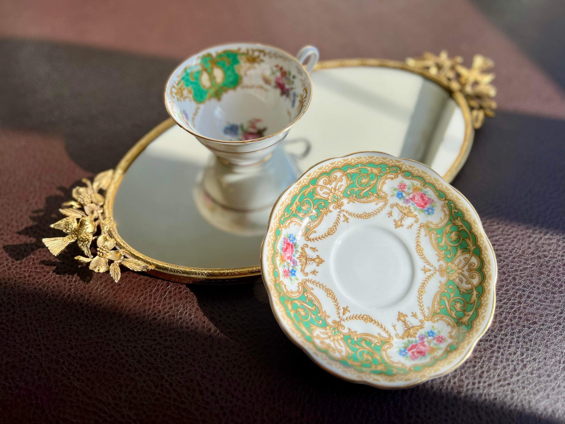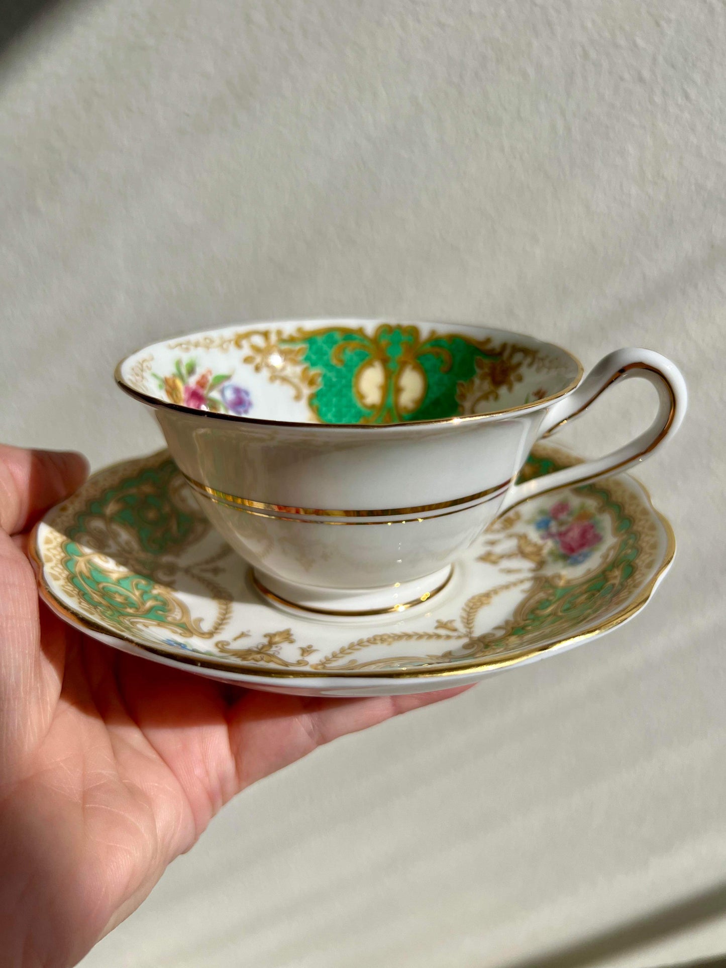 Vintage England Regency Queen Anne Gold Trim Bone China Green Floral Tea Saucer & Cup