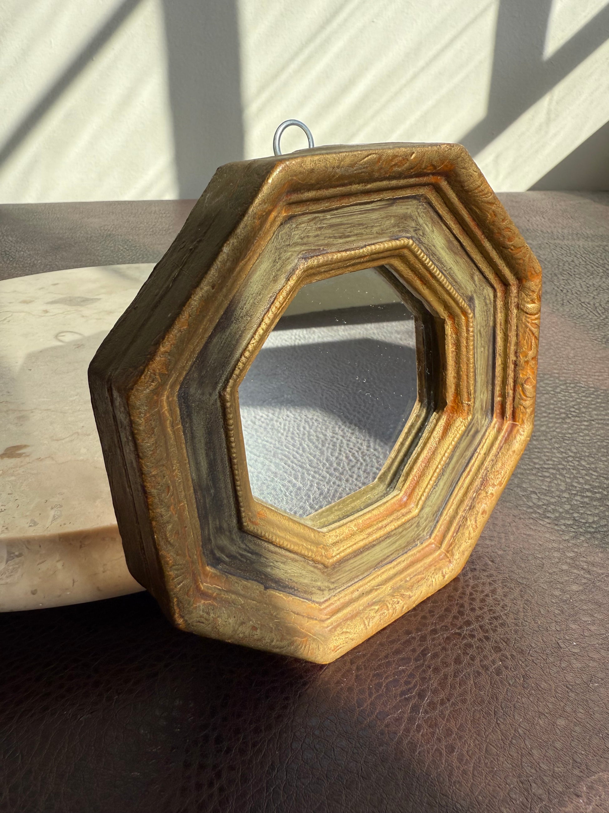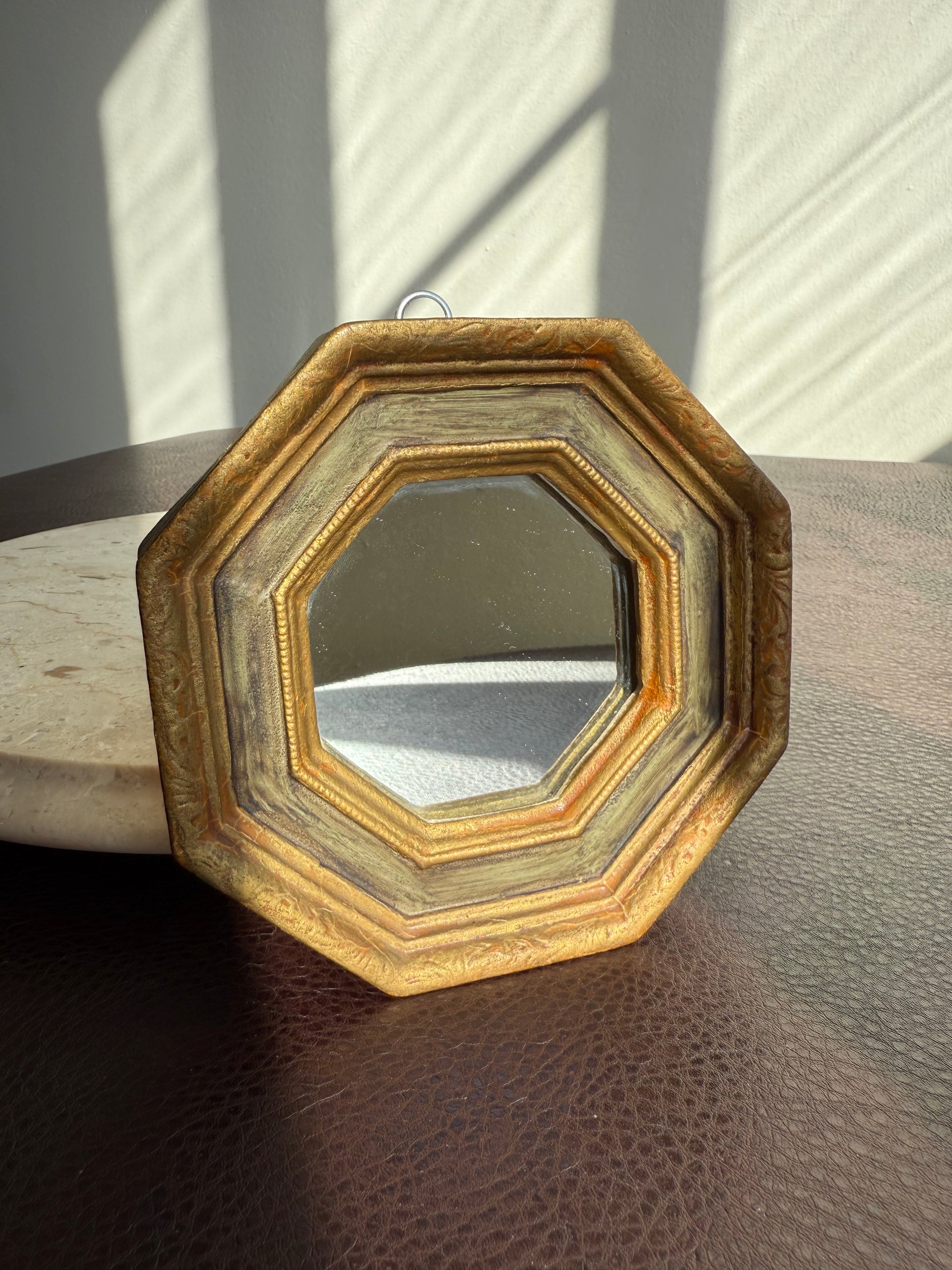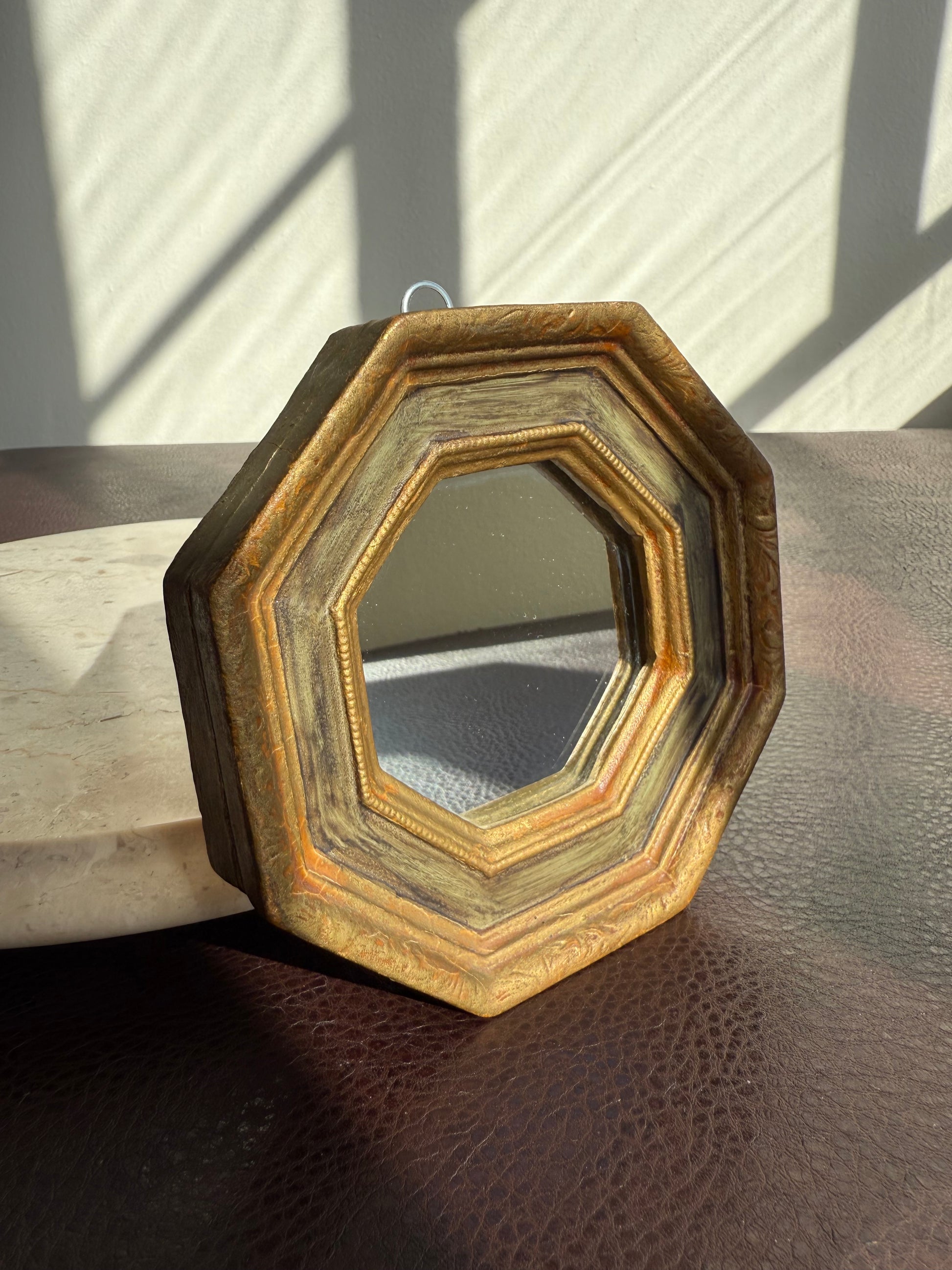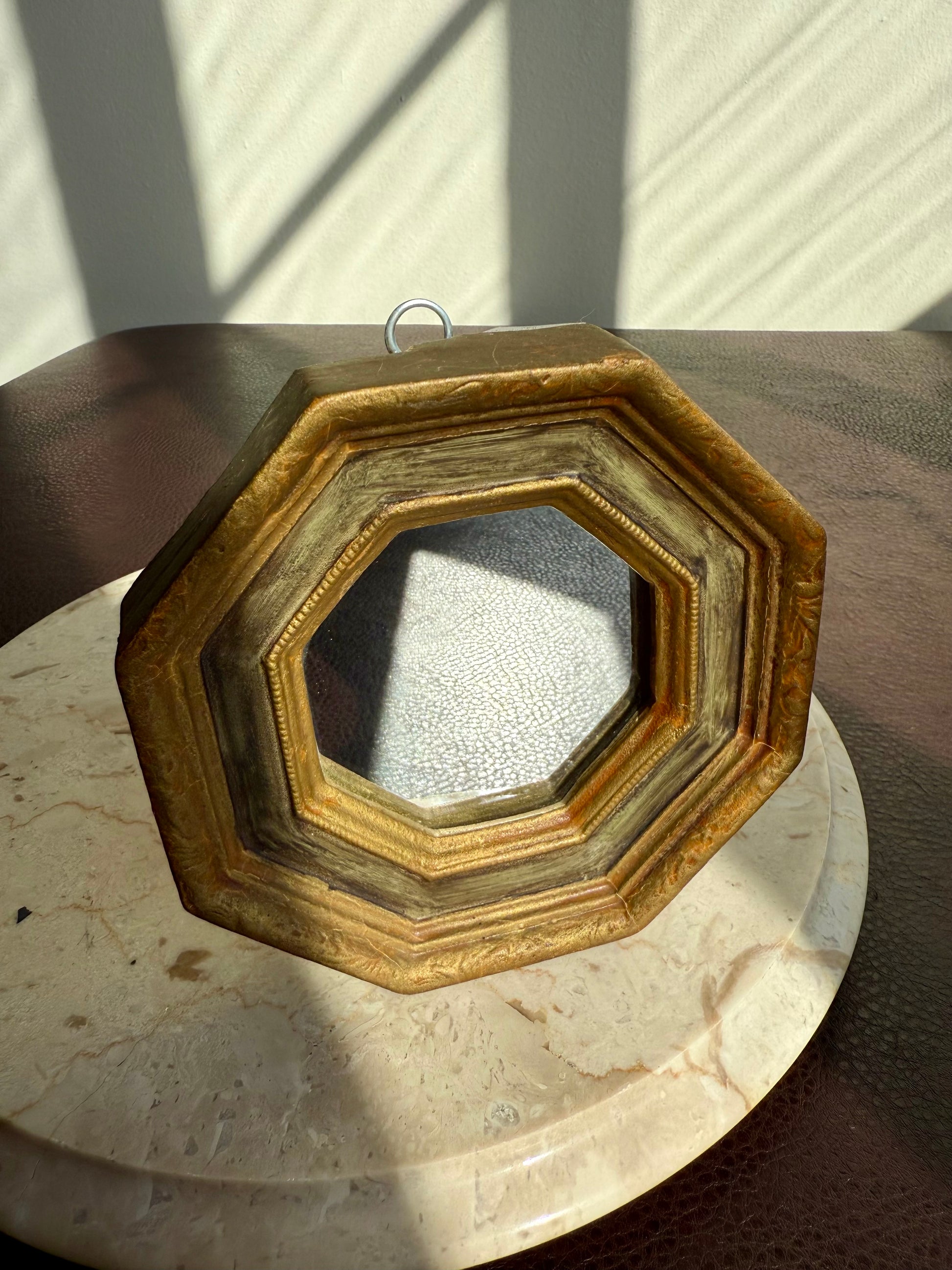 Italian Florentine gold gilded wooden framed mini octagon vintage wall mirror. It’s in very good vintage condition. There are minor signs of wear on the wooden surface and the back (paper) of the mirror due to the age of the product, but these are almost barely noticeable. Made in Italy.