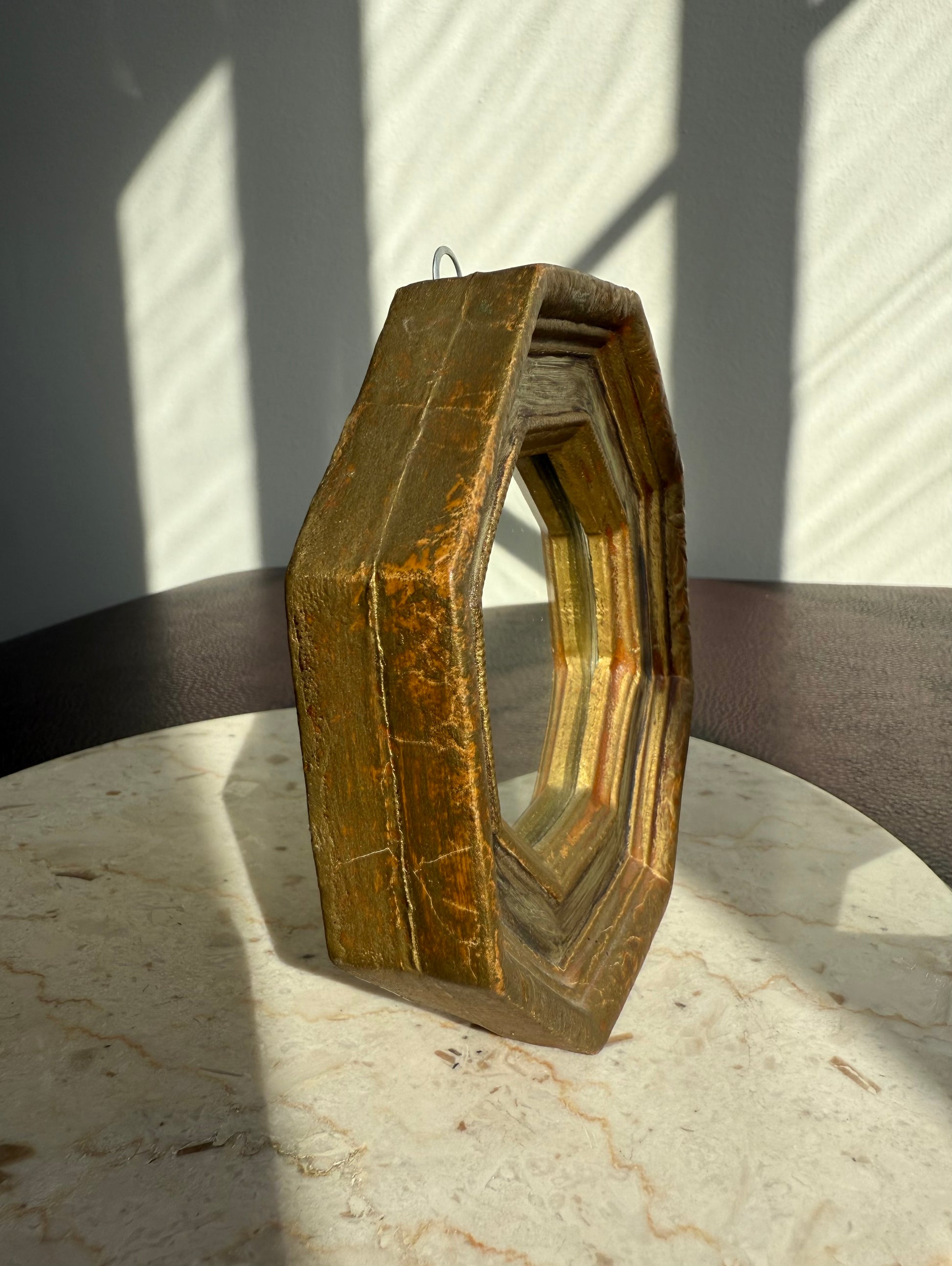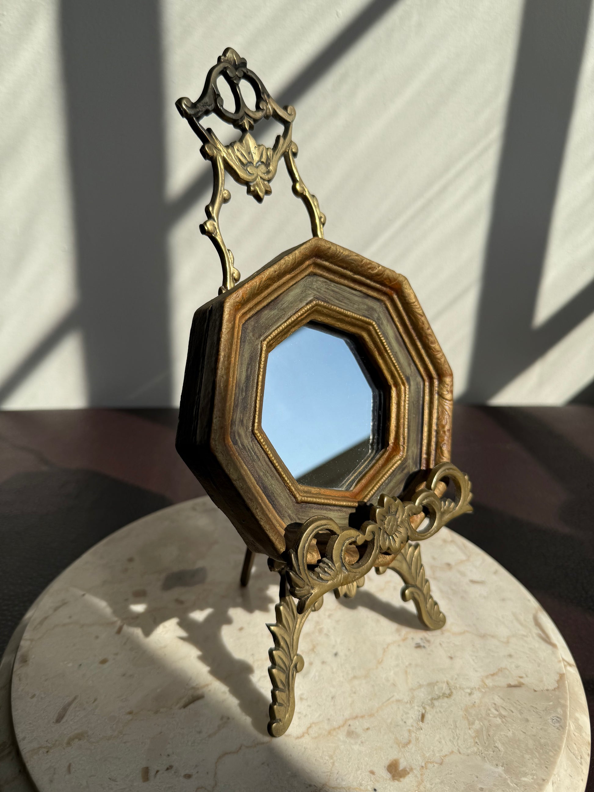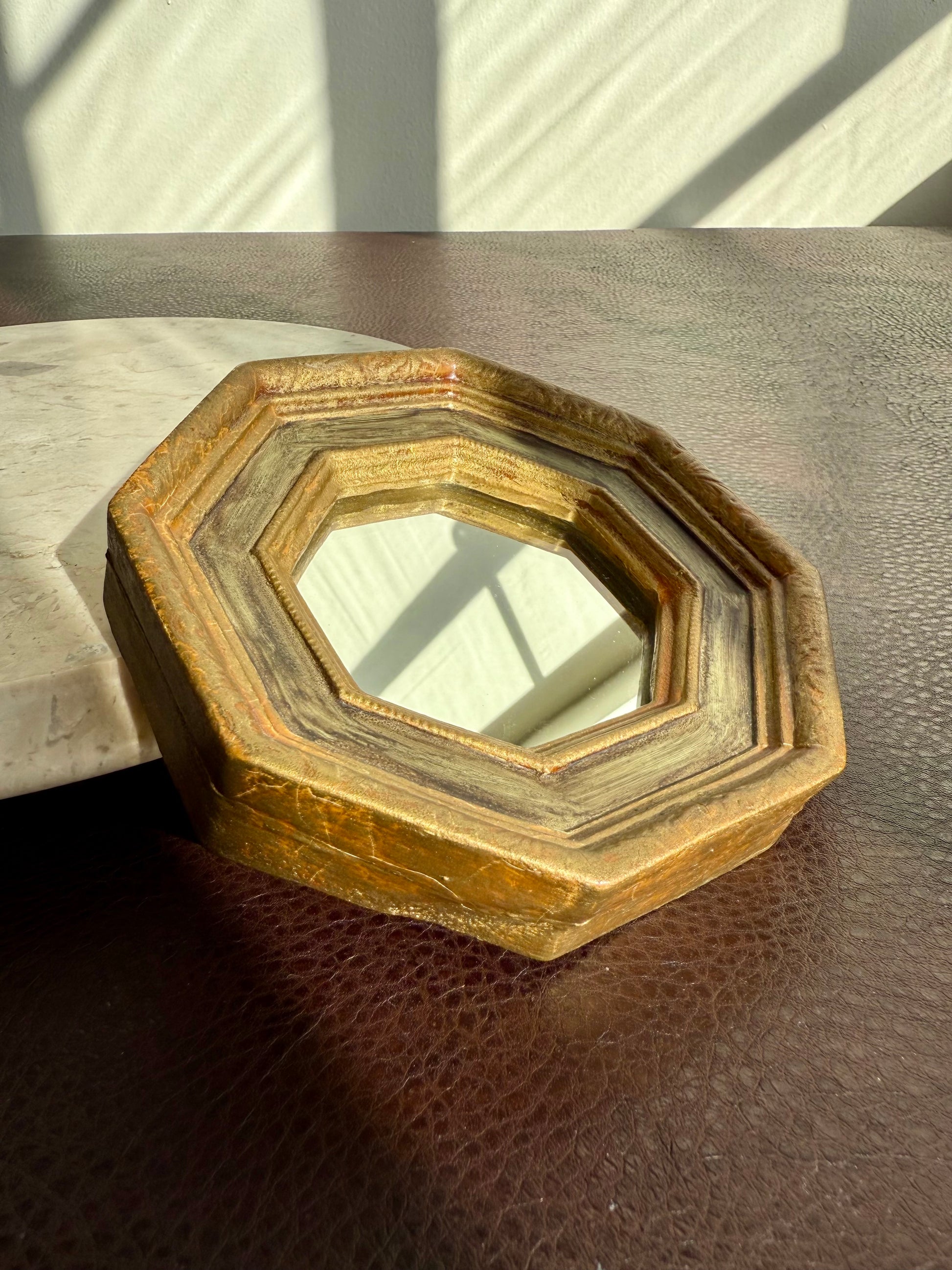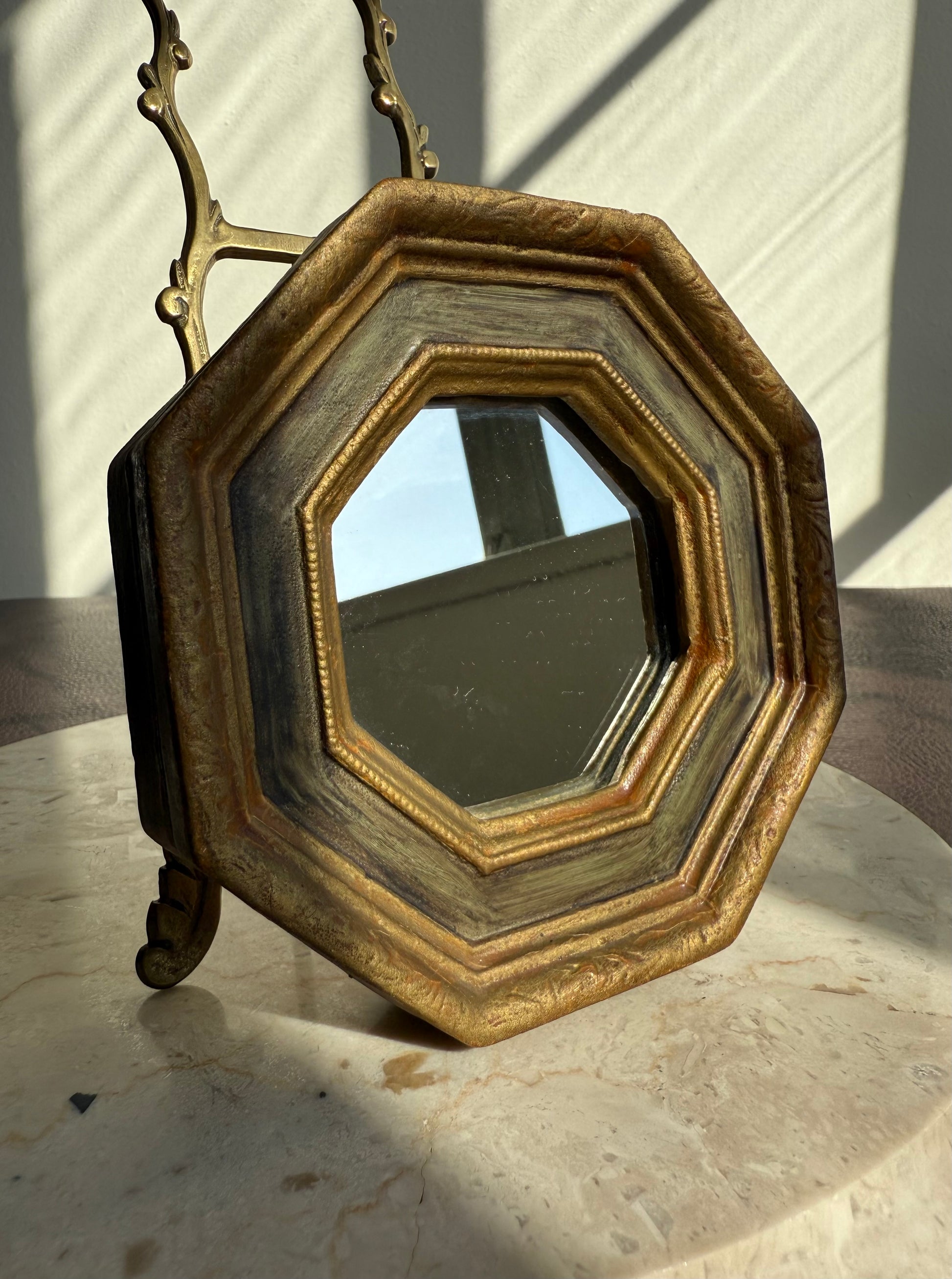 Italian Florentine gold gilded wooden framed mini octagon vintage wall mirror. It’s in very good vintage condition. There are minor signs of wear on the wooden surface and the back (paper) of the mirror due to the age of the product, but these are almost barely noticeable. Made in Italy.