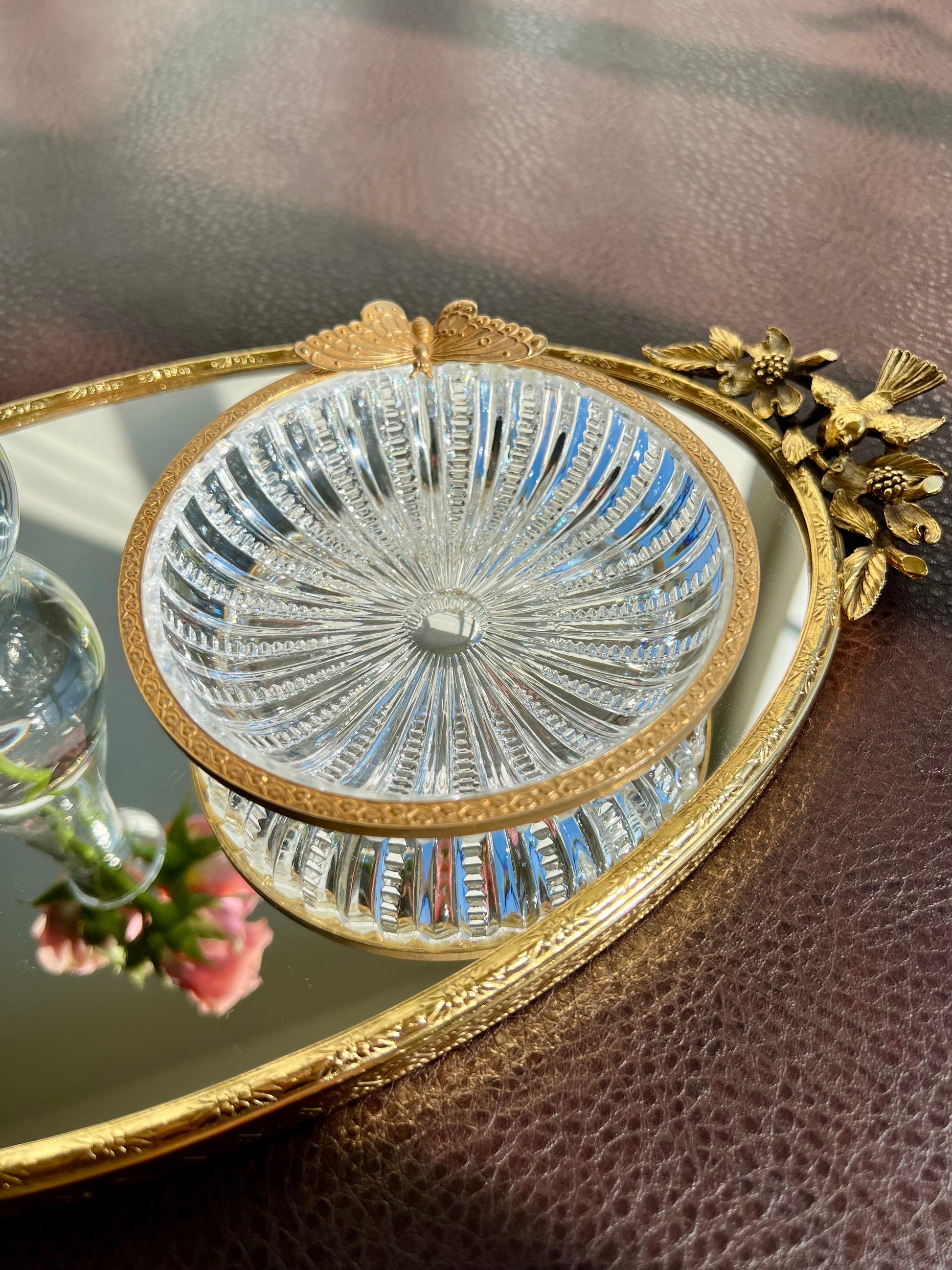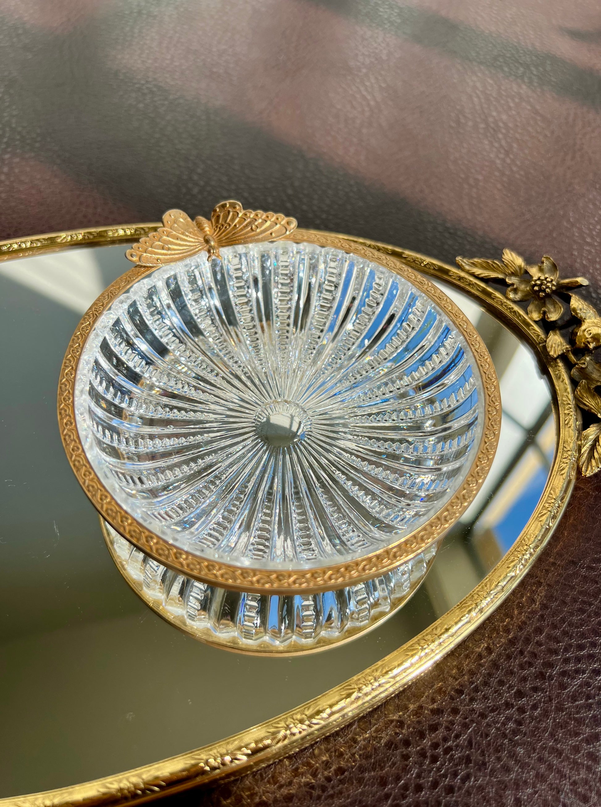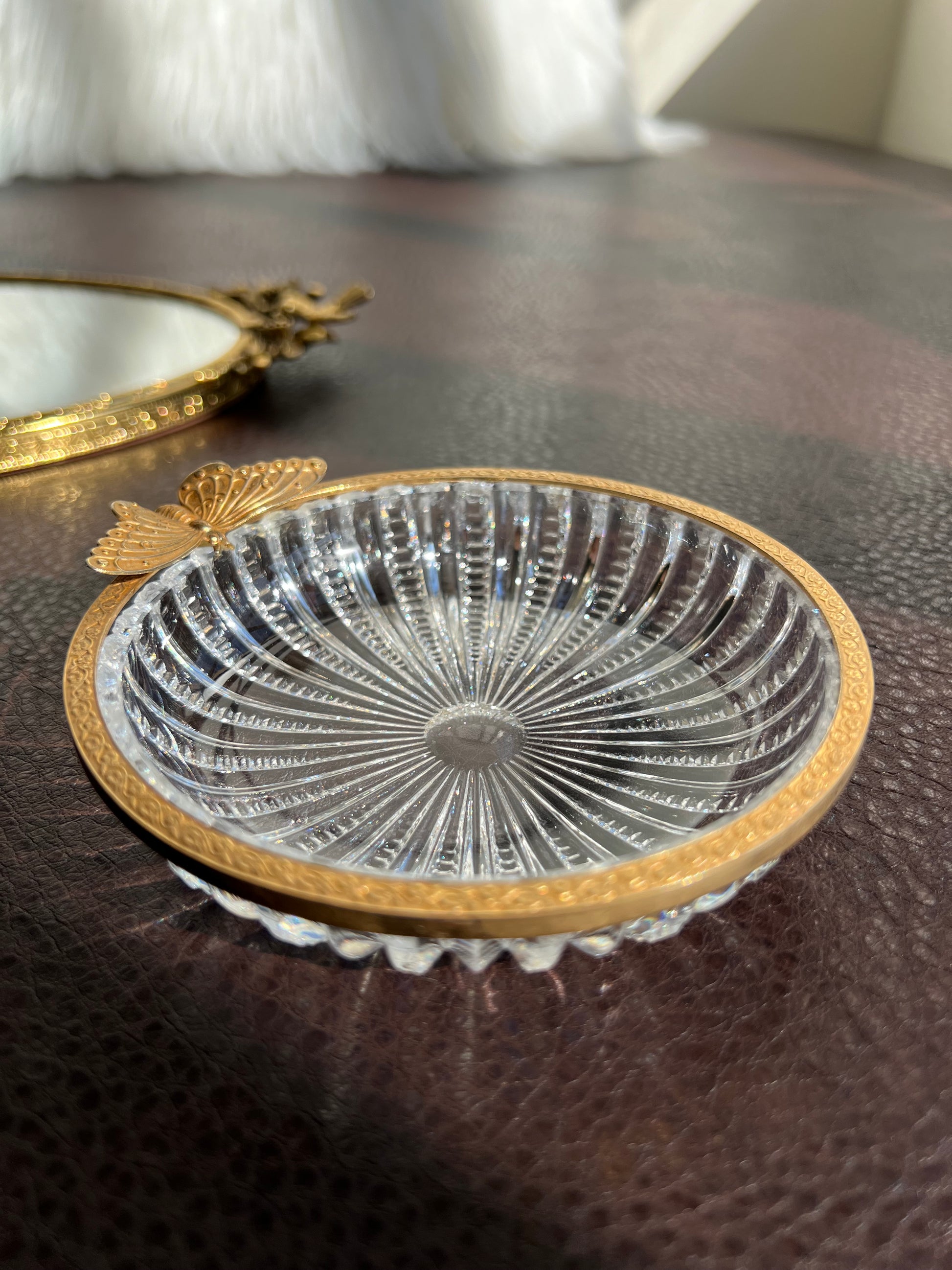French Cut Crystal Glass Vintage Trinket Dish with Gilt Rim and Butterfly