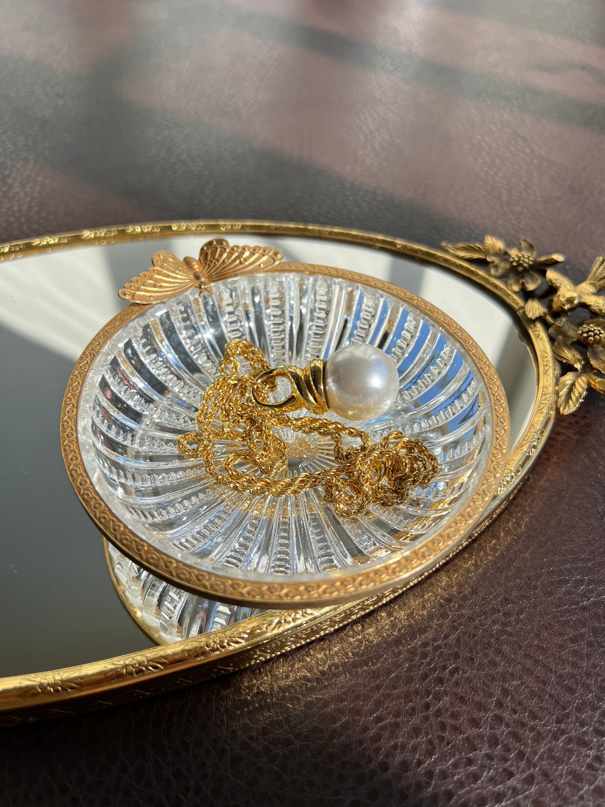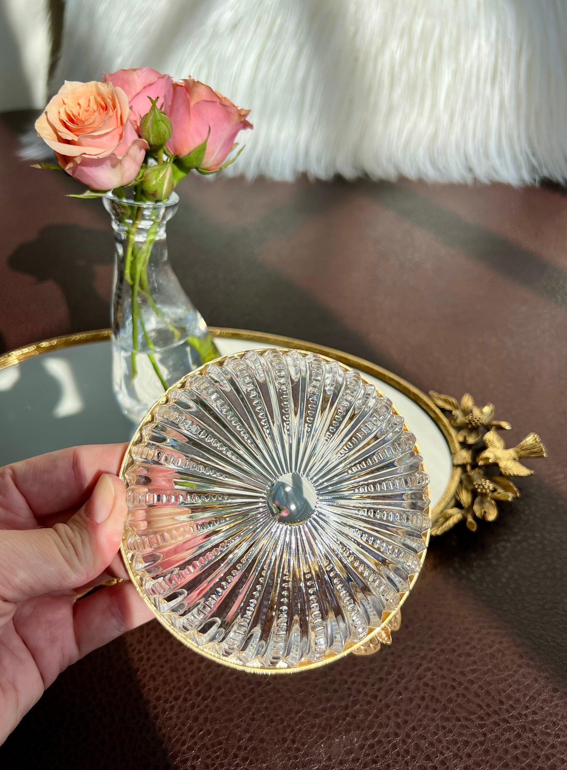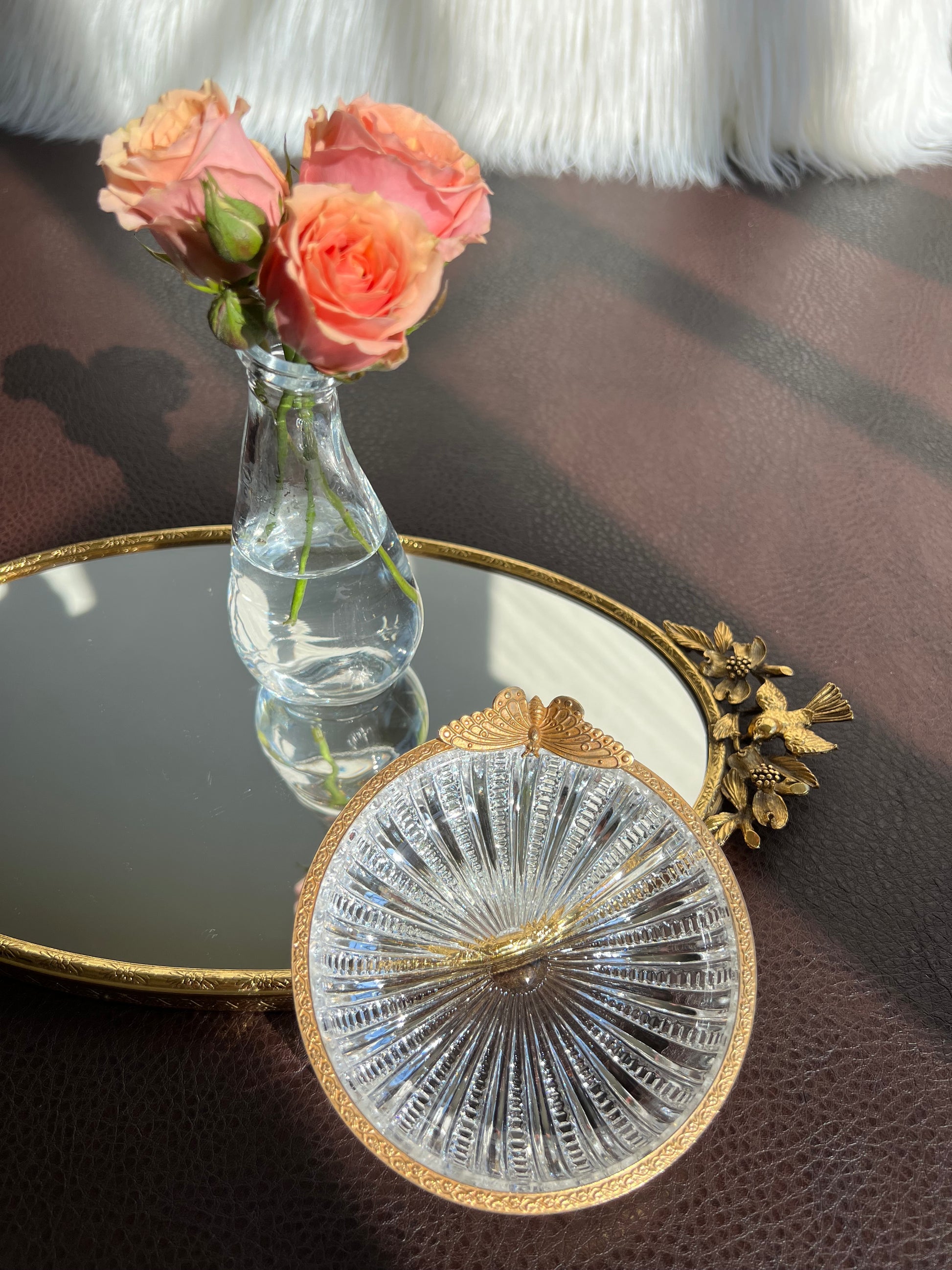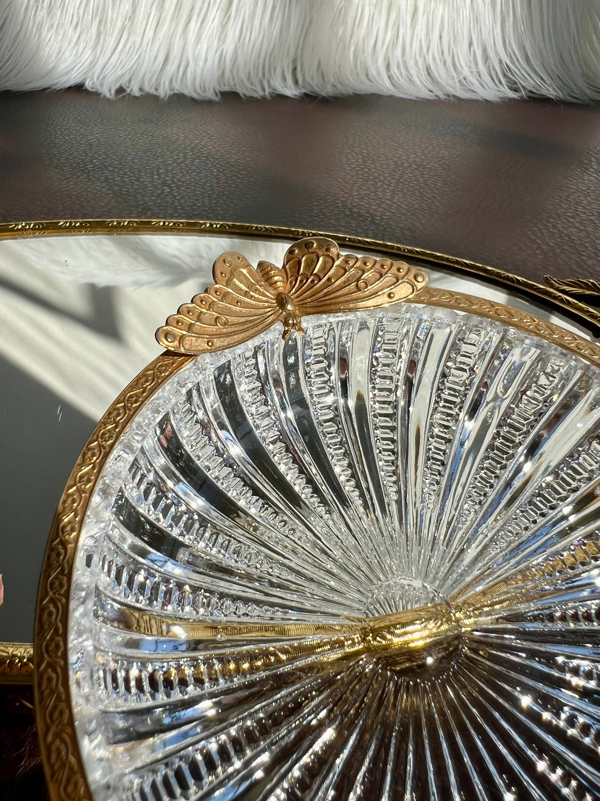 French Cut Crystal Glass Vintage Trinket Dish with Gilt Rim and Butterfly