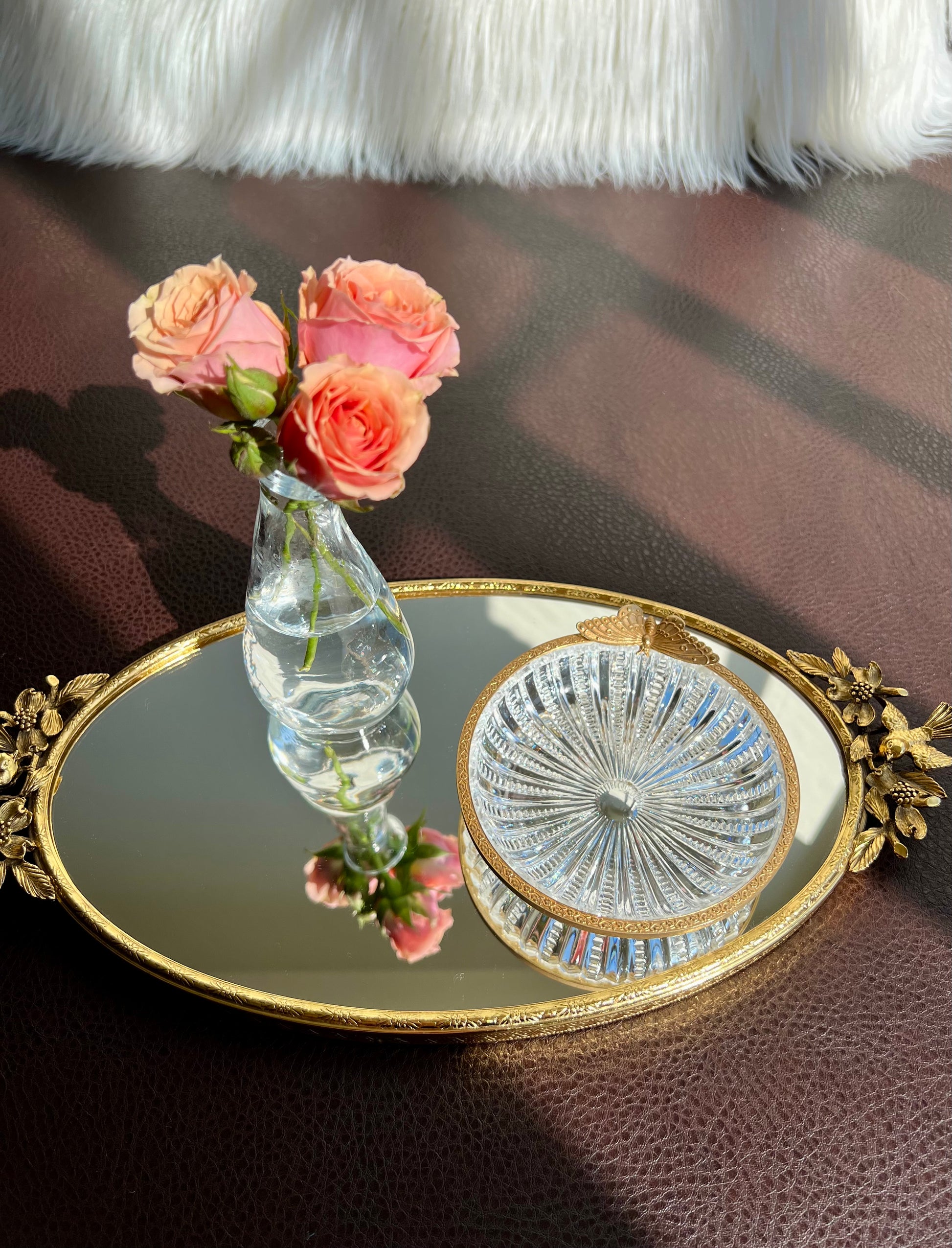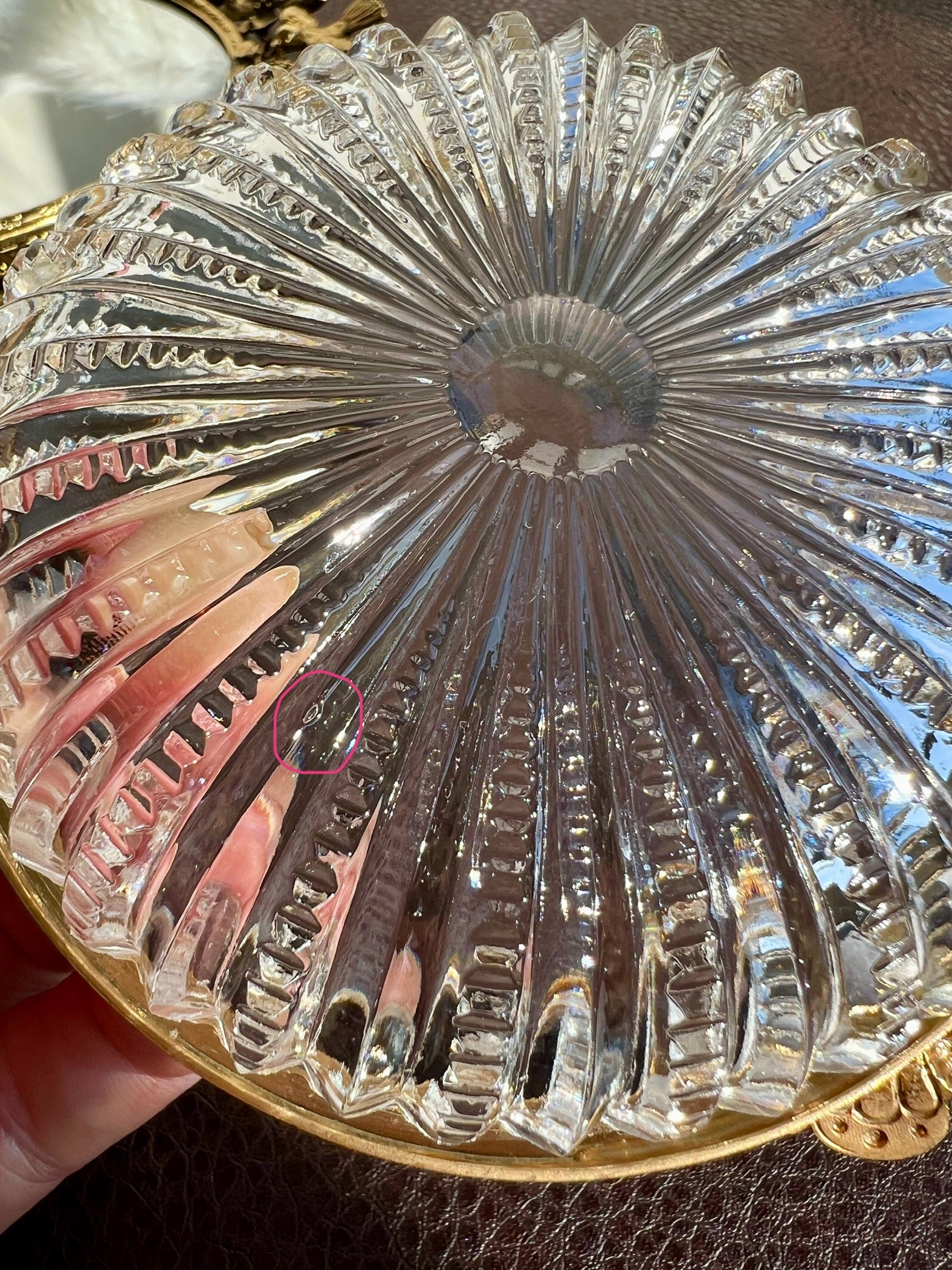 Beautiful vintage / antique French cut crystal trinket dish (or ashtray) with gild rim and butterfly decoration. Rare to find. It’s in very good condition. There is only one very small glass damage on the back, which I marked in one of the photos. It's almost imperceptible. Otherwise, the product is very gorgeous.