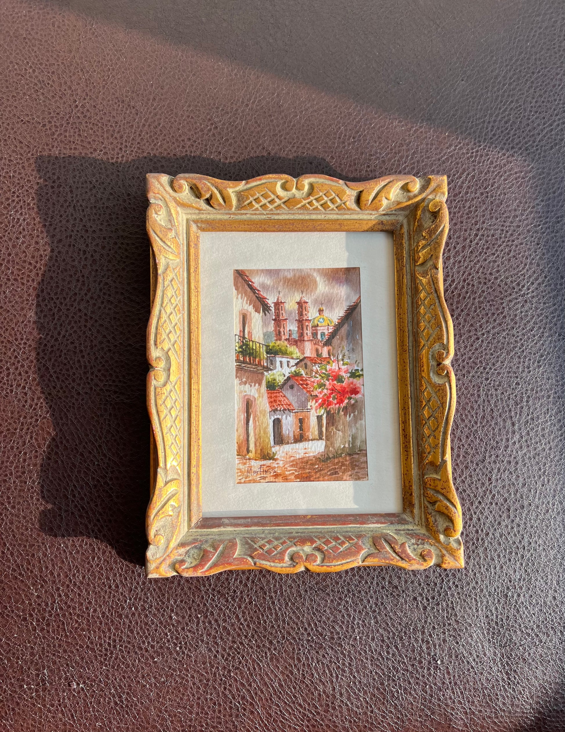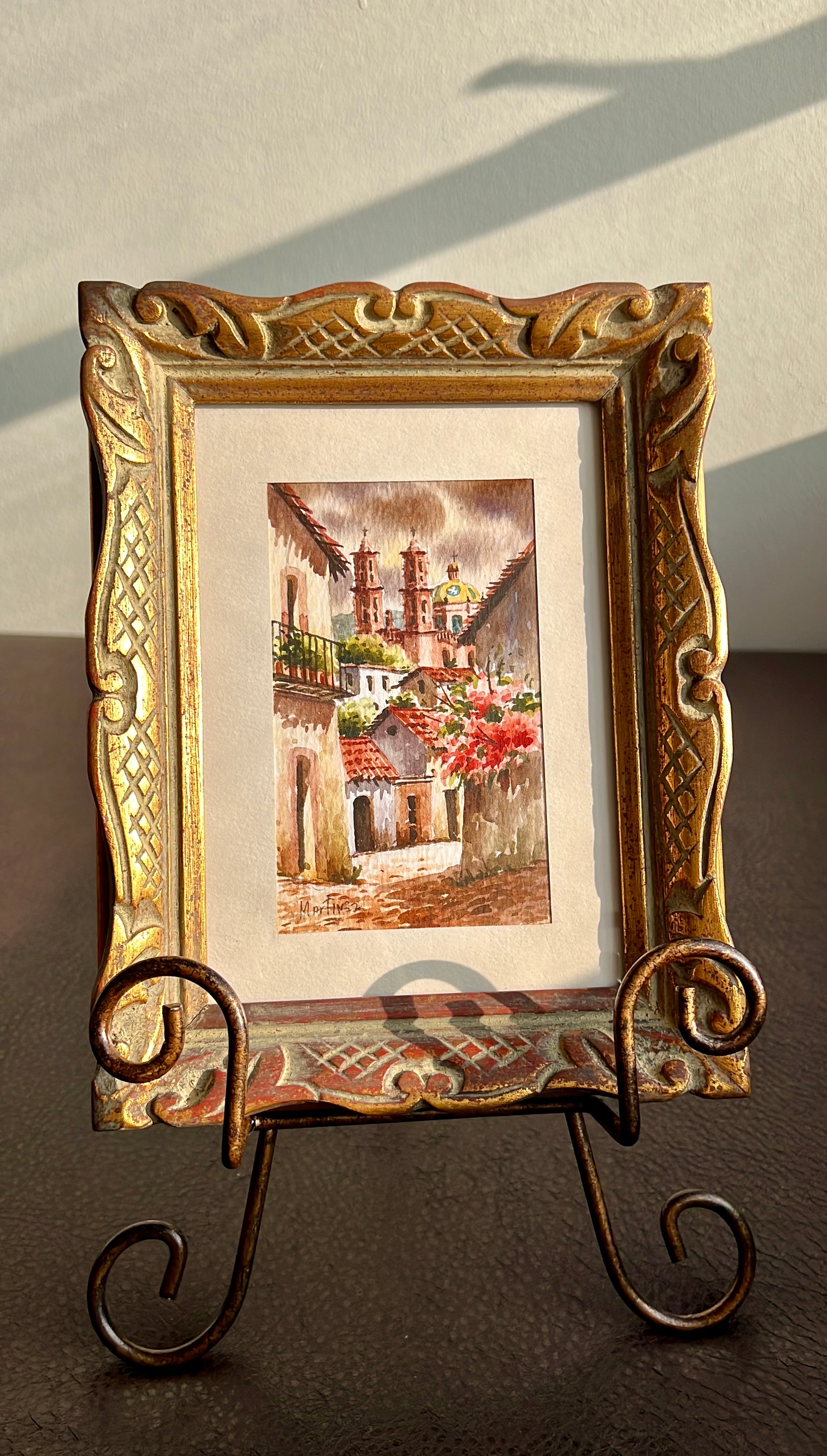 Beautiful watercolor hand-painted vintage original art, signed painting with gilded wooden frame. It’s in excellent vintage condition.