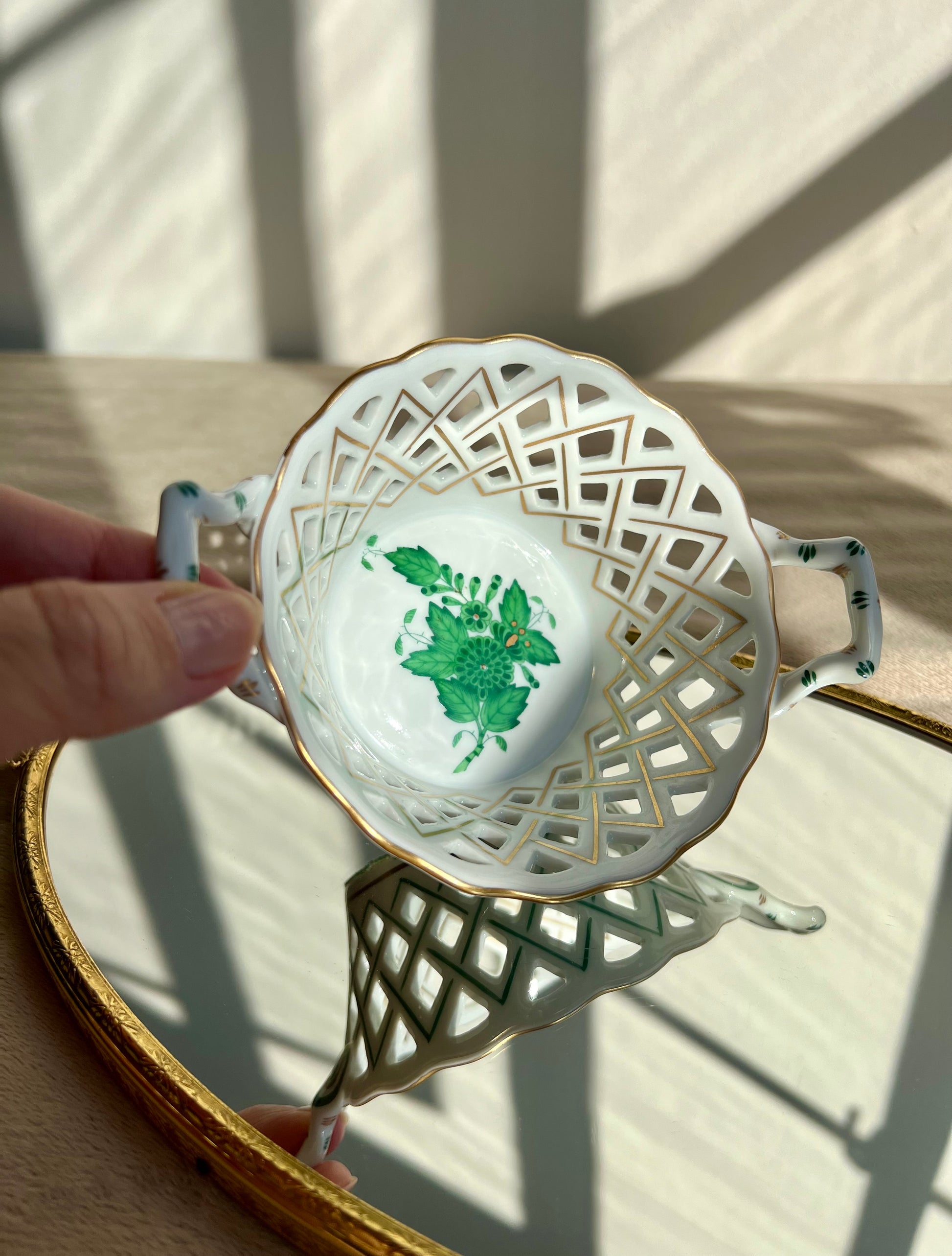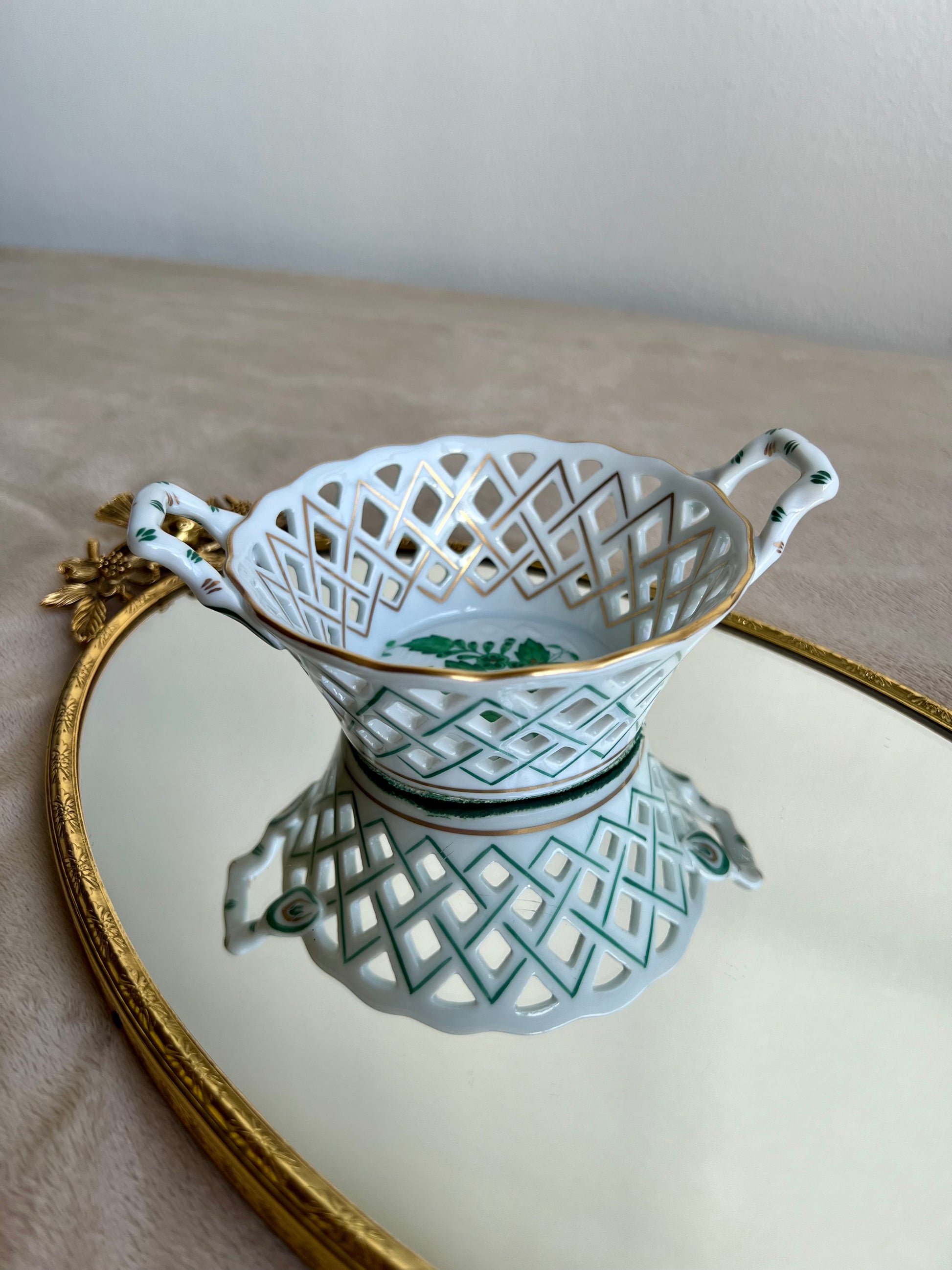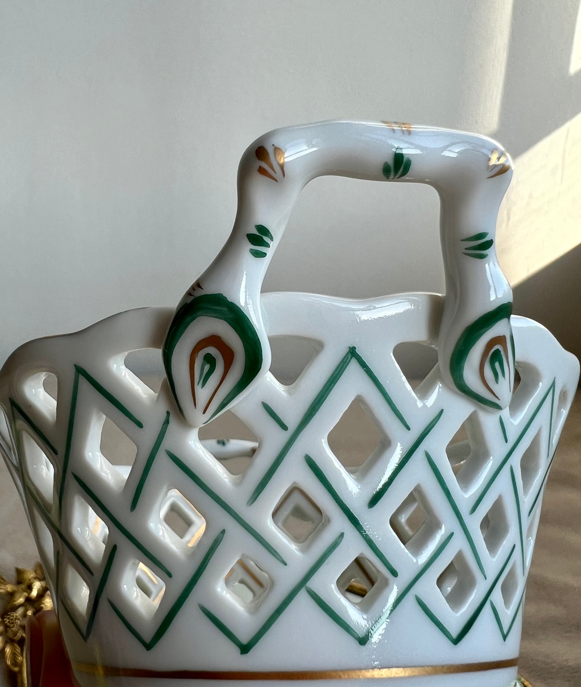 Herend Apponyi Chinese Bouquet Green Porcelain Open Weave Basket with Handles, Made in Hungary