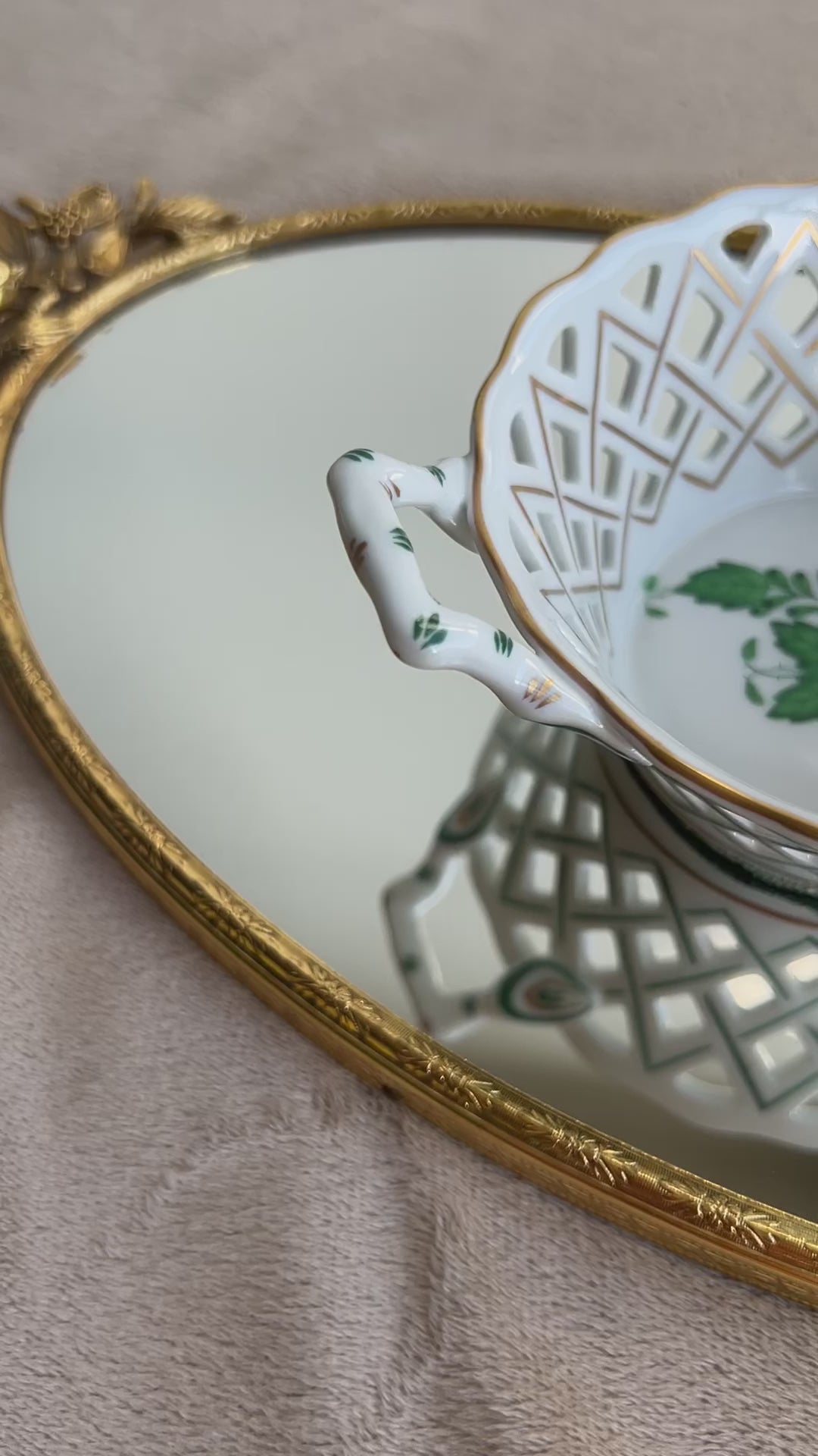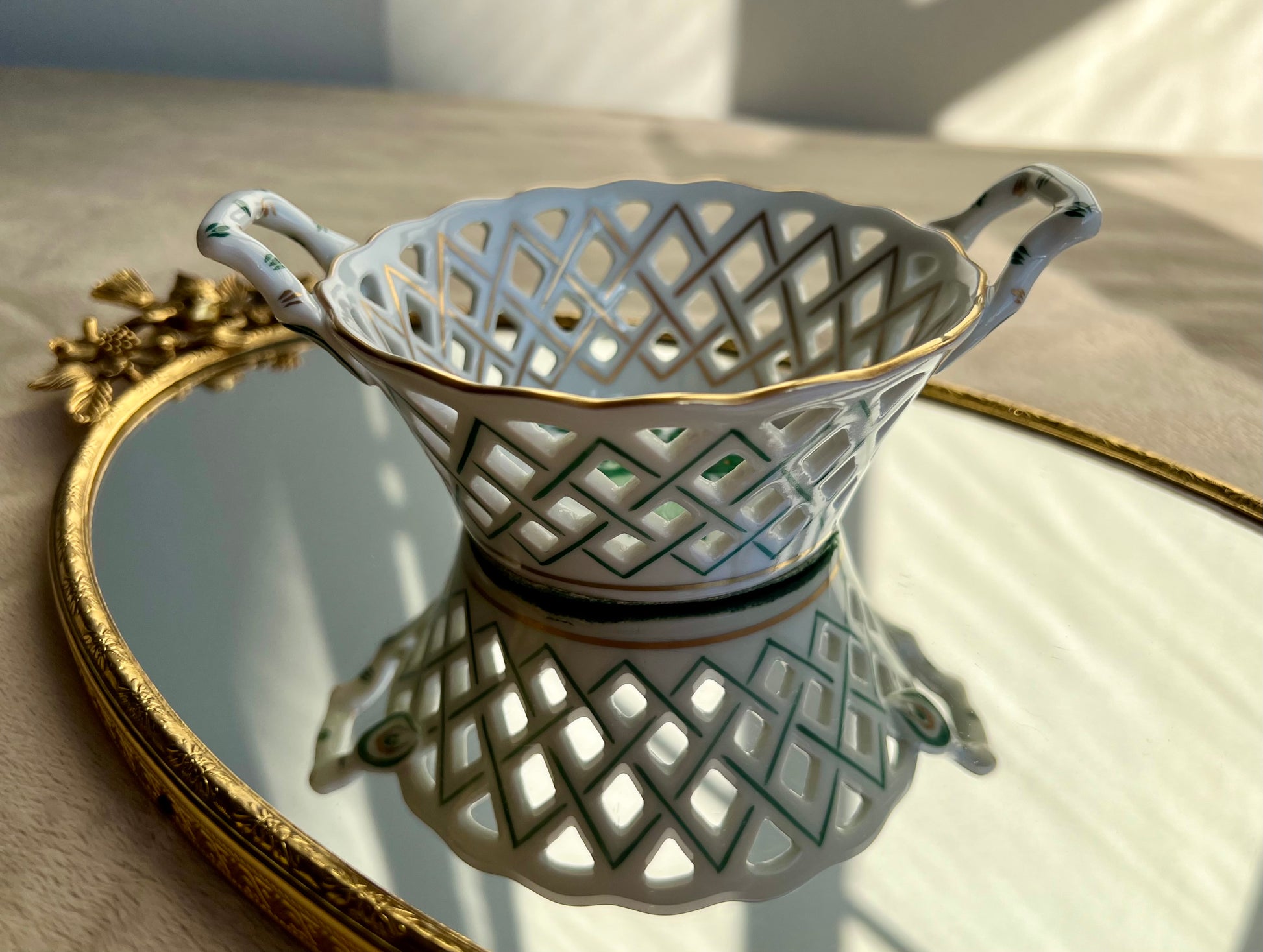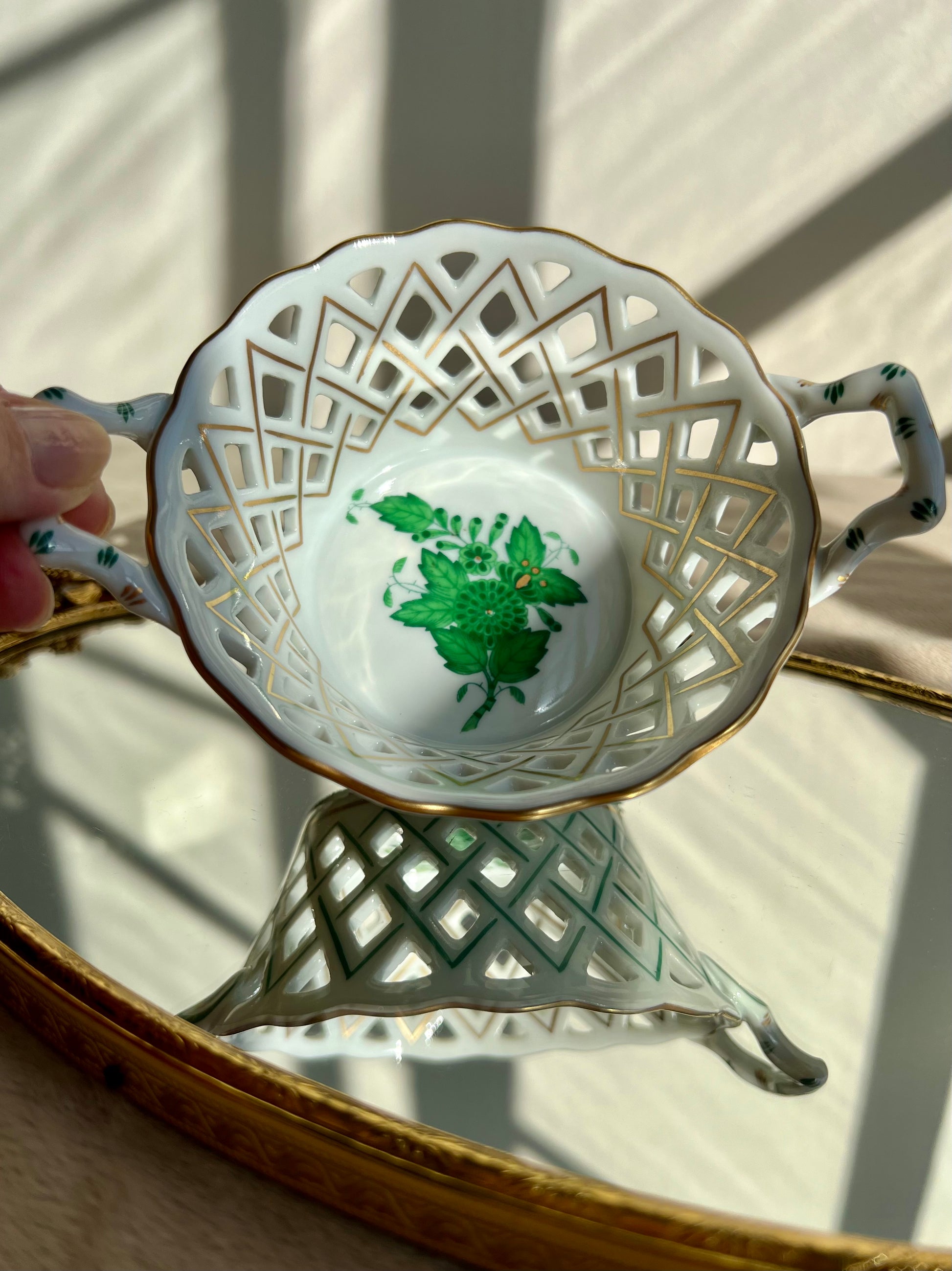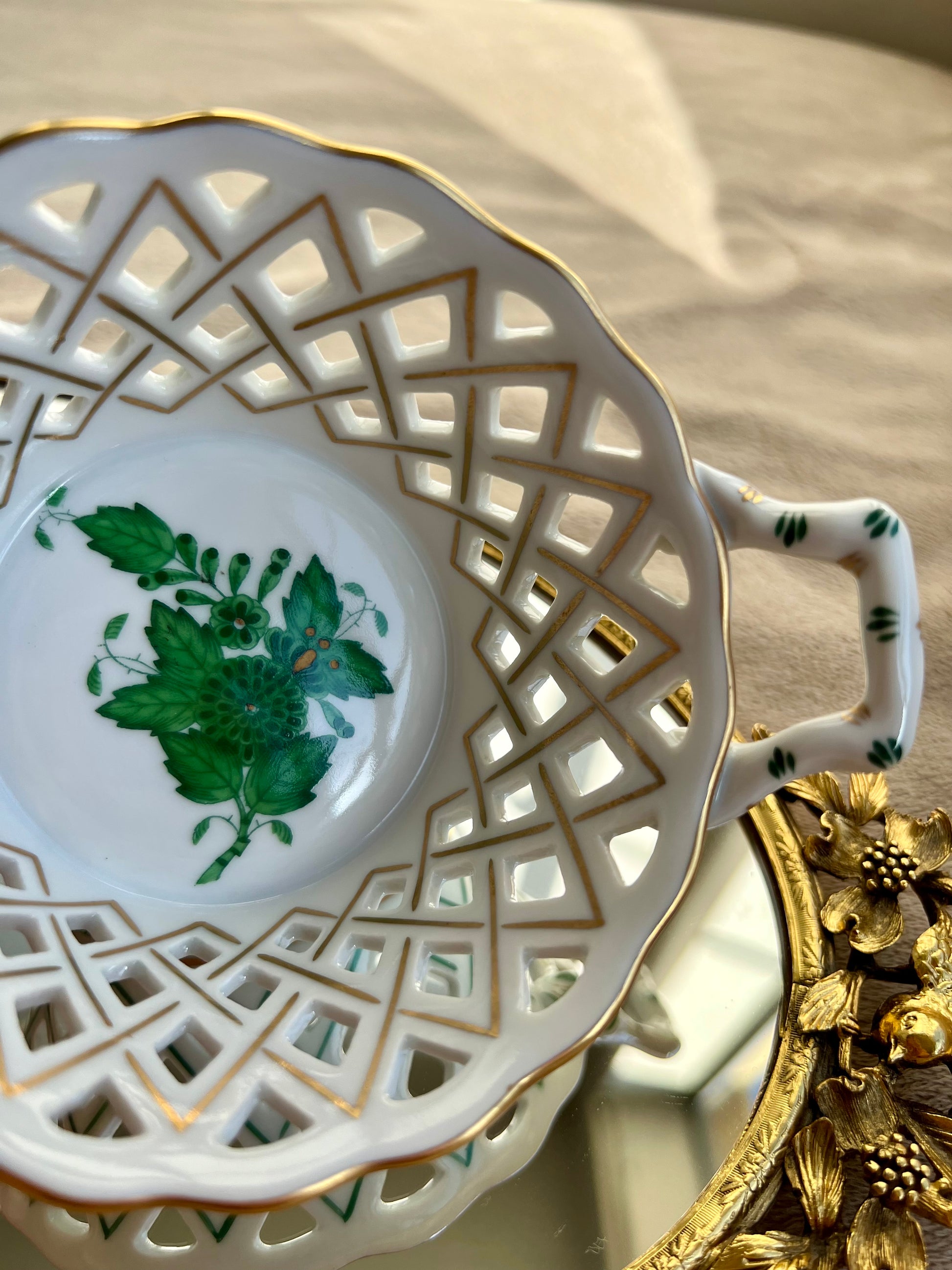 Herend Apponyi Chinese Bouquet Green Porcelain Open Weave Basket with Handles, Made in Hungary