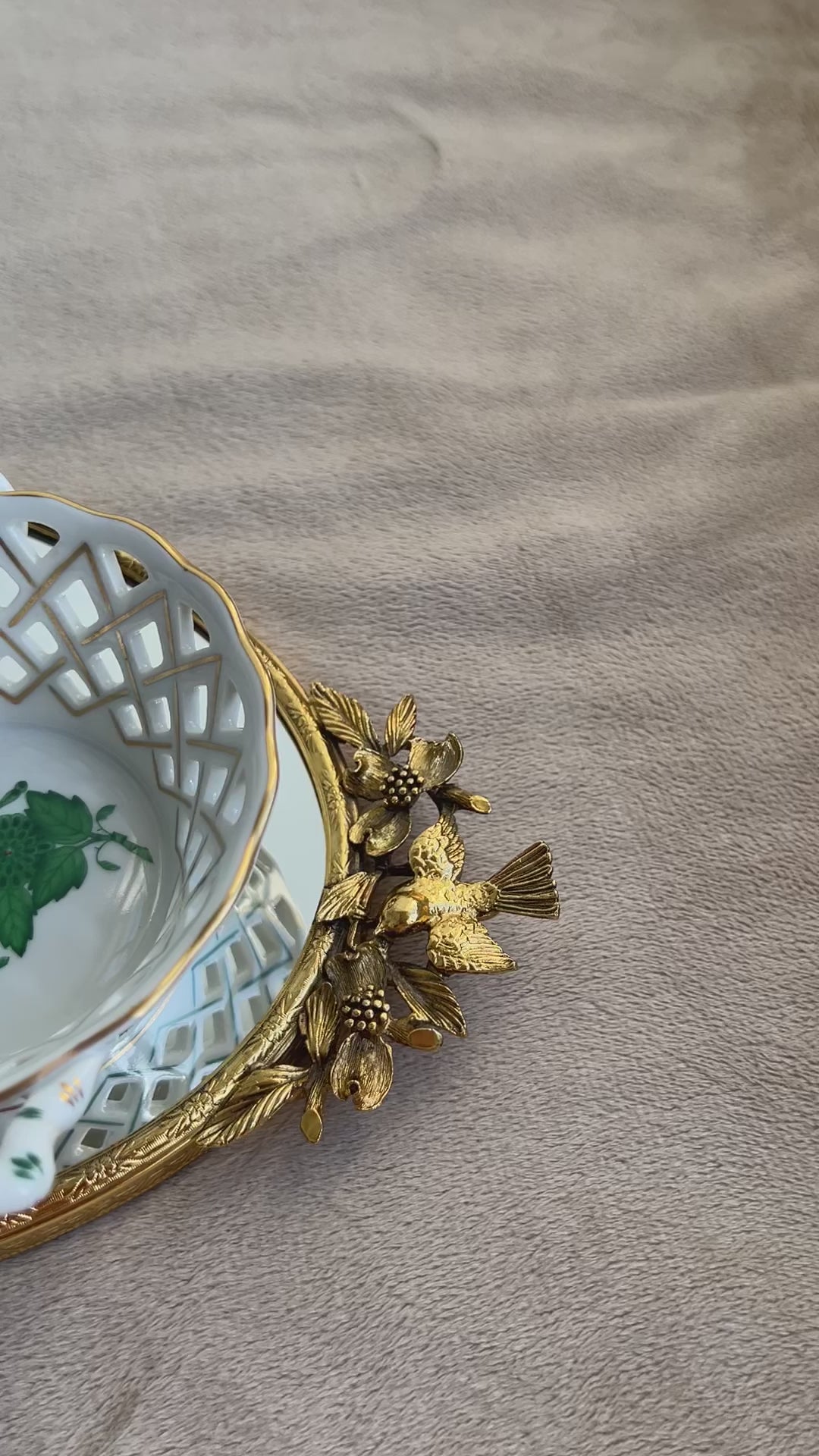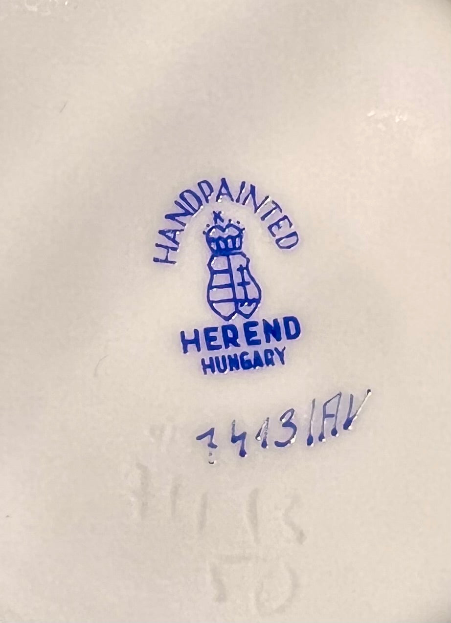 Beautiful vintage Herend Apponyi Chinese bouquet green porcelain oval weave floral basket with handles. It measures 2 7/8 high to the tip of the handle by 7" wide from handle to handle. The porcelain is in excellent, but used condition. No chips or cracks, no repairs. The edge of the bottom of the porcelain is covered with green felt material.