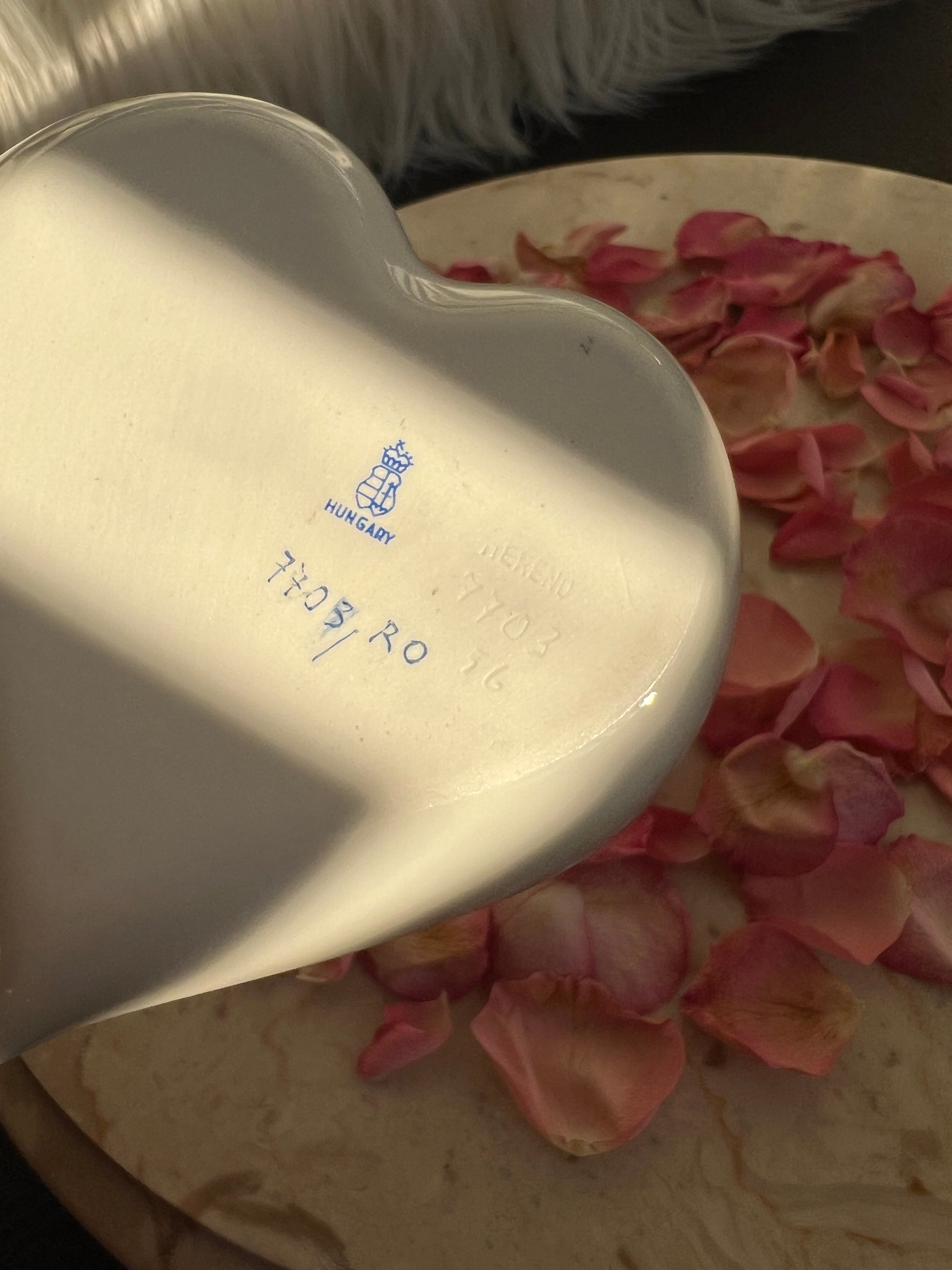 Beautiful Herend Rothschild bird hand painted small heart shaped plate/tray. Made in Hungary. The product is in very good vintage condition. When held up to the light, you can see two very faint, almost invisible small streaks on the enamel. These are inside of the bowl, on the heart left side.