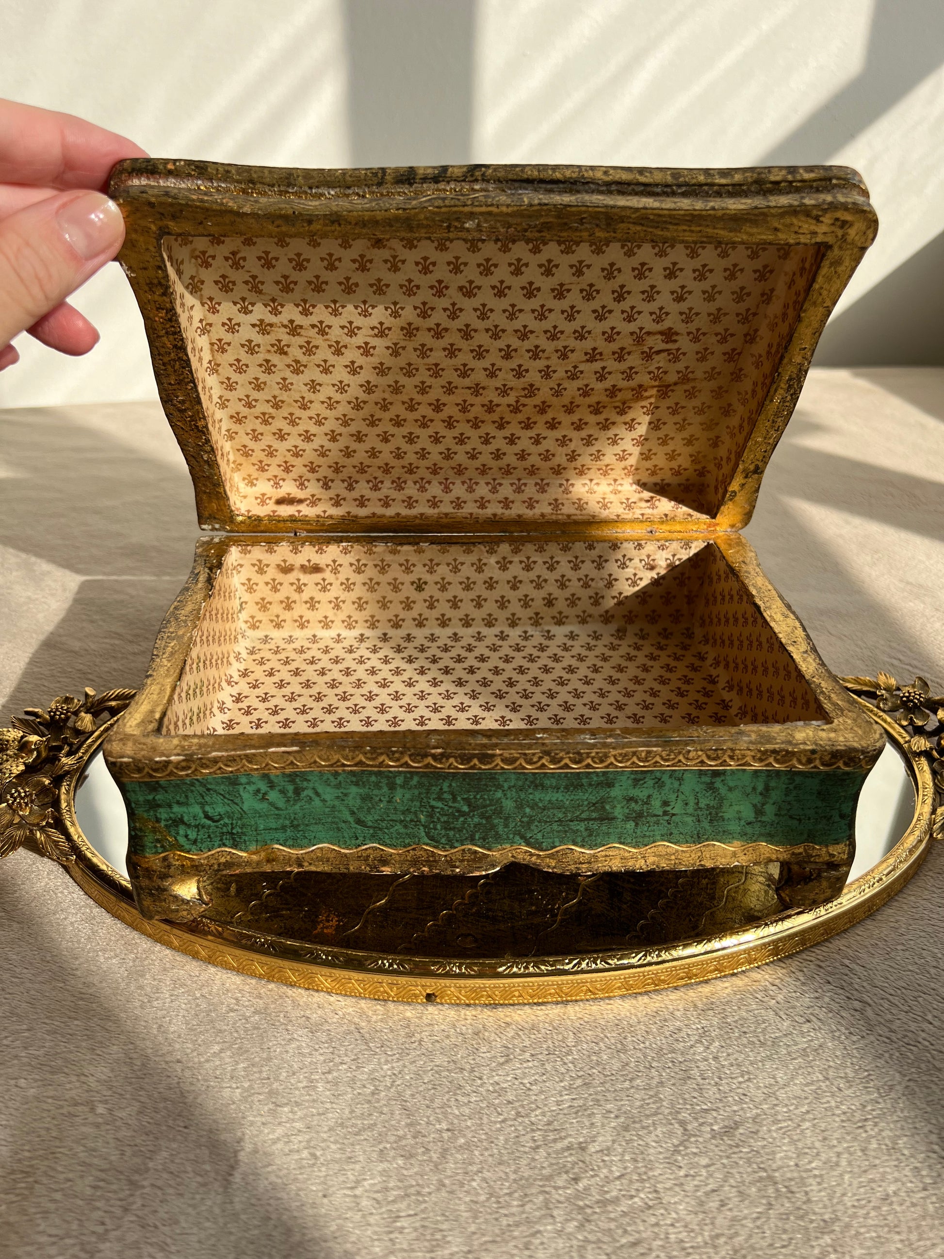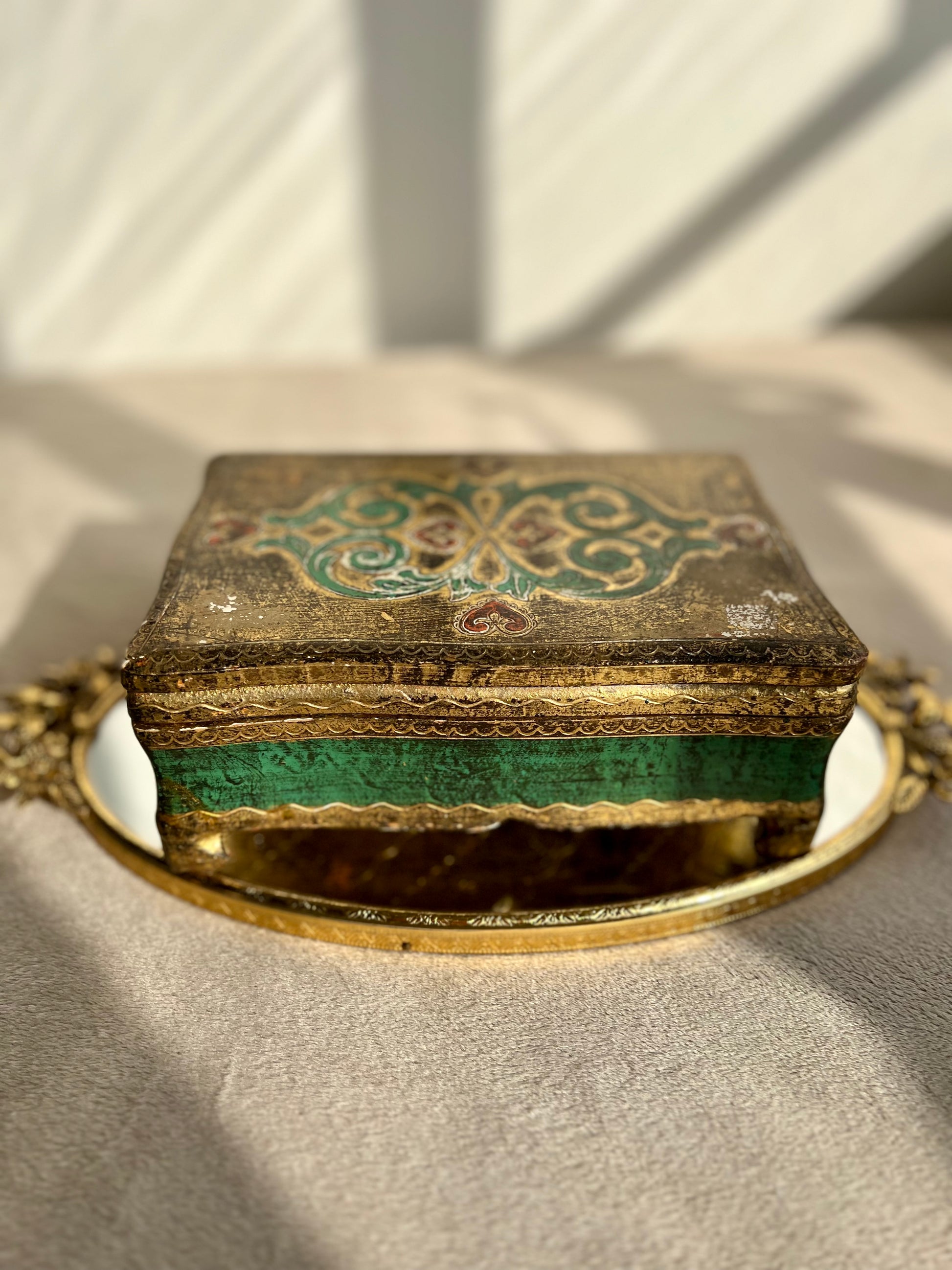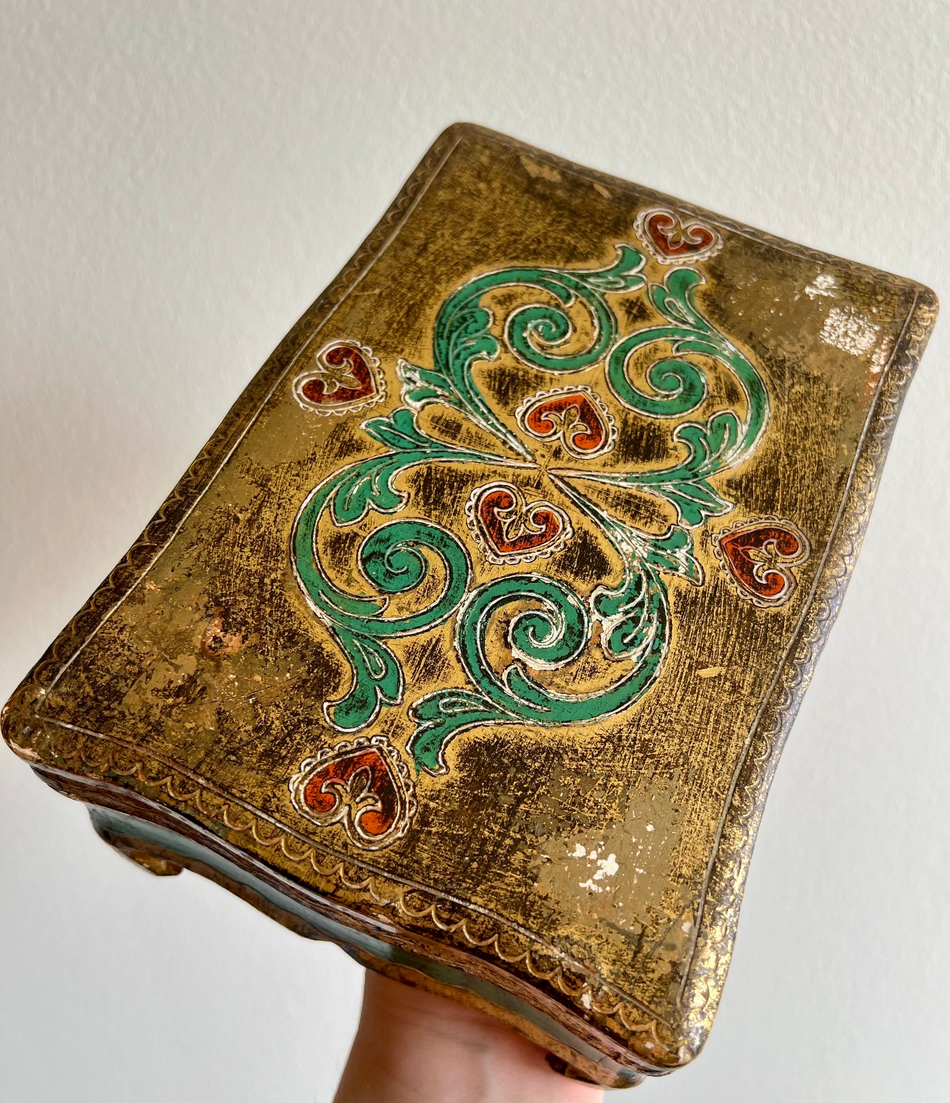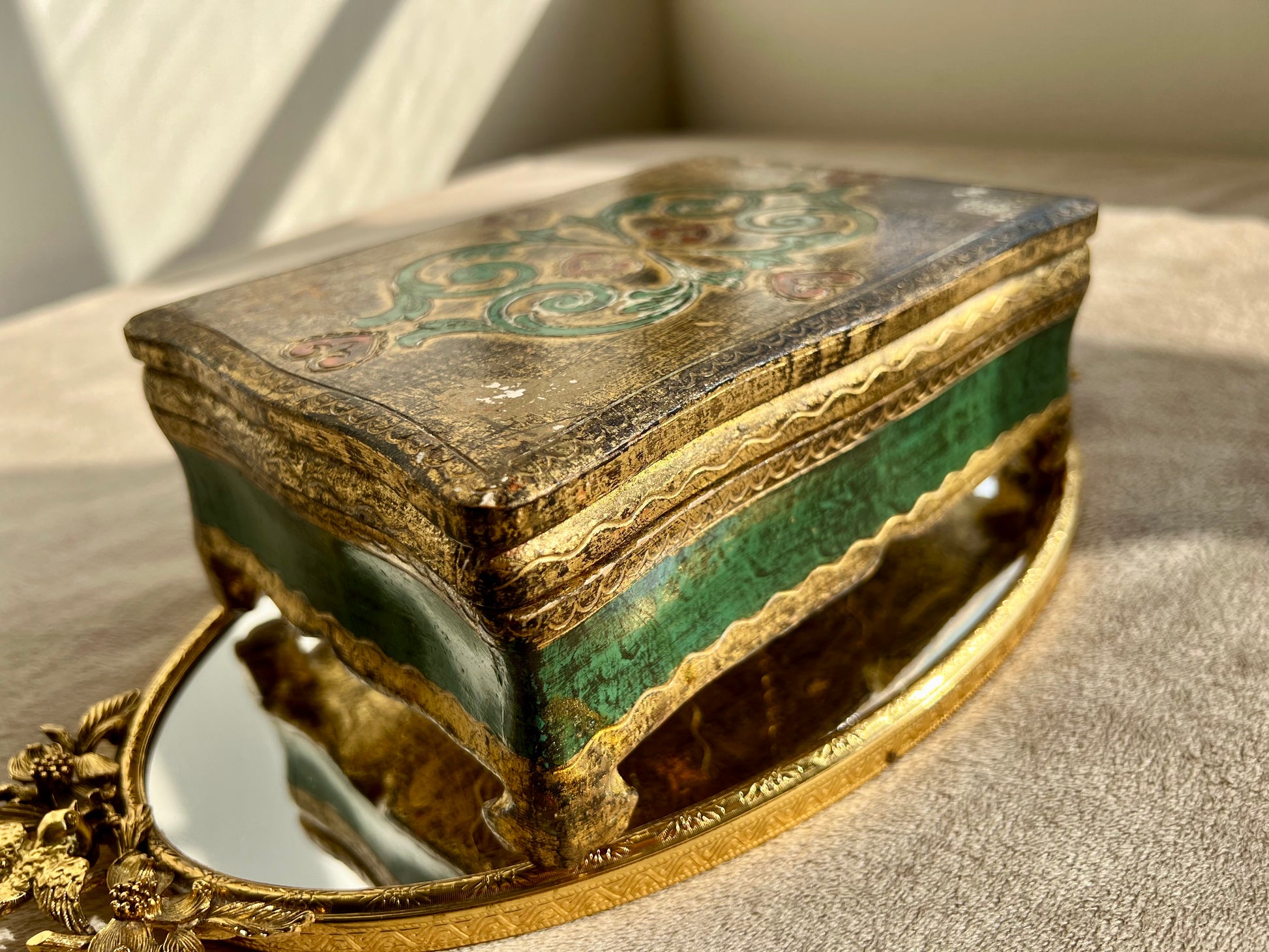 Beautiful vintage gold and green Italian Florentine large footed wooden box with attached lid. Perfect for jewelry or trinkets. This really special piece is in very good but vintage condition.
