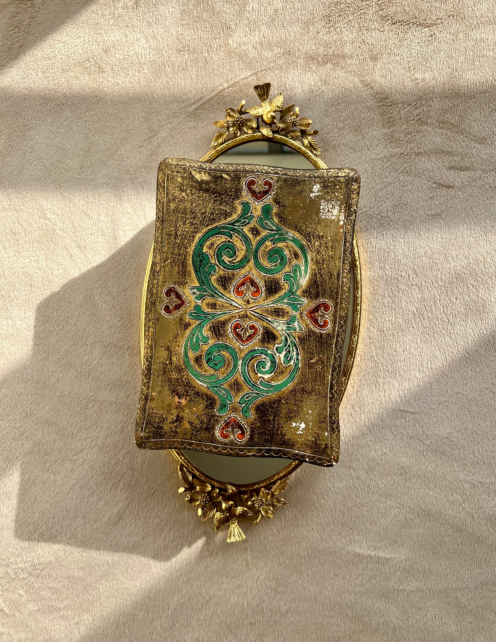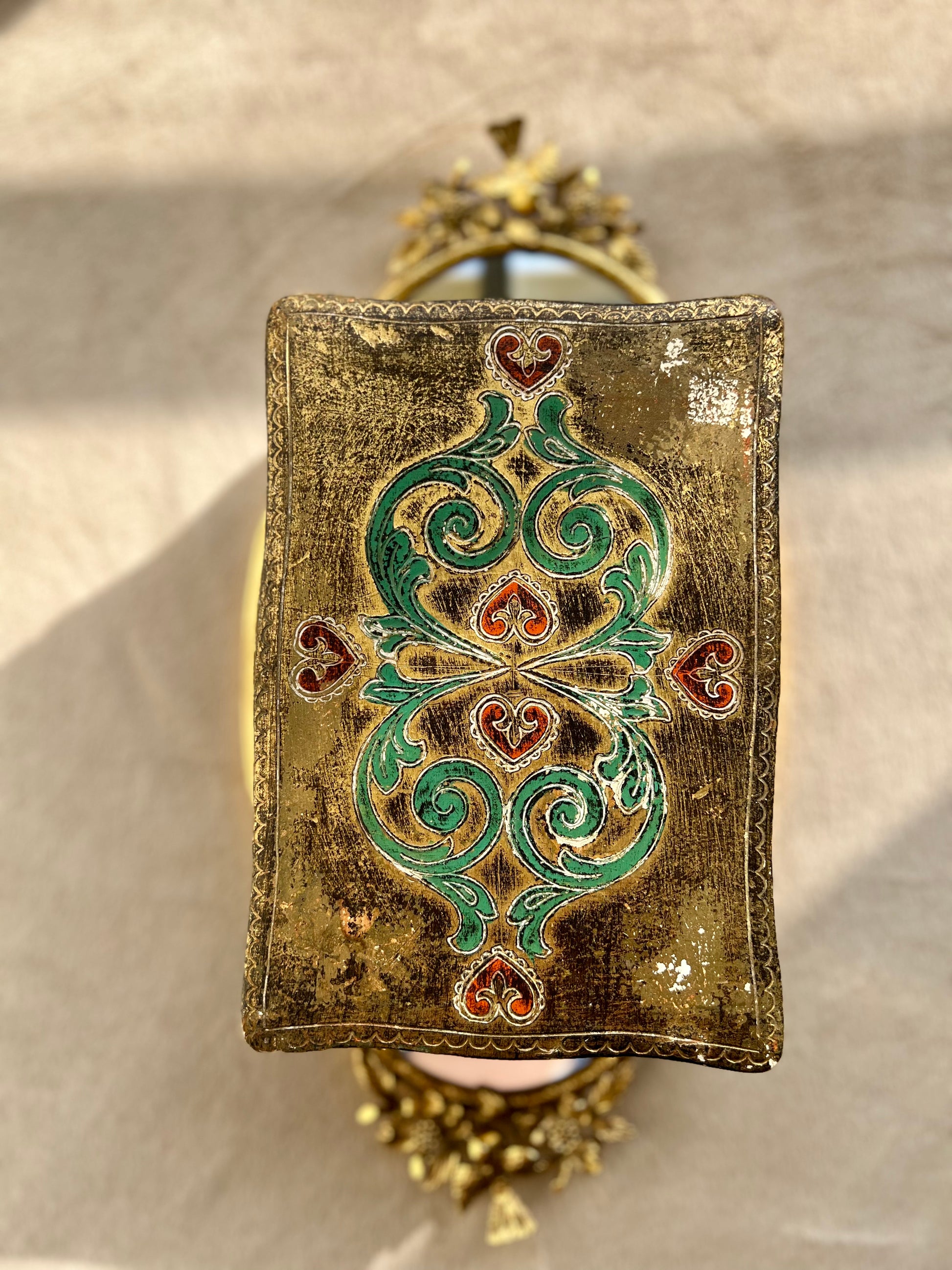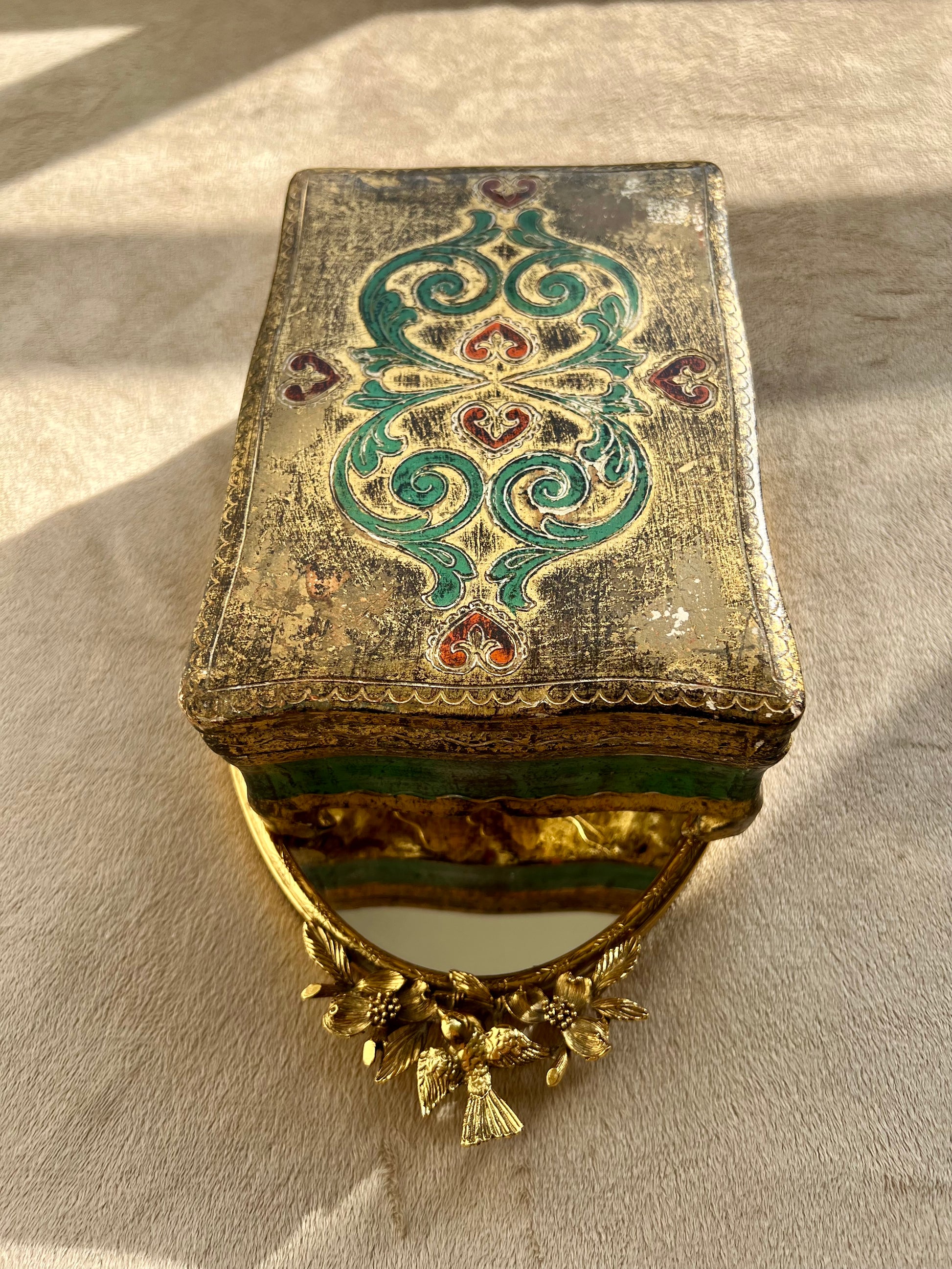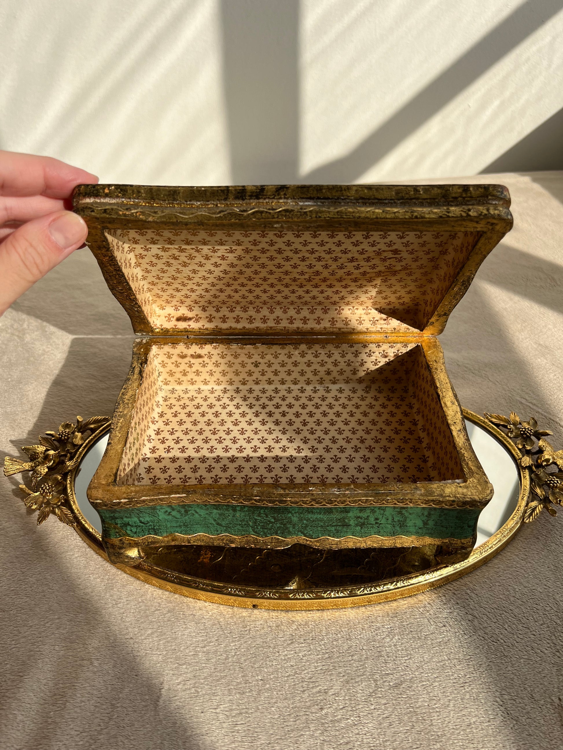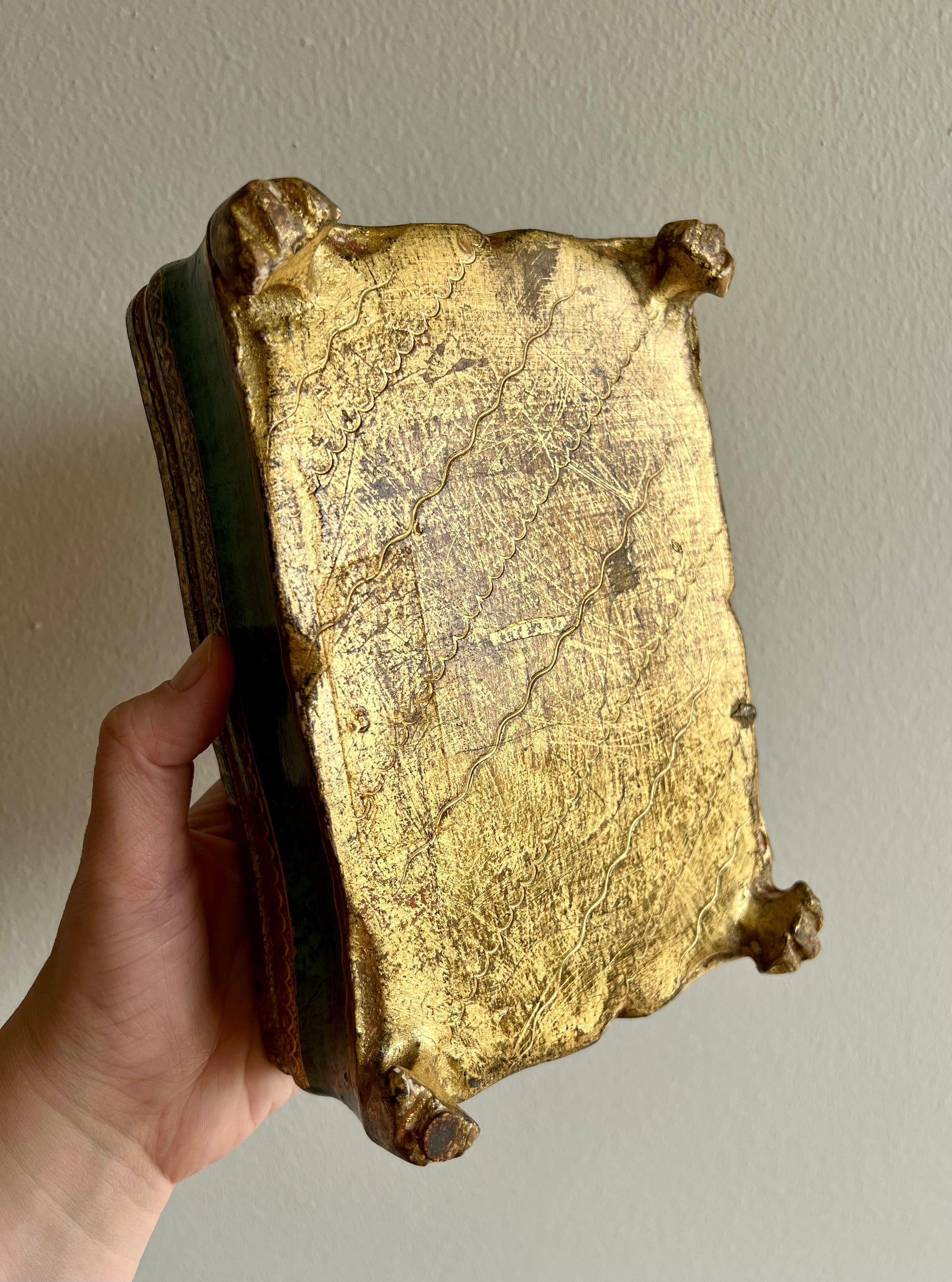 Beautiful vintage gold and green Italian Florentine large footed wooden box with attached lid. Perfect for jewelry or trinkets. This really special piece is in very good but vintage condition.