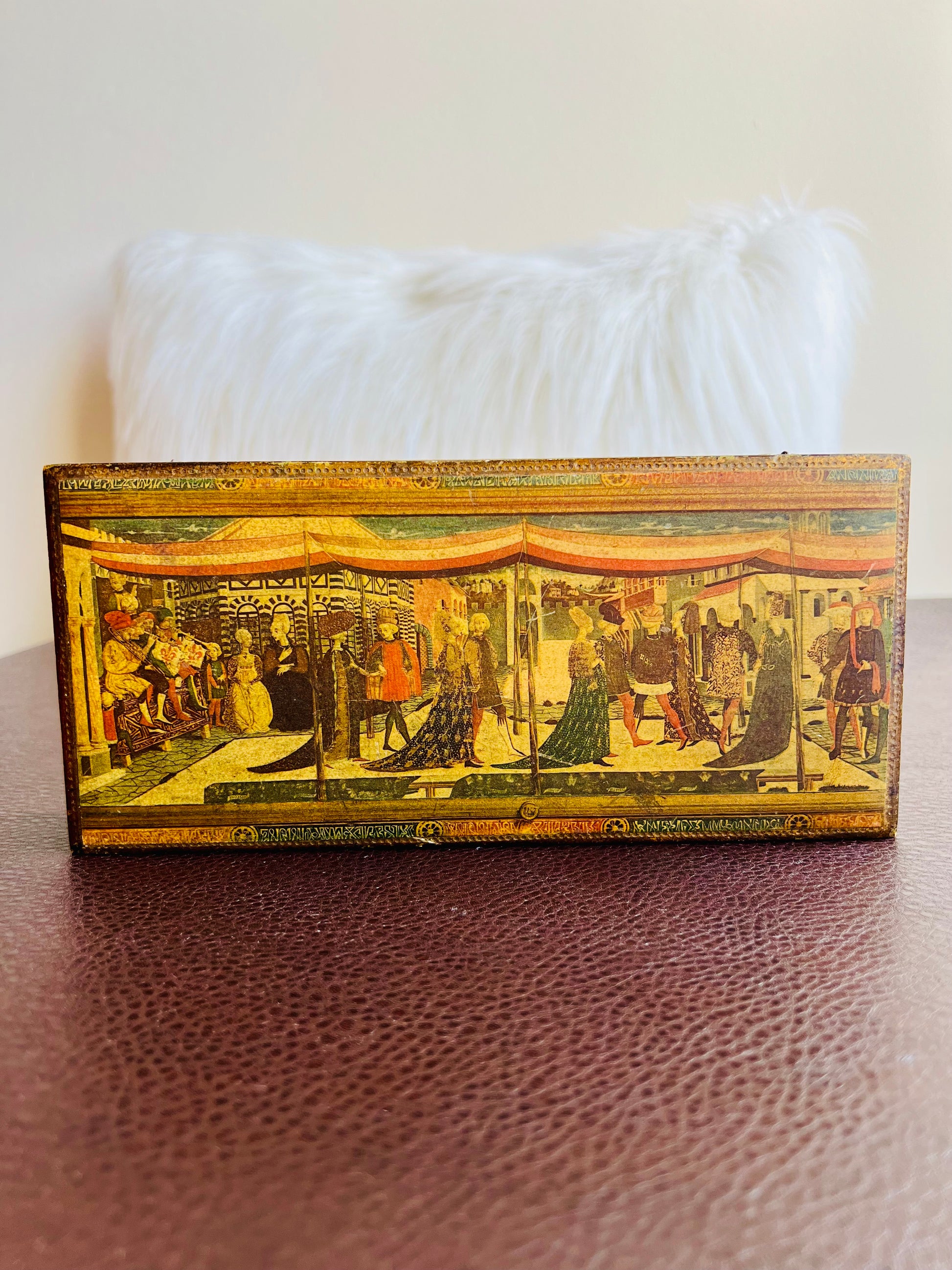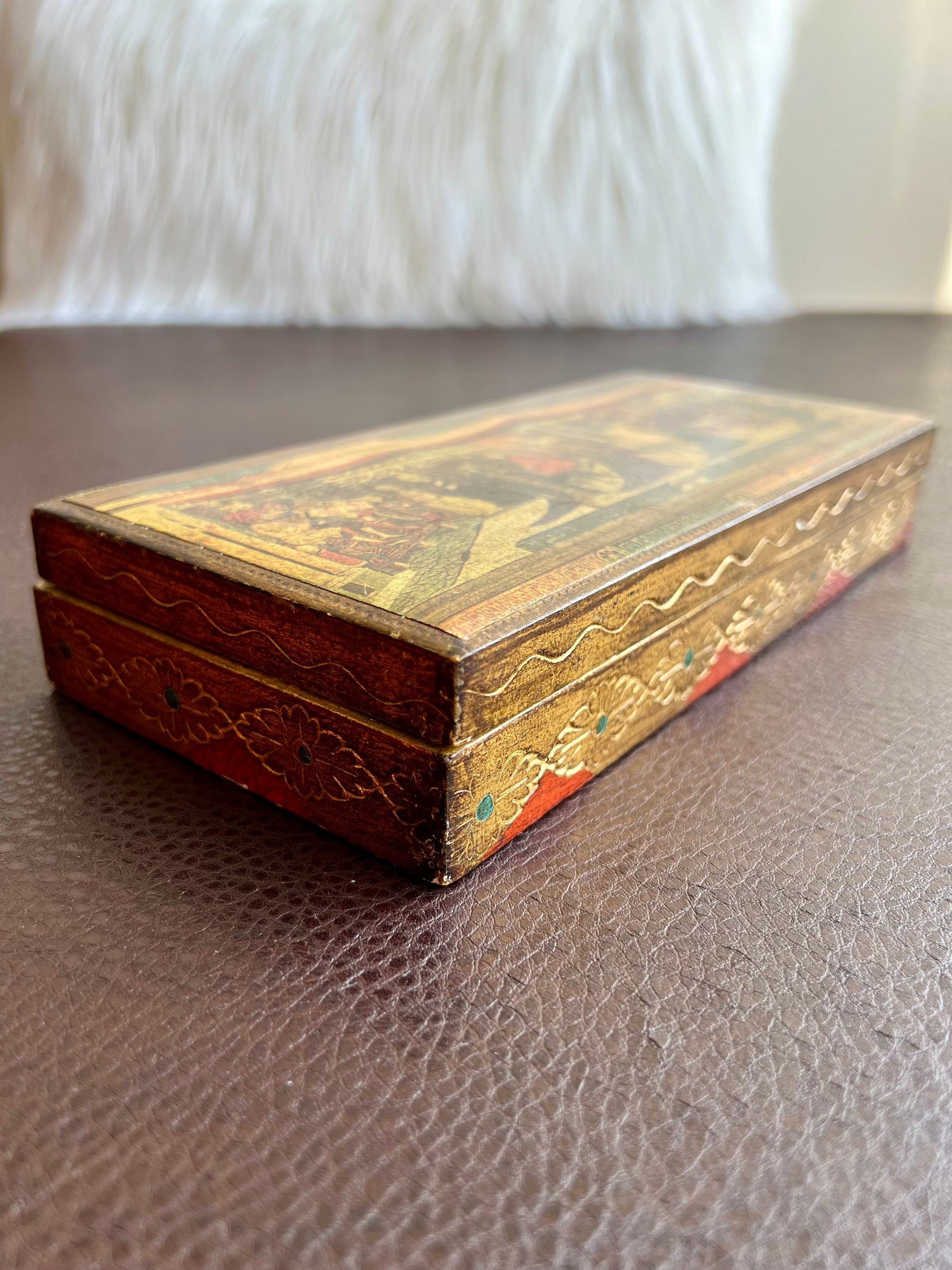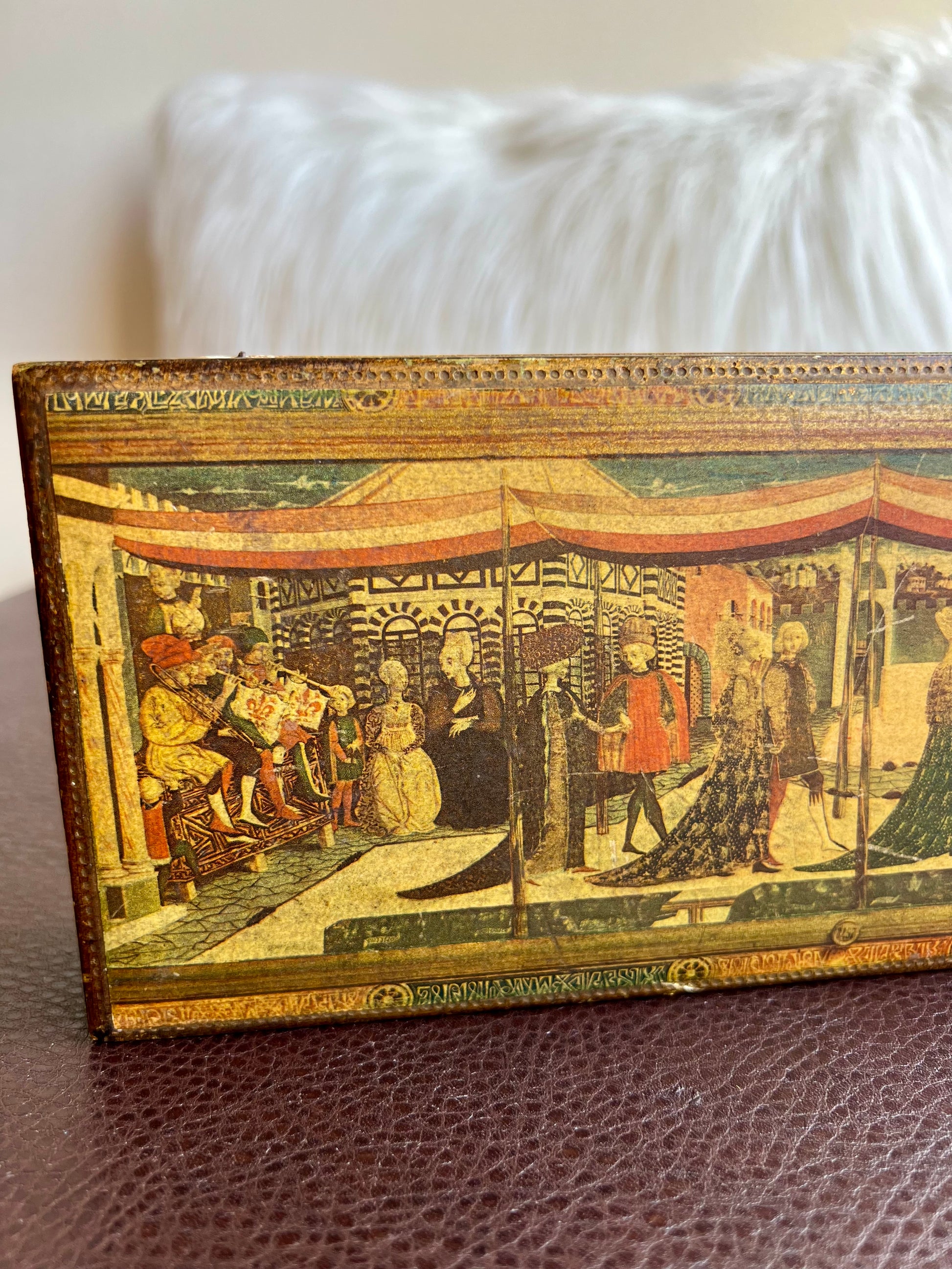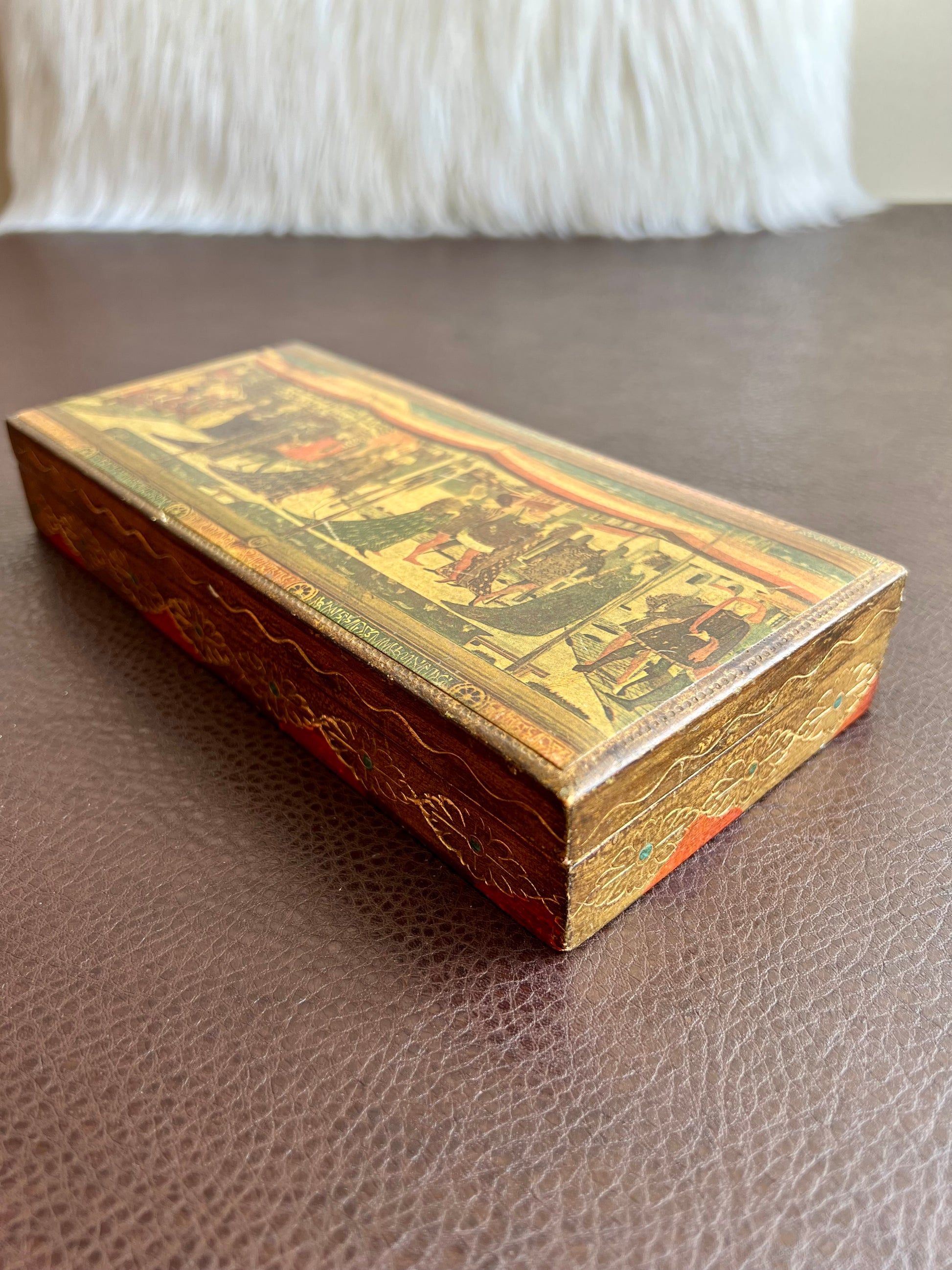 Italian Florentine Gold Gilt Large Jewelry/ Trinket Wooden Box, Wedding Scene on Top of the Lid