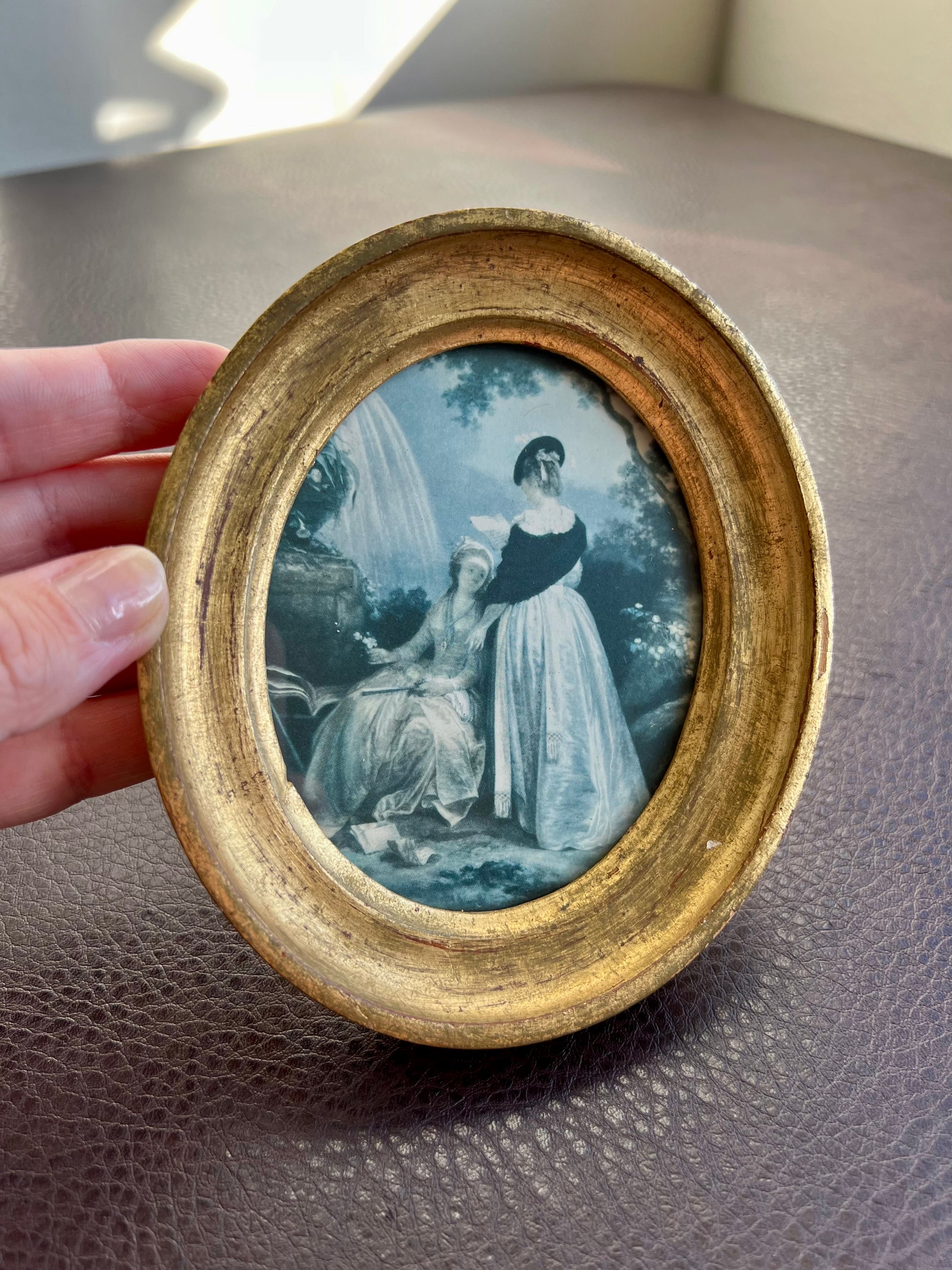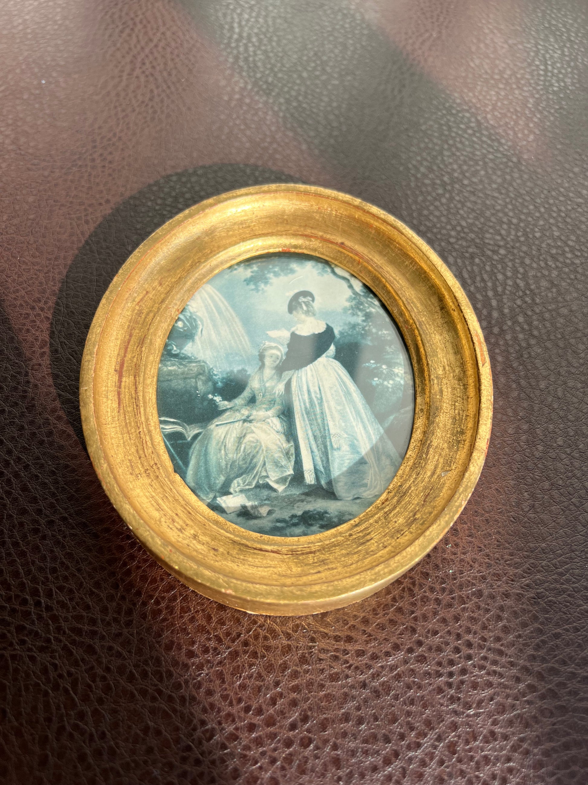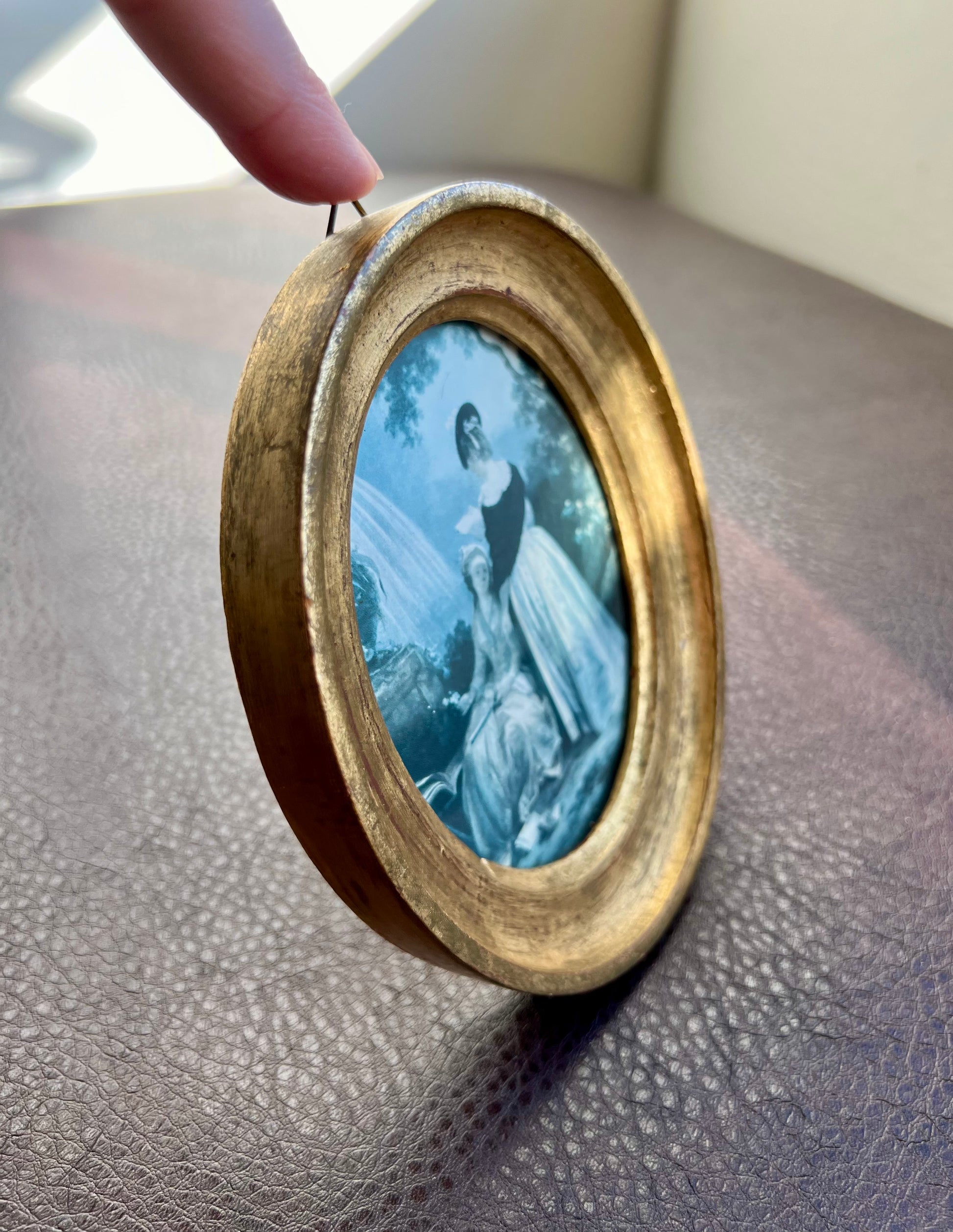 Italian Miniature Oval Vintage Florentine Gilt Wood Framed Print Wall Decor