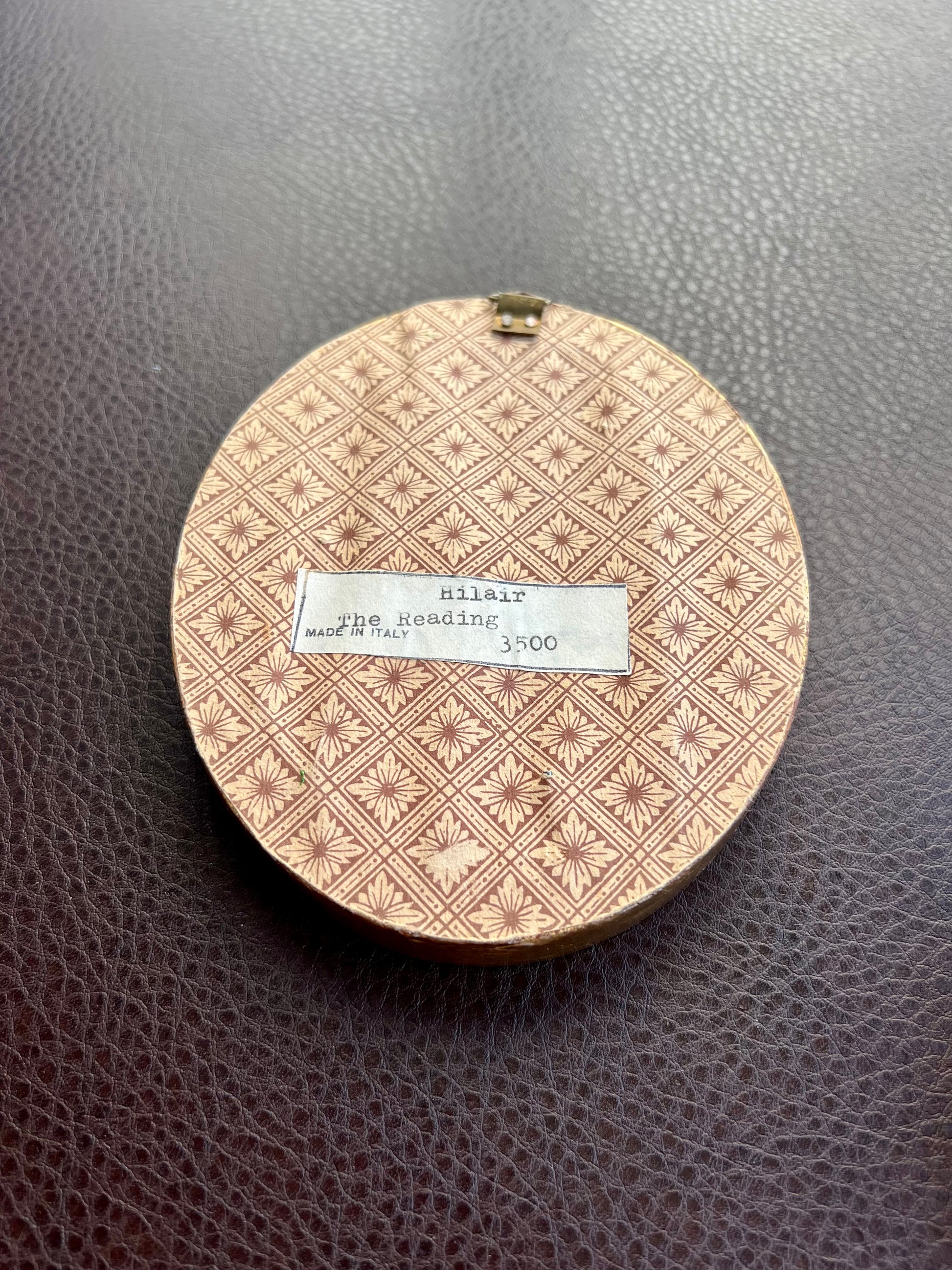 Beautiful miniature vintage Florentine paper art print. Gilt wood oval frame under glass. It has a triangle hook for hanging. Made in Italy, Florence. It’s in very good vintage condition. Numbered, hand made.