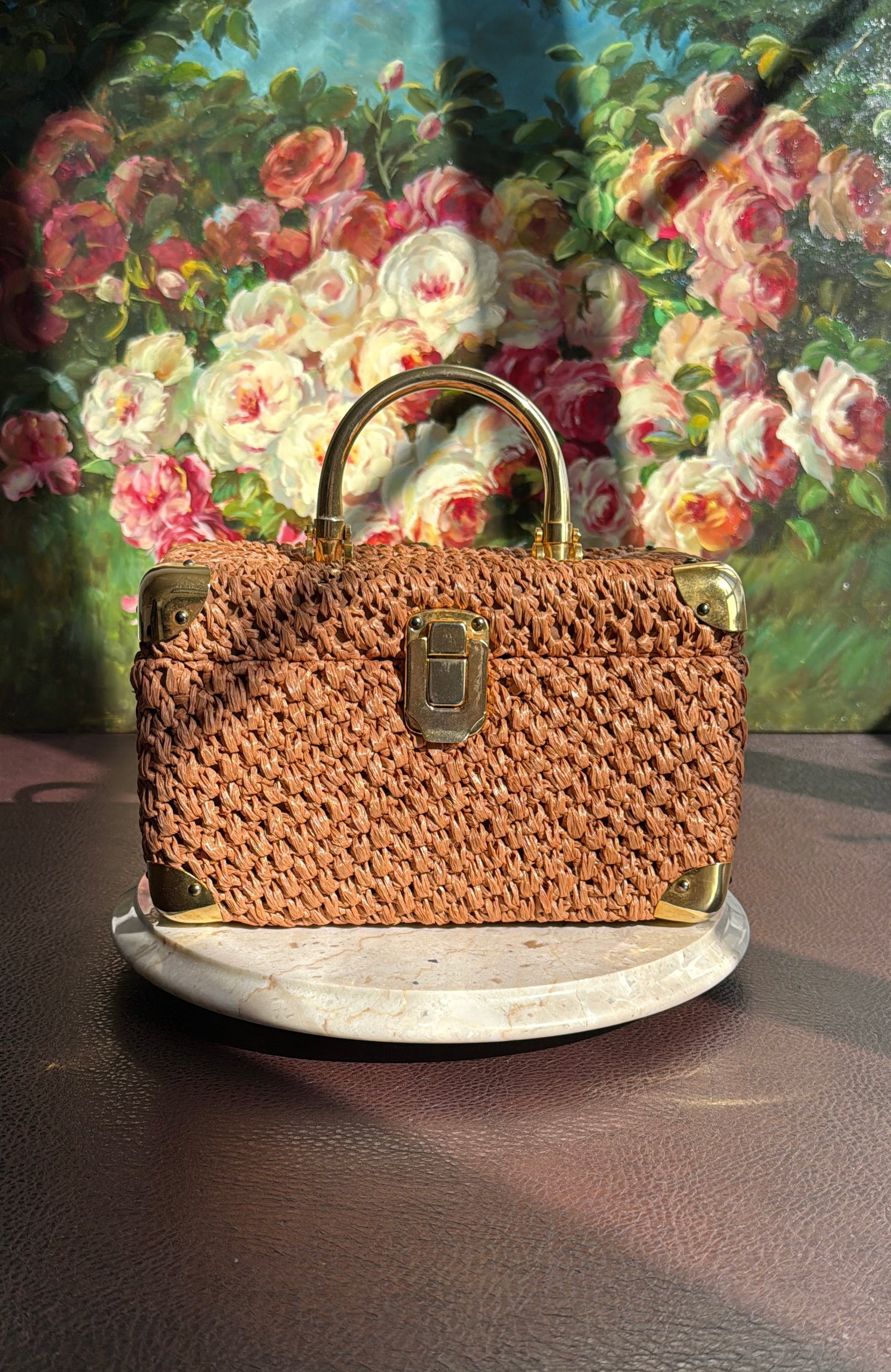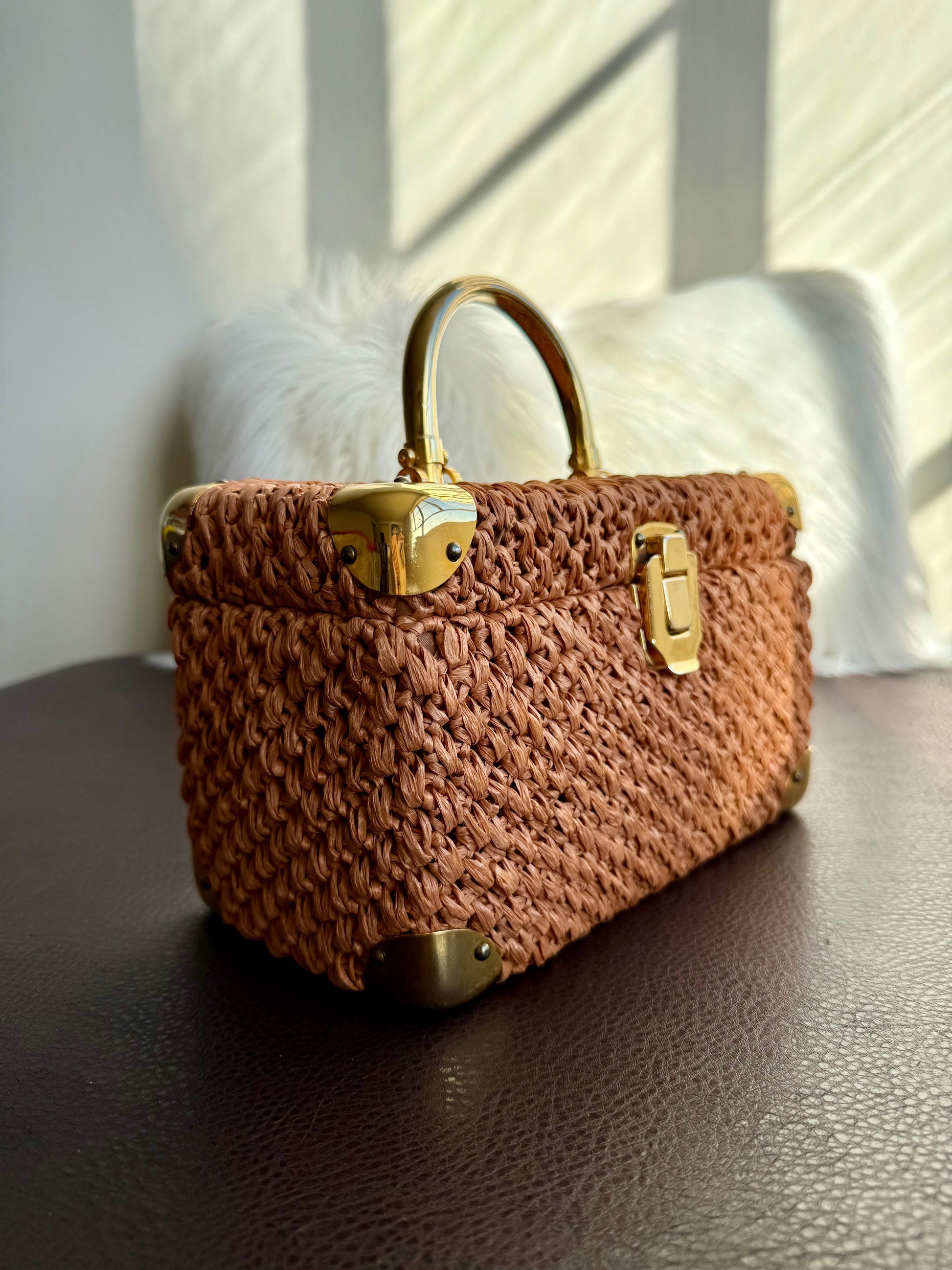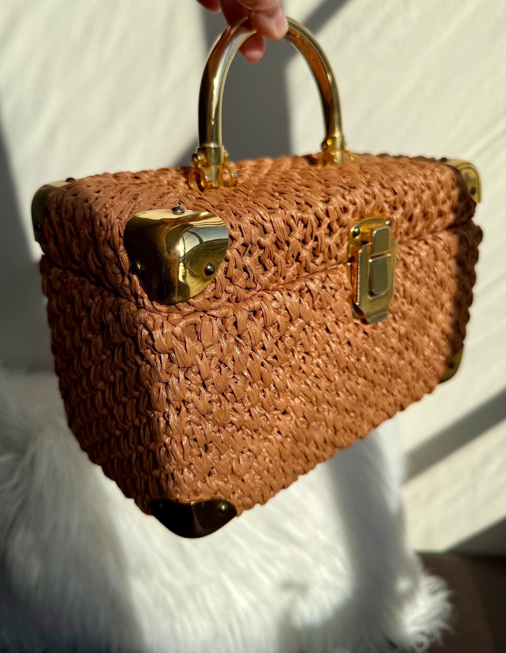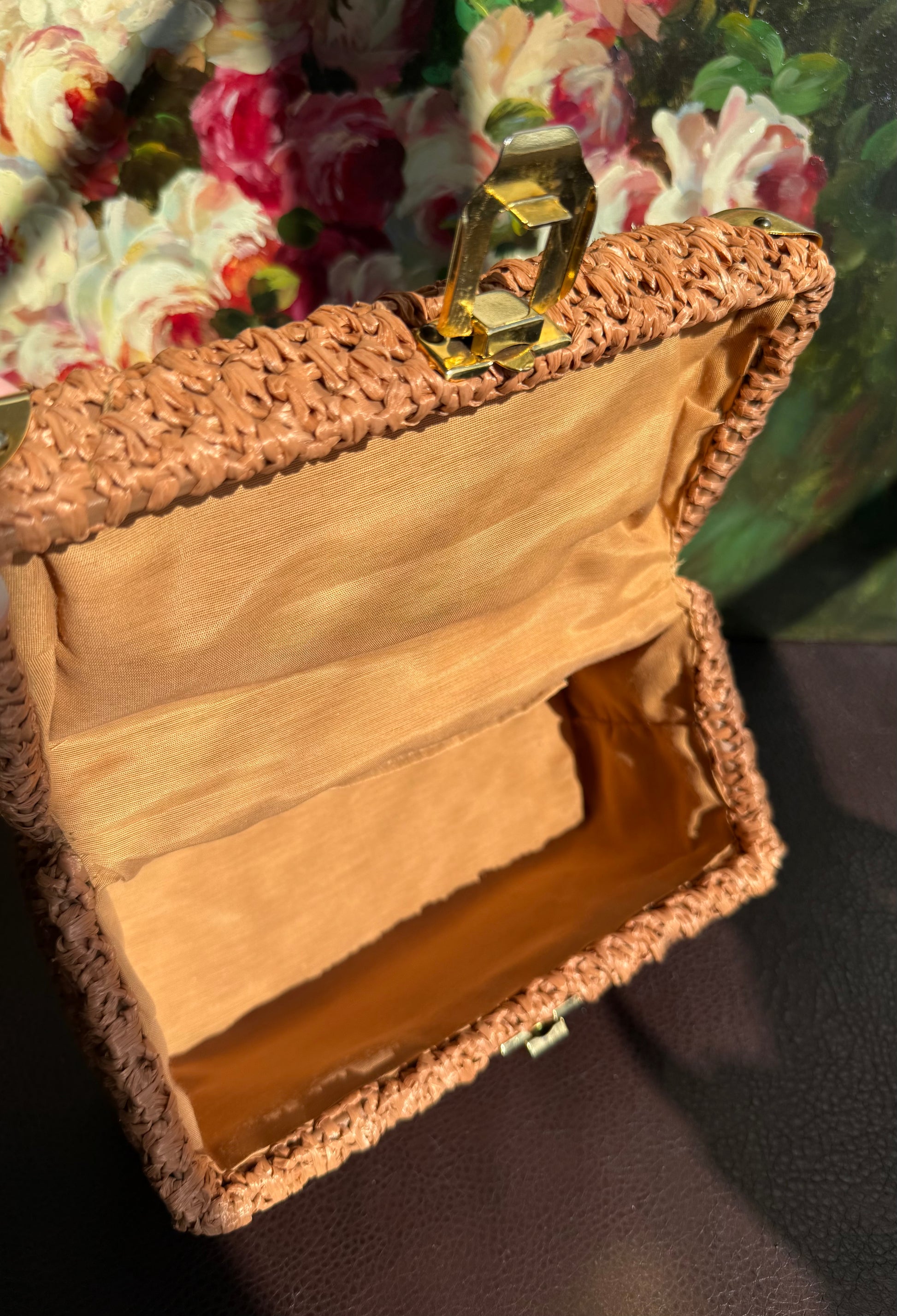 Italian Luxury Vintage Box Purse Mod Woven Raffia Brown Handbag, from the 50s or 60s